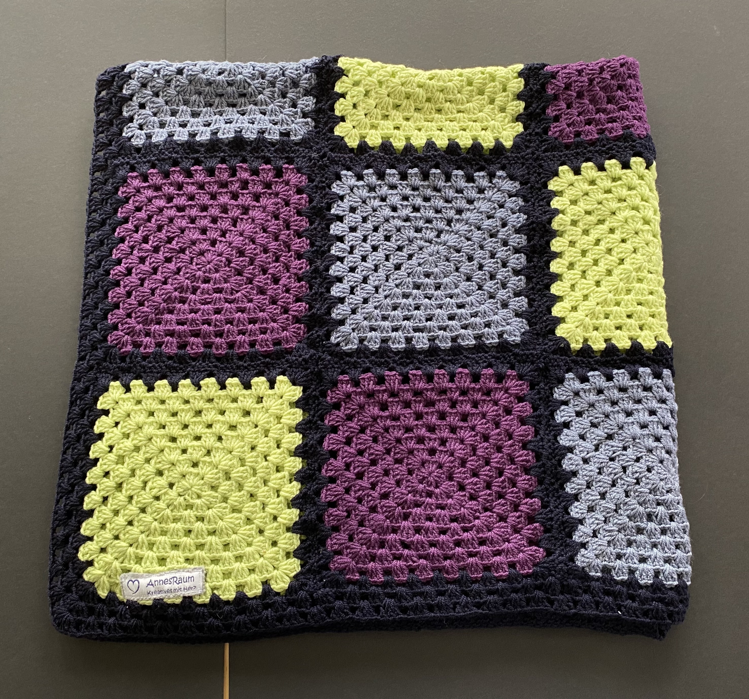 Sie ist in satten Farben (Lila, Hellgrün, grau und schwarz) mit Granny Square gehäkelt.