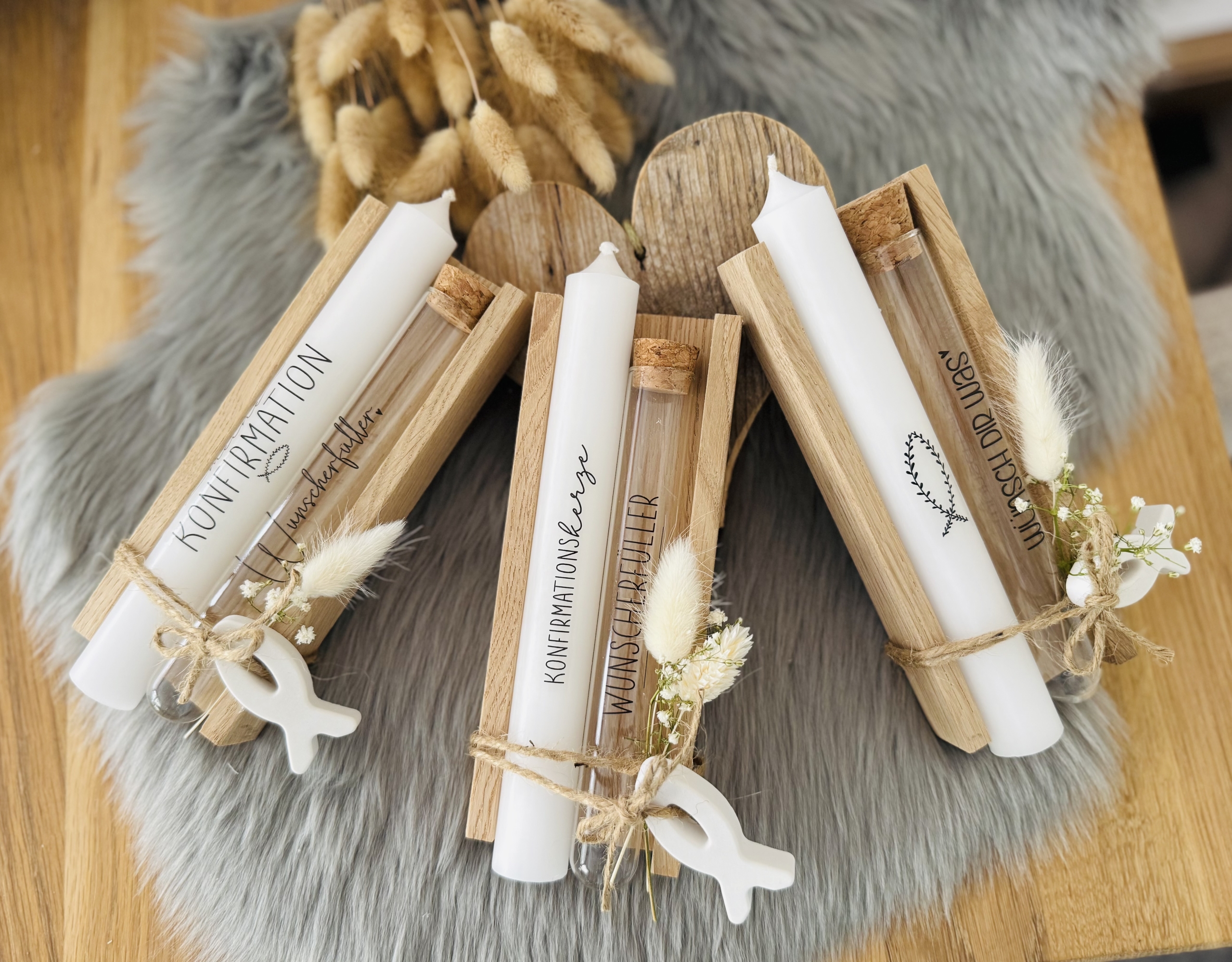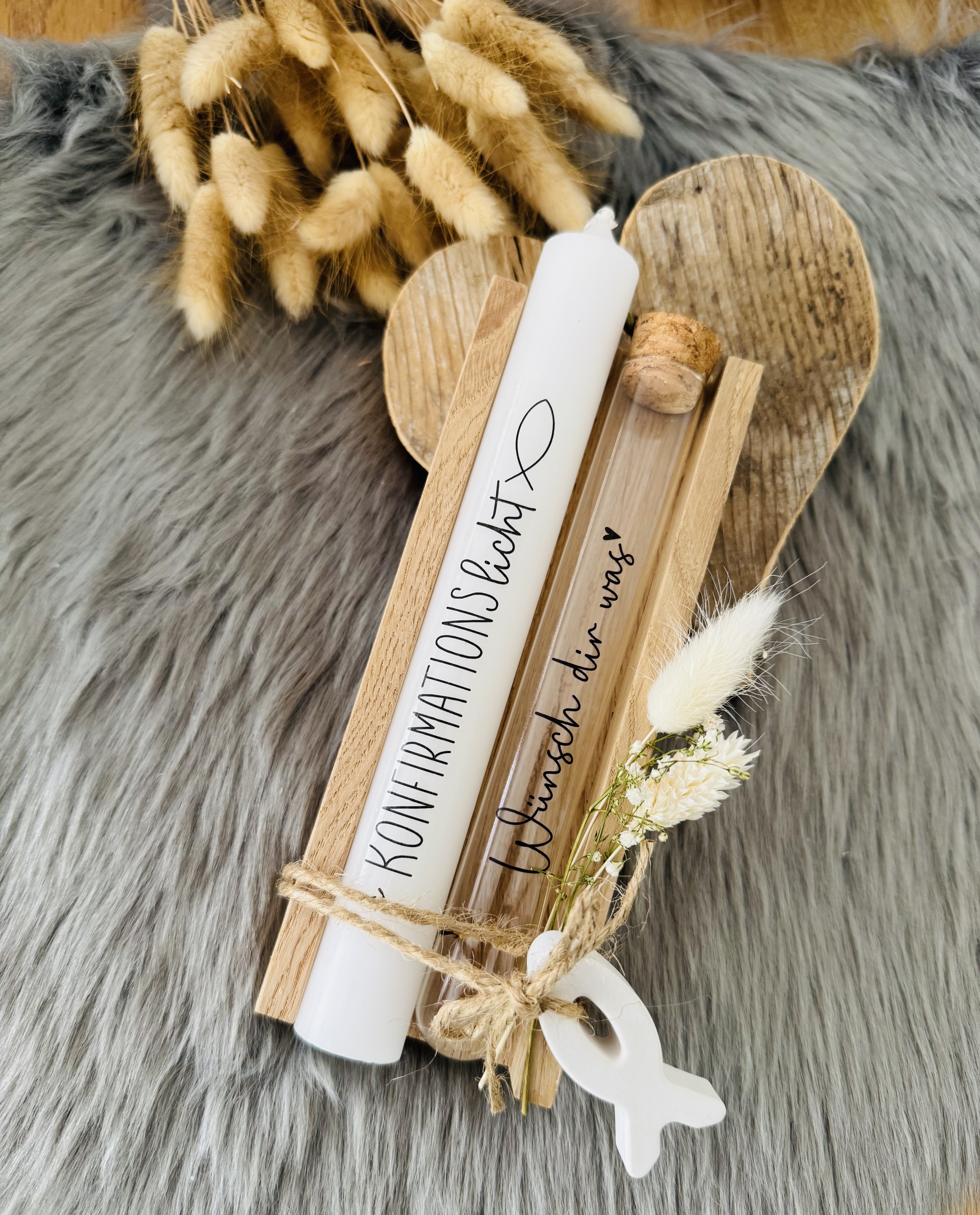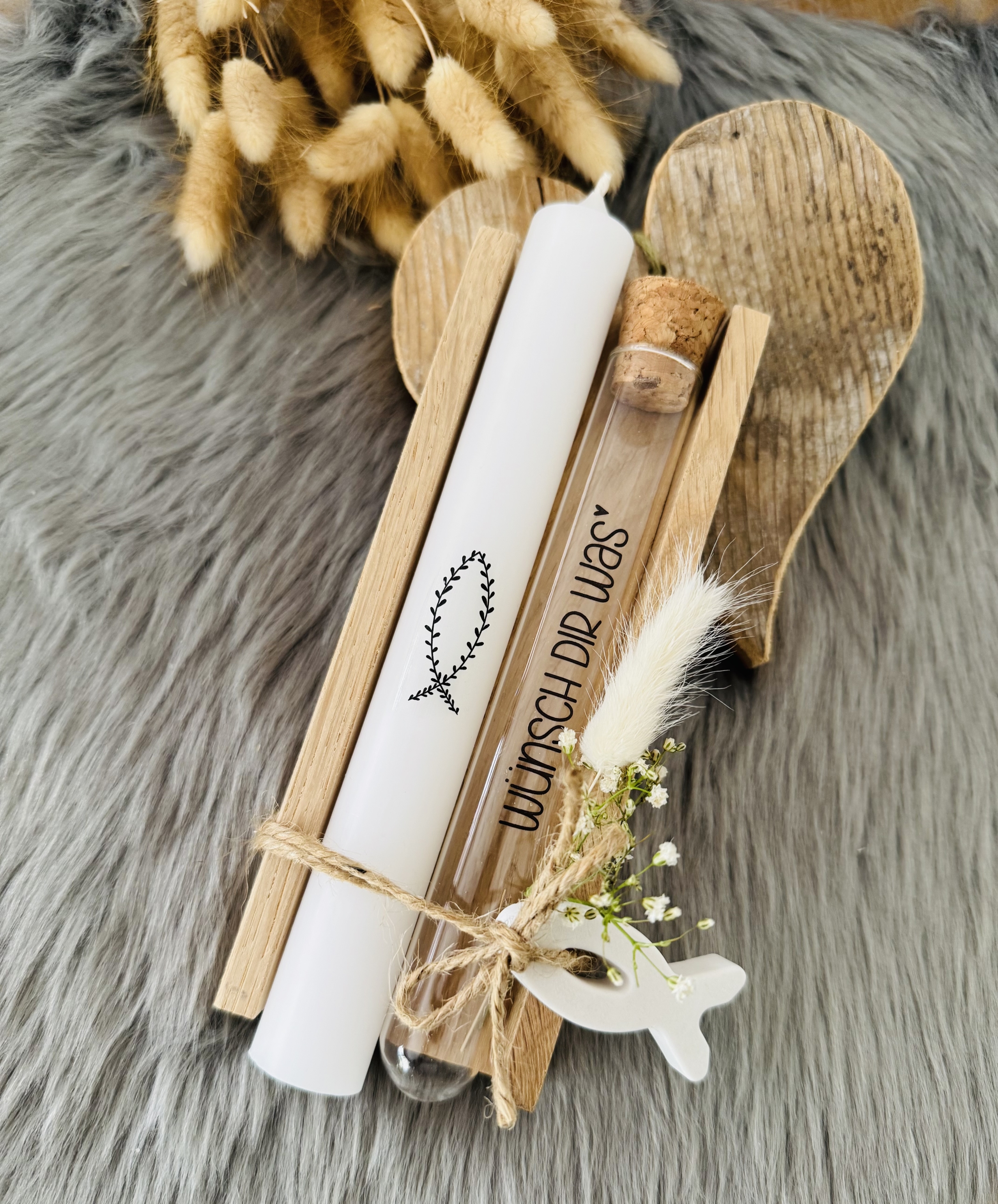Das Set wird individuell hergestellt. Beschriftung Kerze und Reagenzglas können von folgenden Vorschlägen ausgewählt werden: