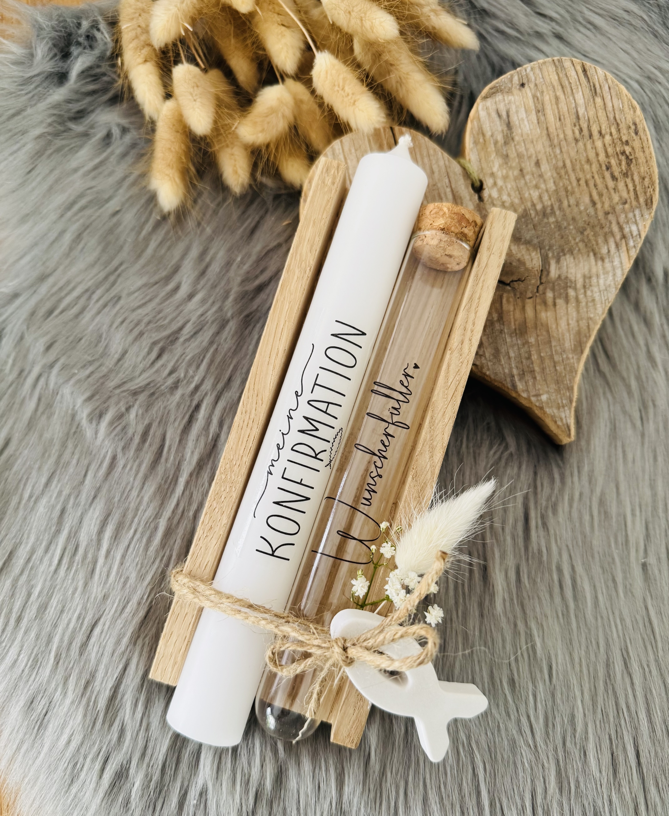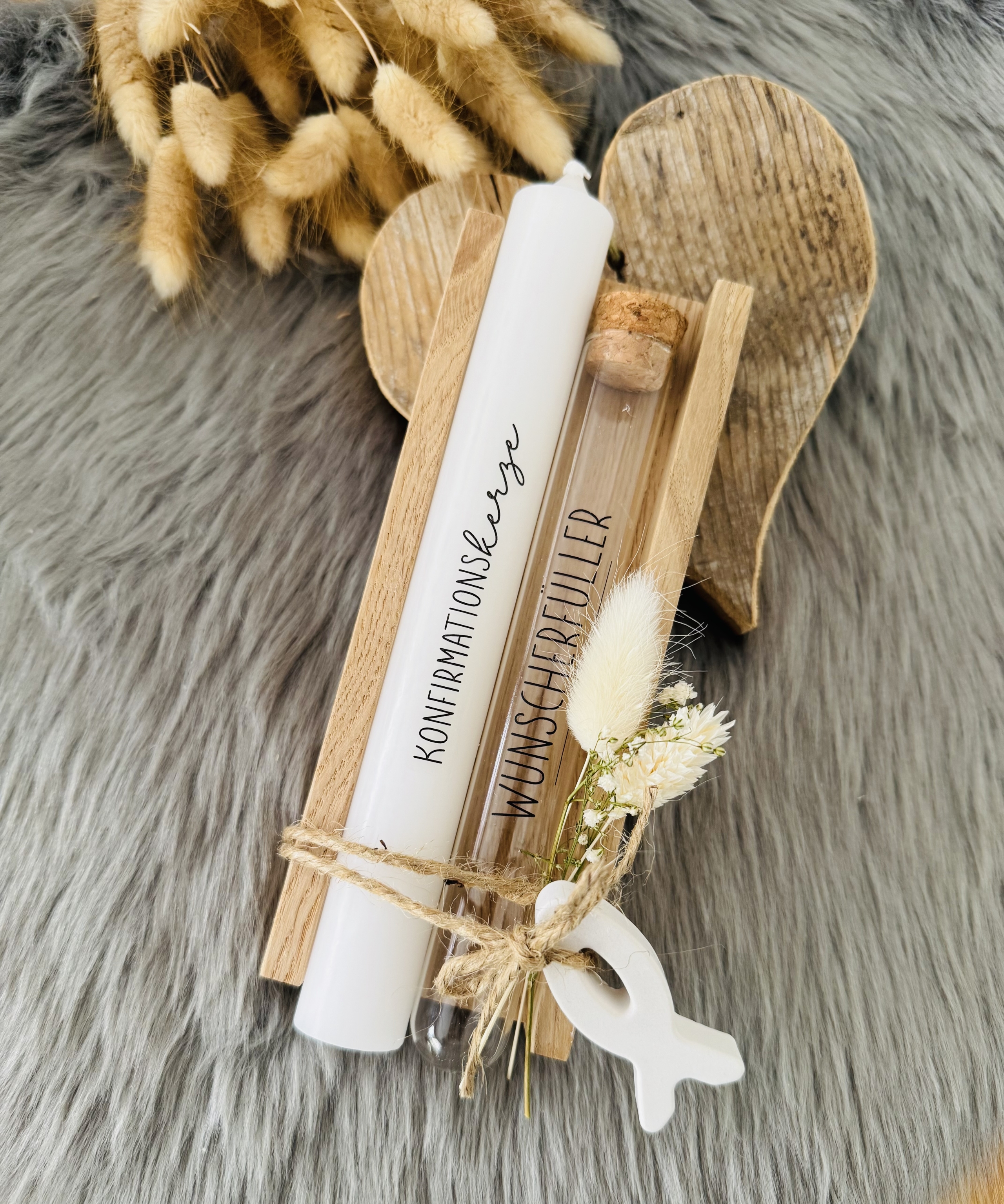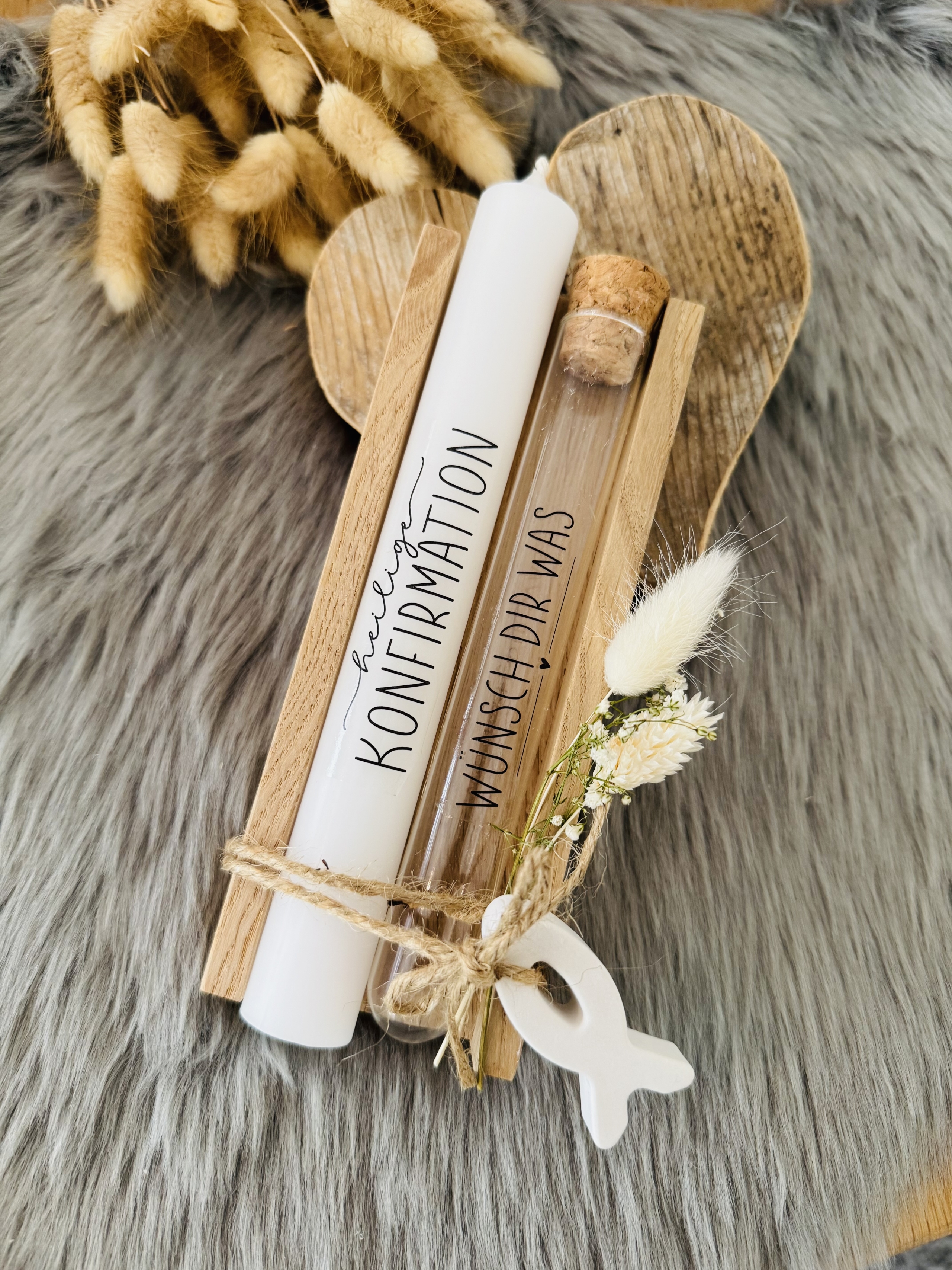 Das Set wird individuell hergestellt. Beschriftung Kerze und Reagenzglas können von folgenden Vorschlägen ausgewählt werden: