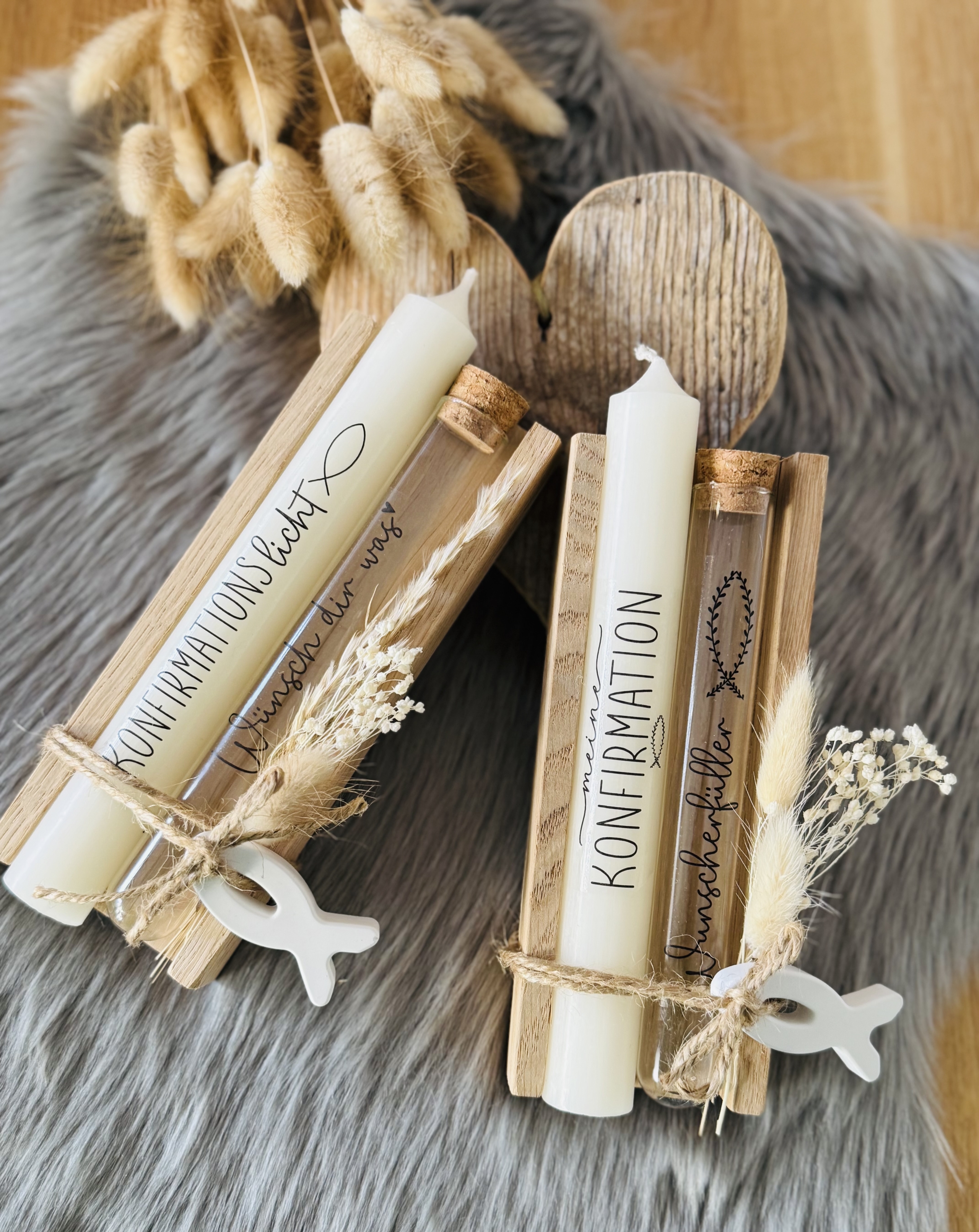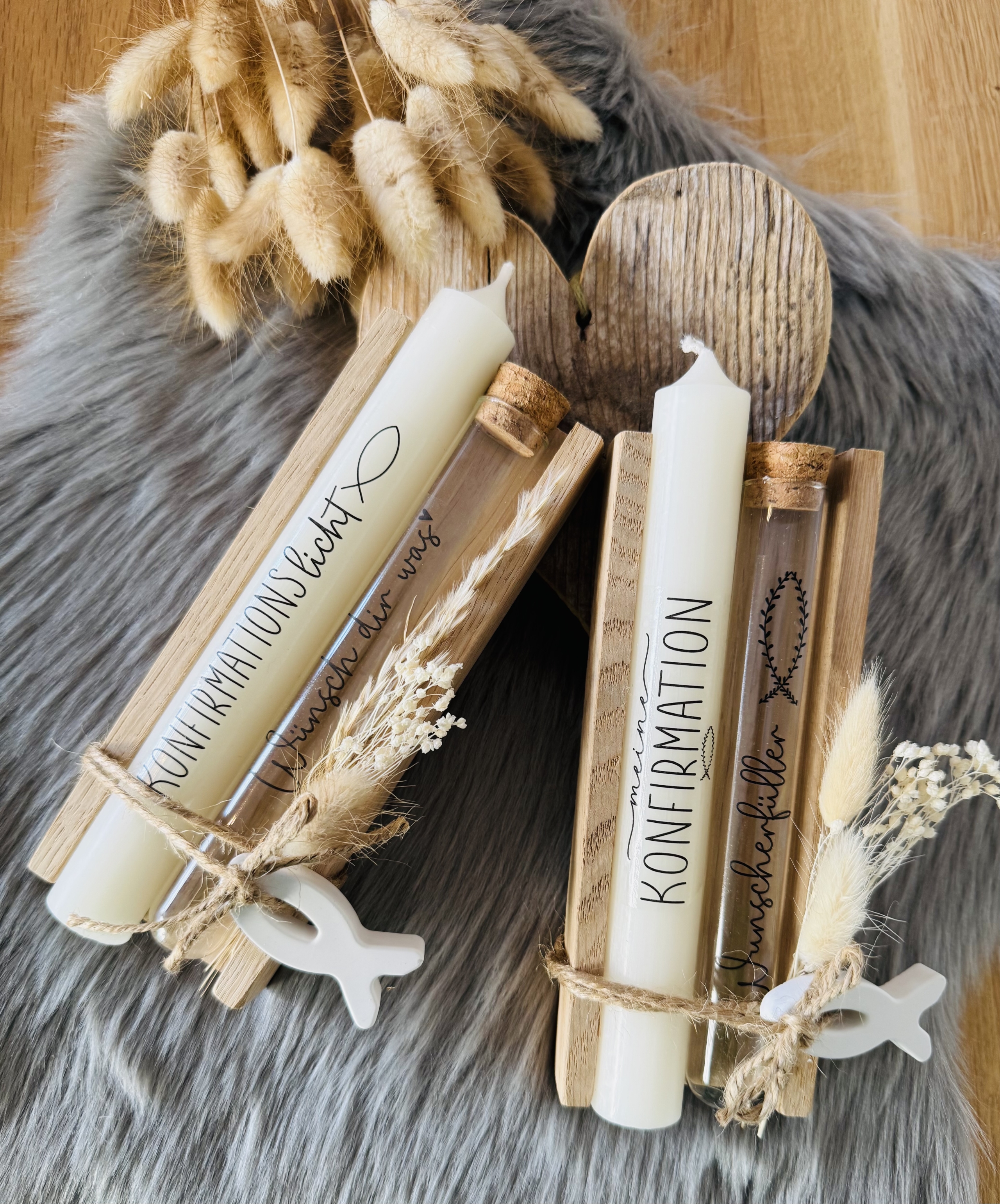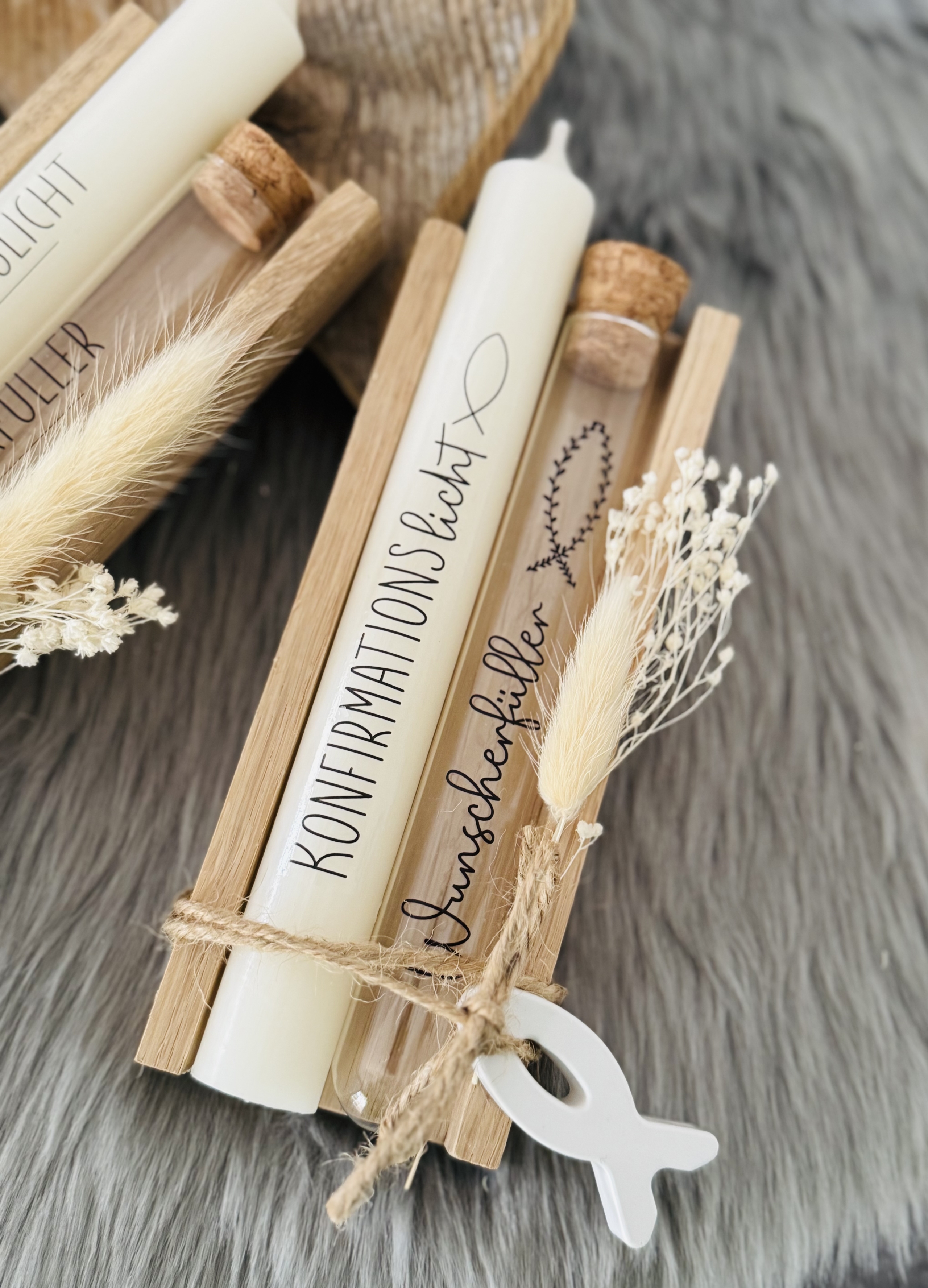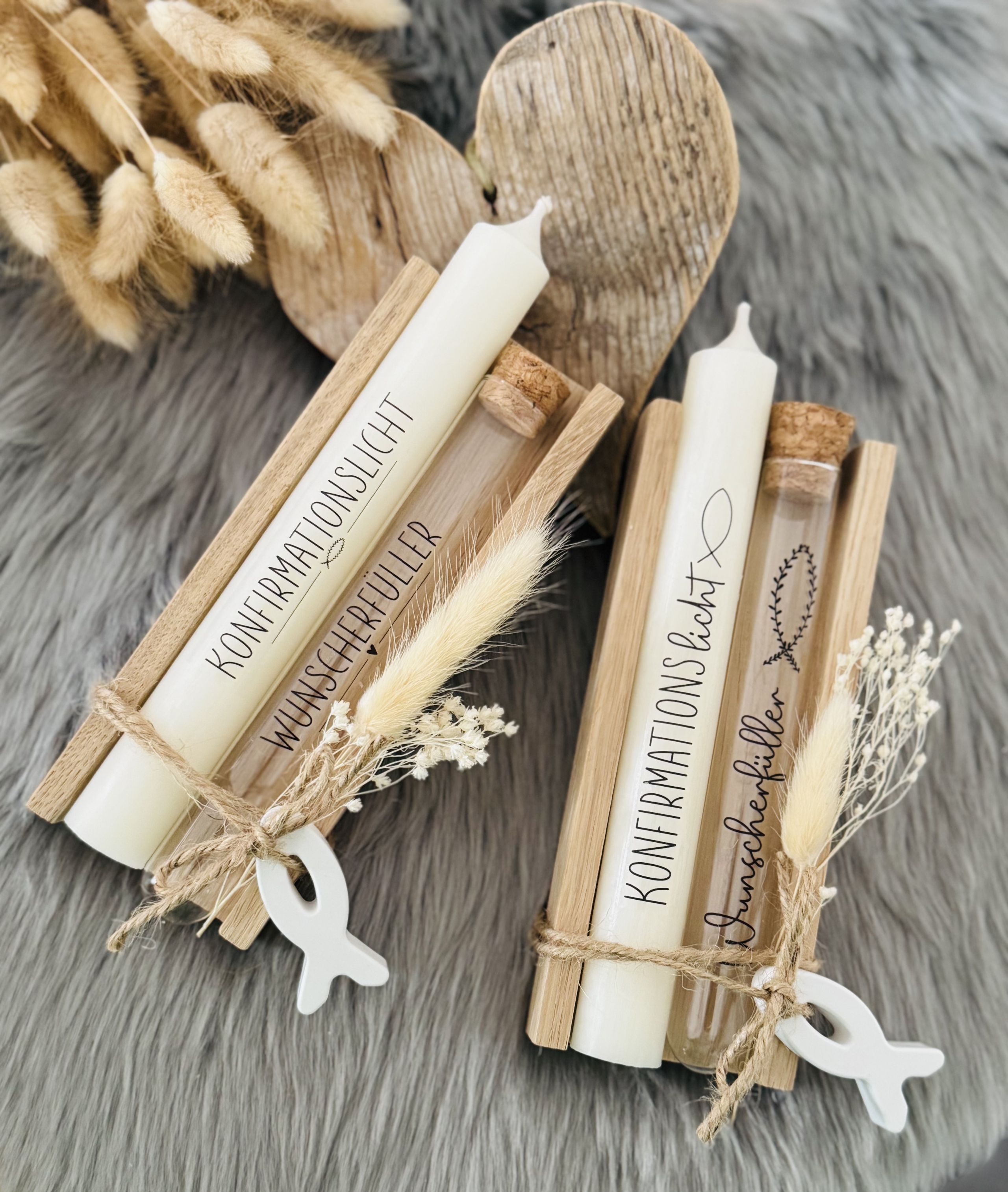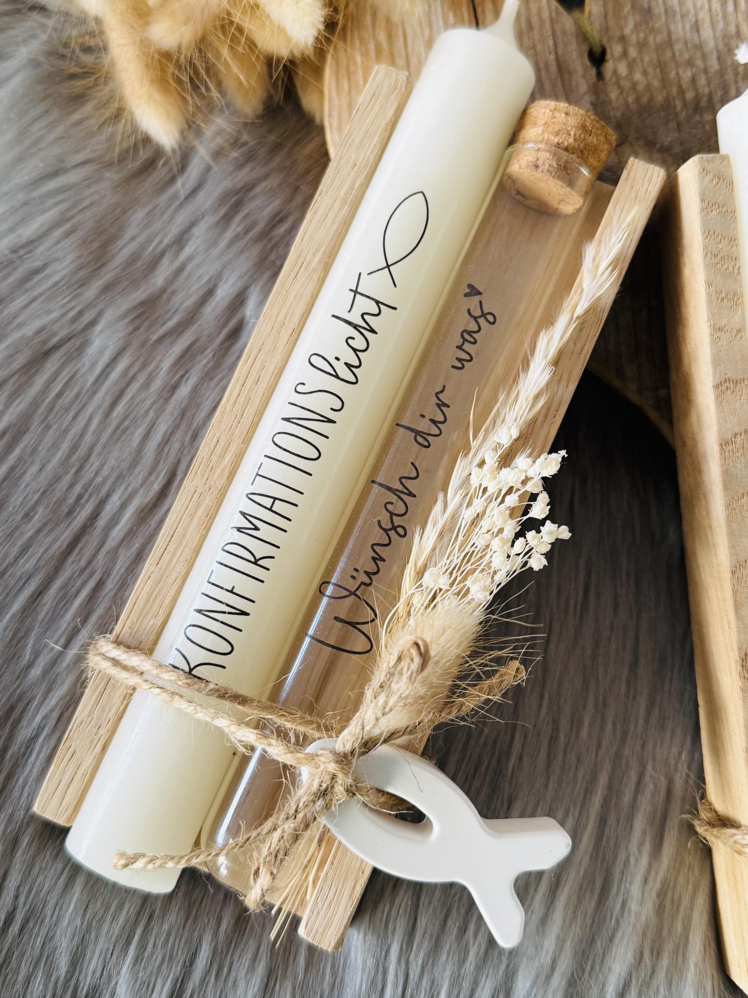 Das Set wird individuell hergestellt. Beschriftung Kerze und Reagenzglas können von folgenden Vorschlägen ausgewählt werden: