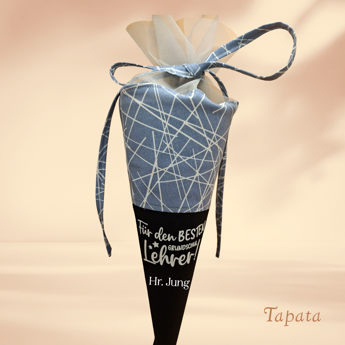 Als Highlight kann die Schultüte mit dem Namen der Lehrein / des Lehrers versehen werden.