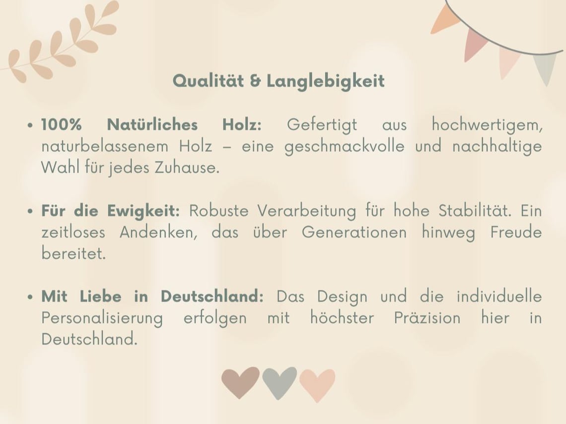 • Einzigartigkeit: Holz ist ein Naturprodukt. Leichte Abweichungen in Farbe, Maserung oder kleine Astlöcher unterstreichen den authentischen Handmade-Charakter.