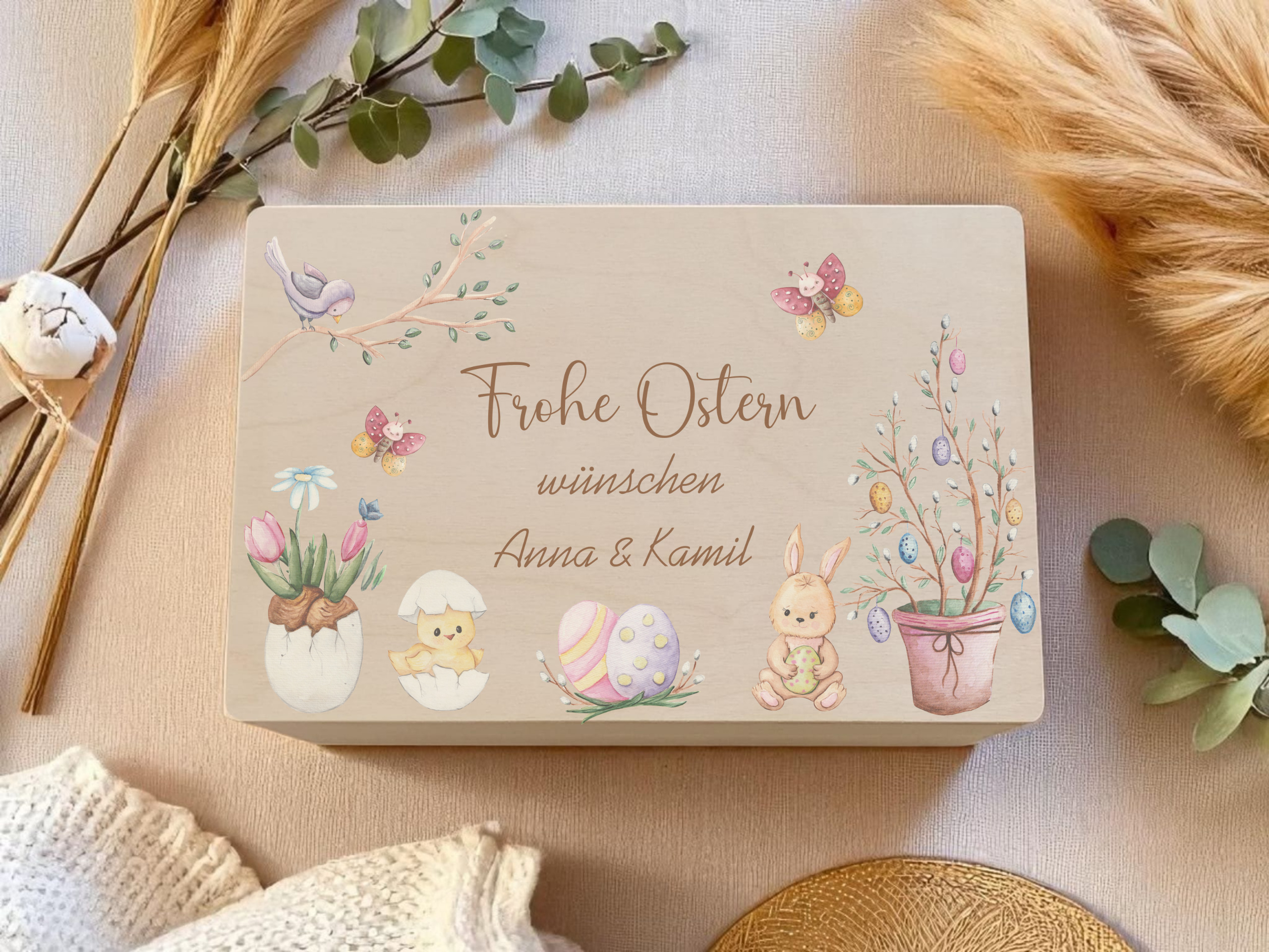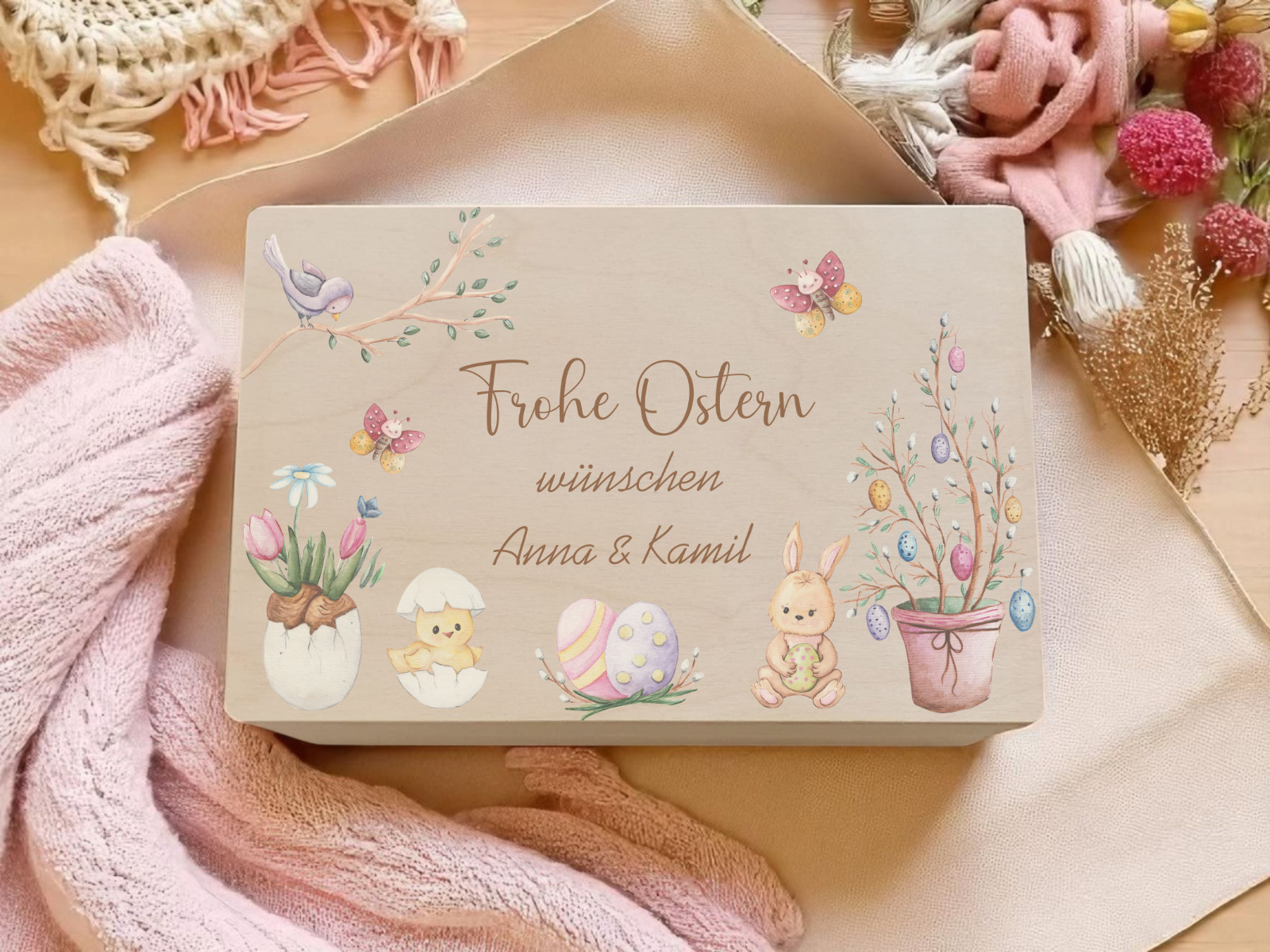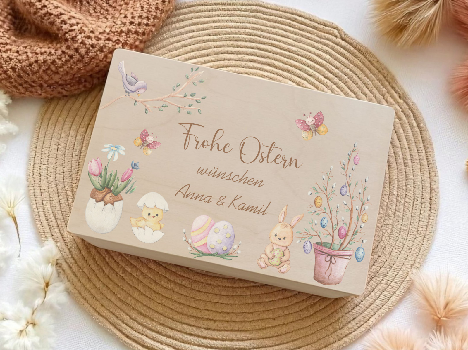 Die besondere Osterüberraschung für Groß und Klein: Verschenke eine personalisierte Oster-Holzkiste, liebevoll gestaltet mit einem klassischen Motiv aus Osterhase, bunten Eiern und frühlingshaften Elementen. Diese hochwertige Erinnerungsbox wird mit deinem individuellen Gruß „Frohe Ostern wünscht/wünschen [Name]“ zu einem ganz persönlichen Ostergeschenk. Ob als nachhaltiges Osternest, Geschenkbox oder bleibende Dekoration – dank präziser Veredelung bleibt dein Wunschdesign dauerhaft und edel auf dem Echtholz verewigt. ✨