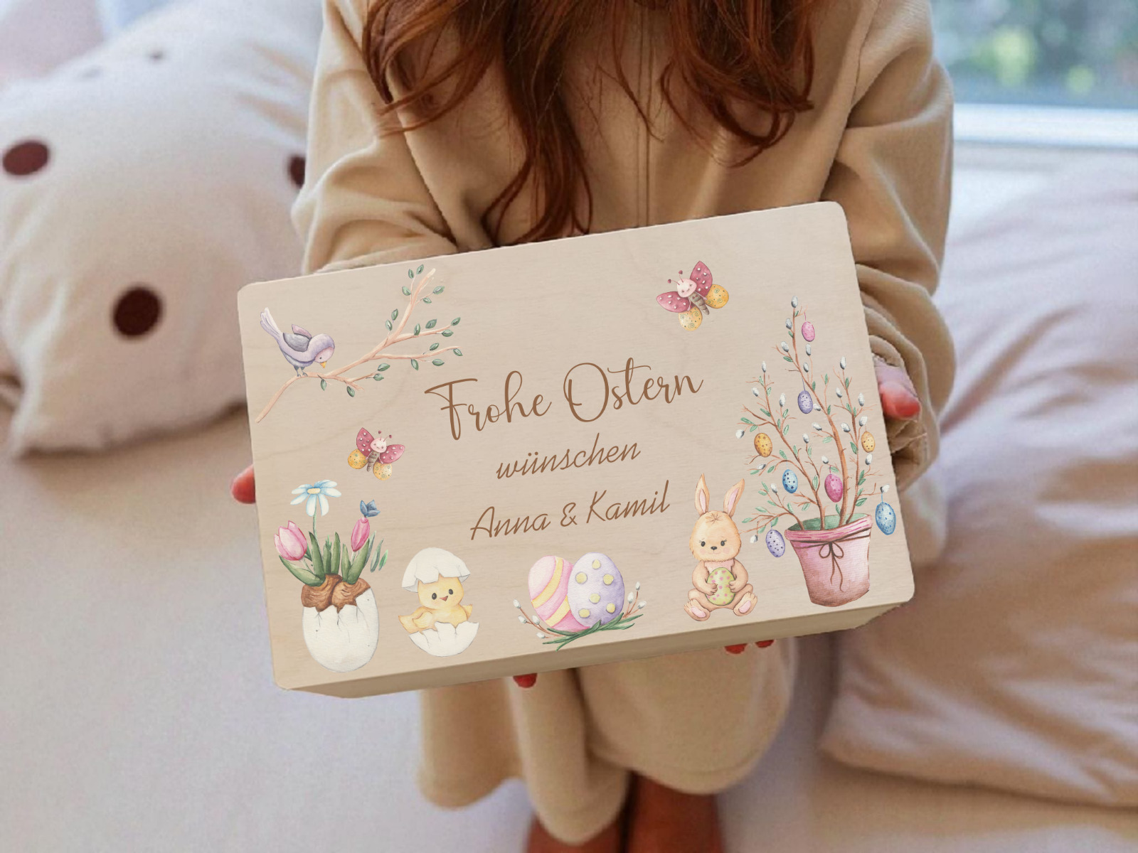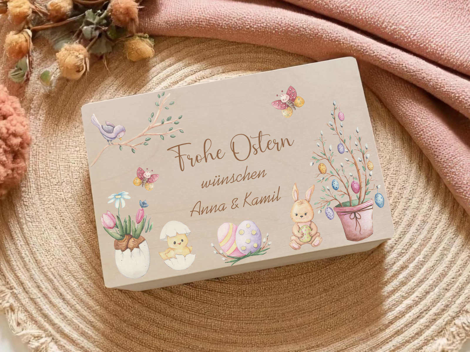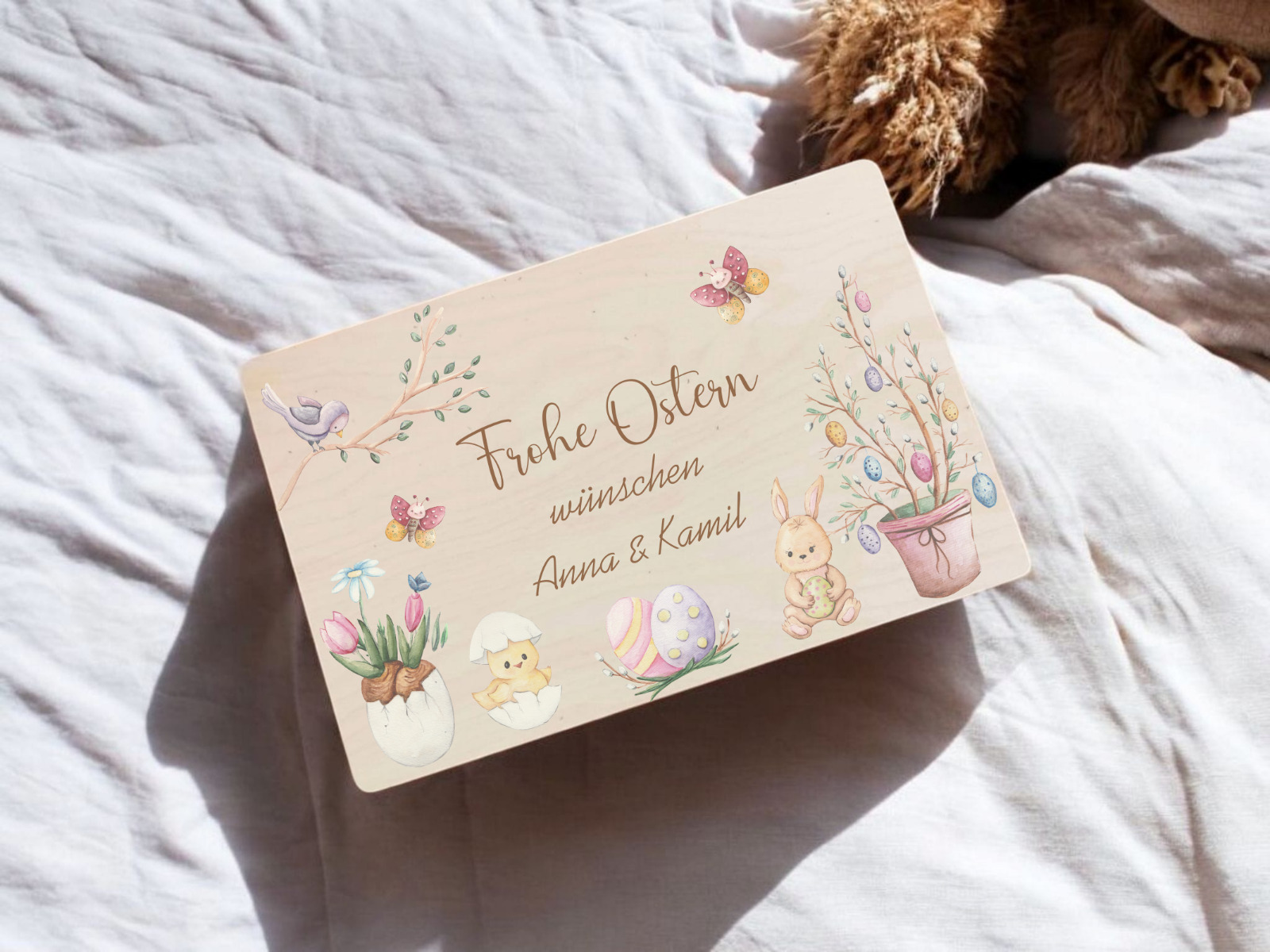 Die besondere Osterüberraschung für Groß und Klein: Verschenke eine personalisierte Oster-Holzkiste, liebevoll gestaltet mit einem klassischen Motiv aus Osterhase, bunten Eiern und frühlingshaften Elementen. Diese hochwertige Erinnerungsbox wird mit deinem individuellen Gruß „Frohe Ostern wünscht/wünschen [Name]“ zu einem ganz persönlichen Ostergeschenk. Ob als nachhaltiges Osternest, Geschenkbox oder bleibende Dekoration – dank präziser Veredelung bleibt dein Wunschdesign dauerhaft und edel auf dem Echtholz verewigt. ✨