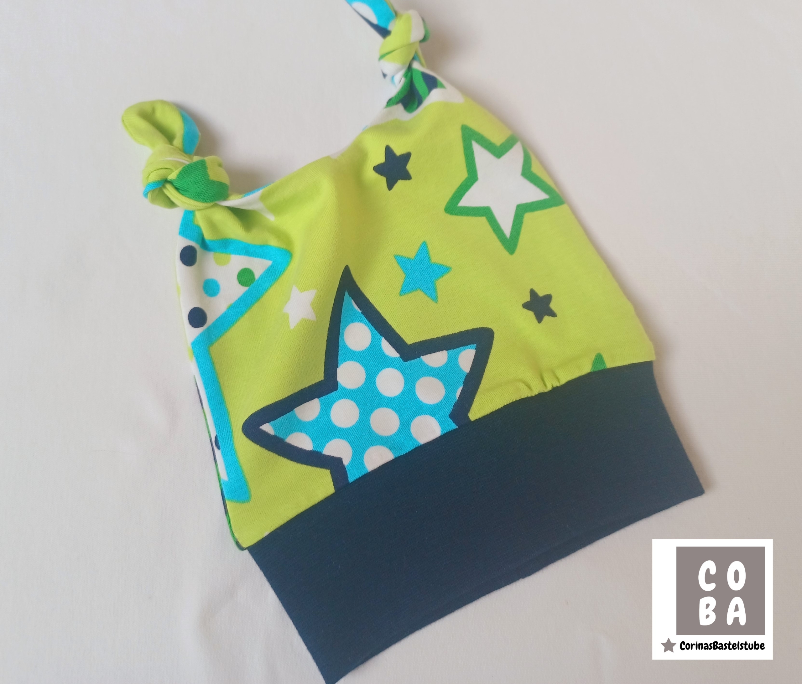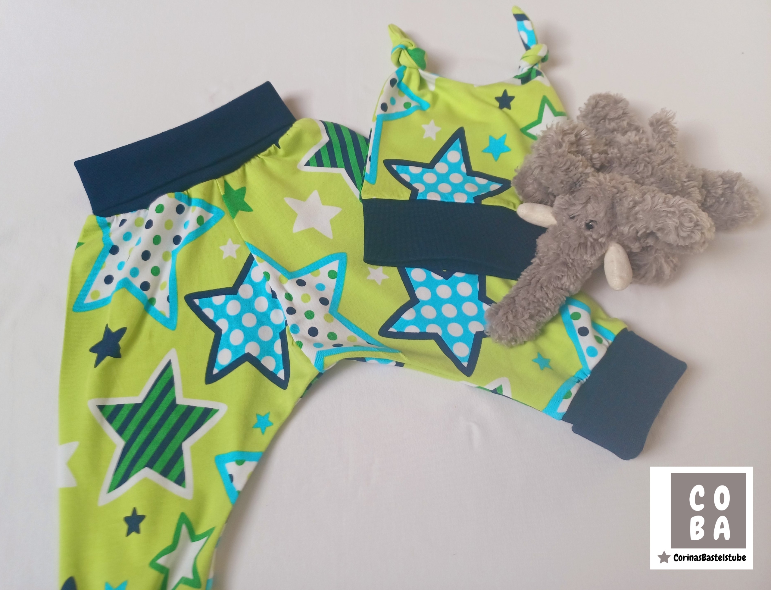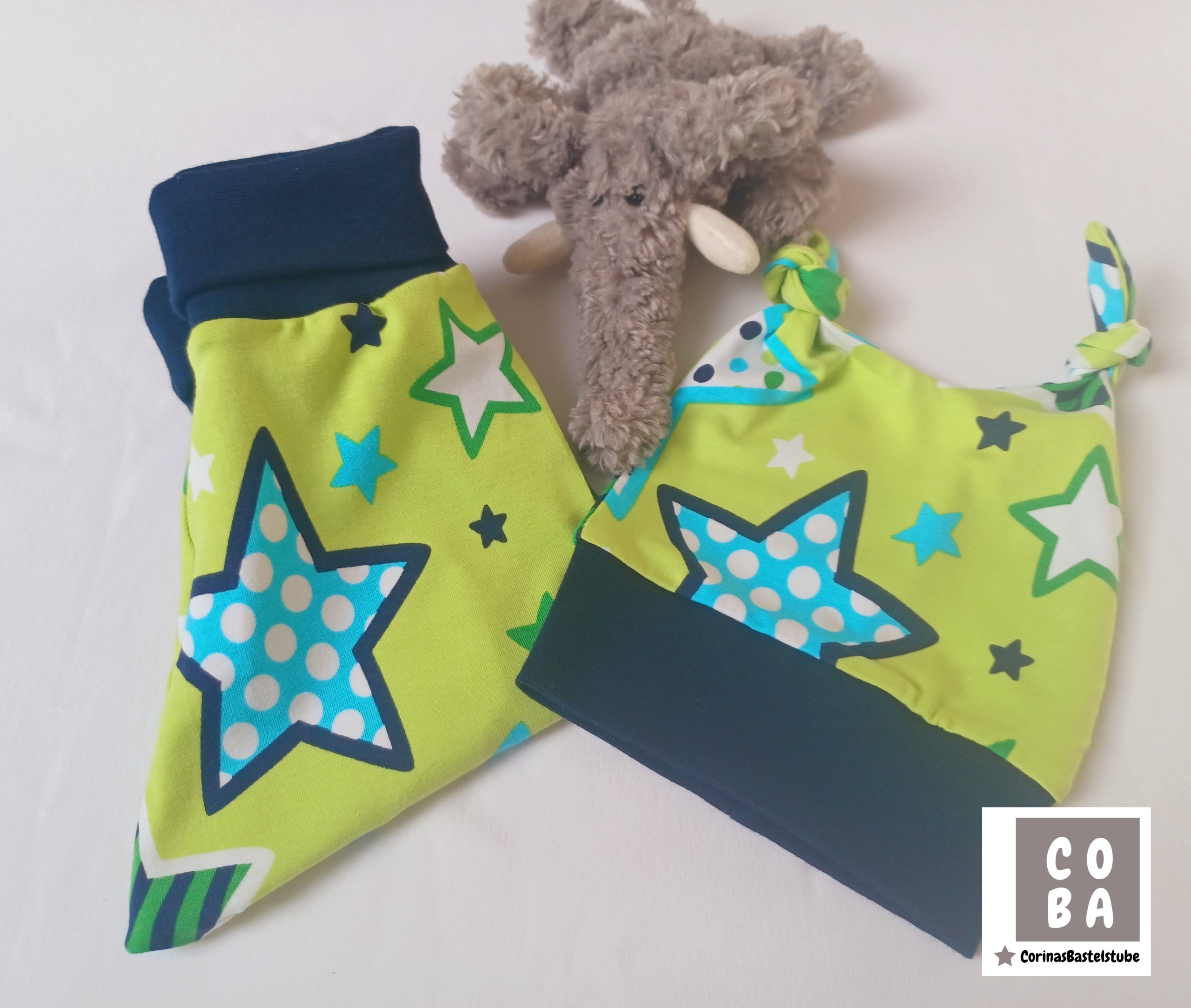 Dieses handgemachte Babyset in grün und mit Sternen in Blautönen ist ein echter Hingucker und perfekt für die ersten Monate.