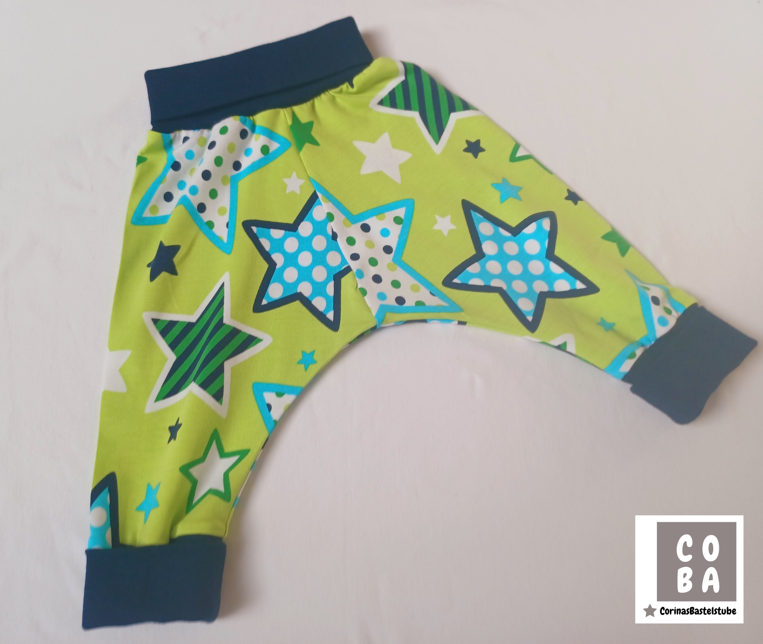 Babyset grün mit Sterne in Blautönen – Pumphose und Mütze (Gr. 62/68)