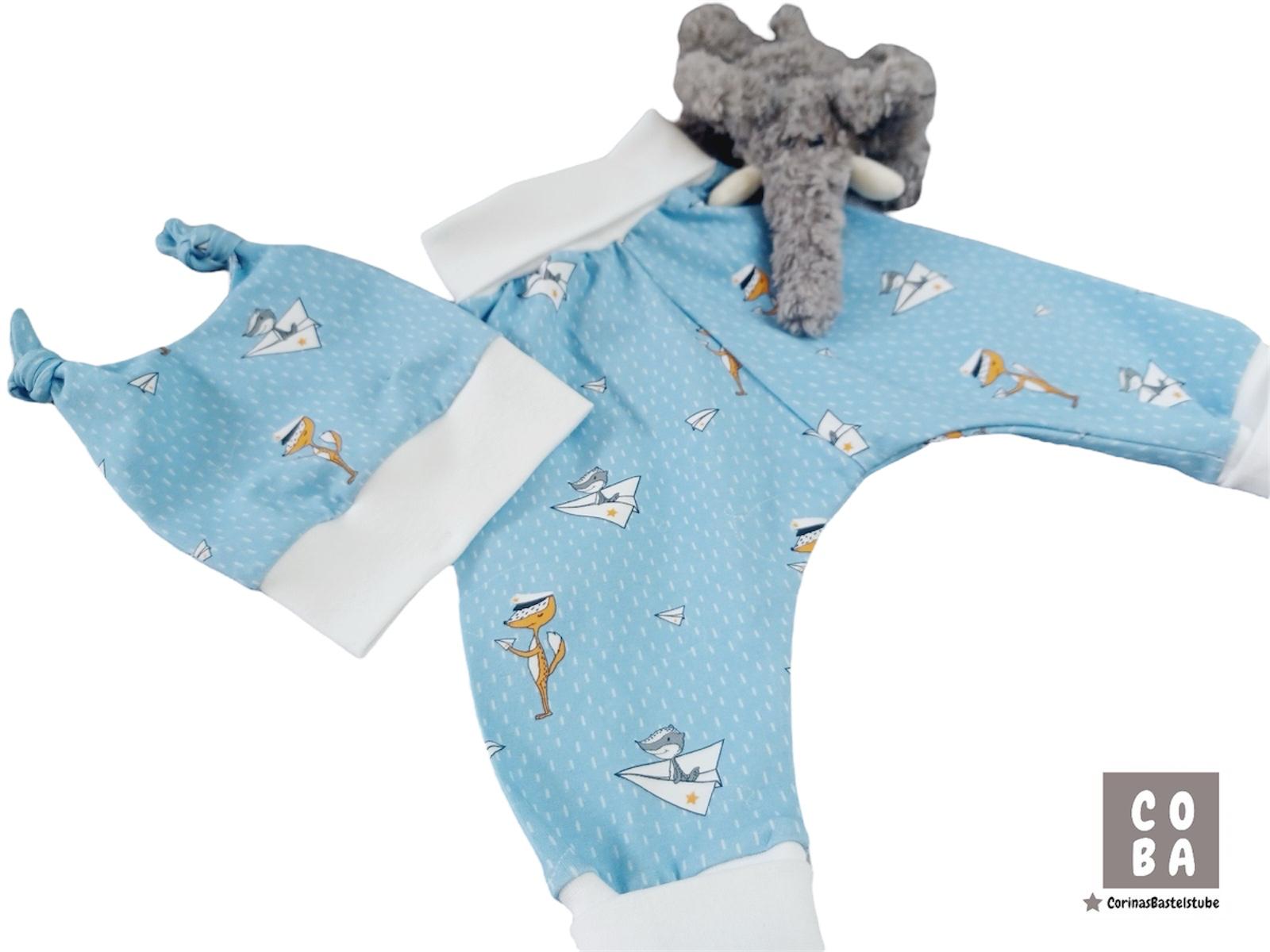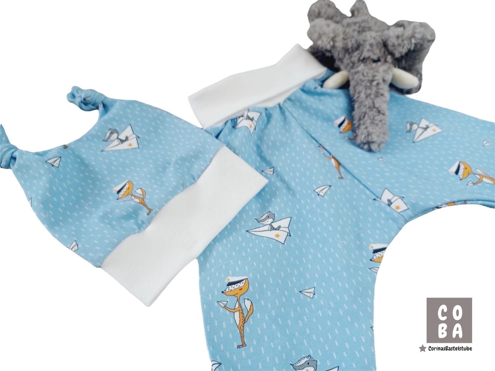 Dieses handgemachte Babyset in hellblau und weiß mit niedlichen Füchsen, Dachsen und kleinen Papierfliegern ist ein echter Hingucker und perfekt für die ersten Monate.