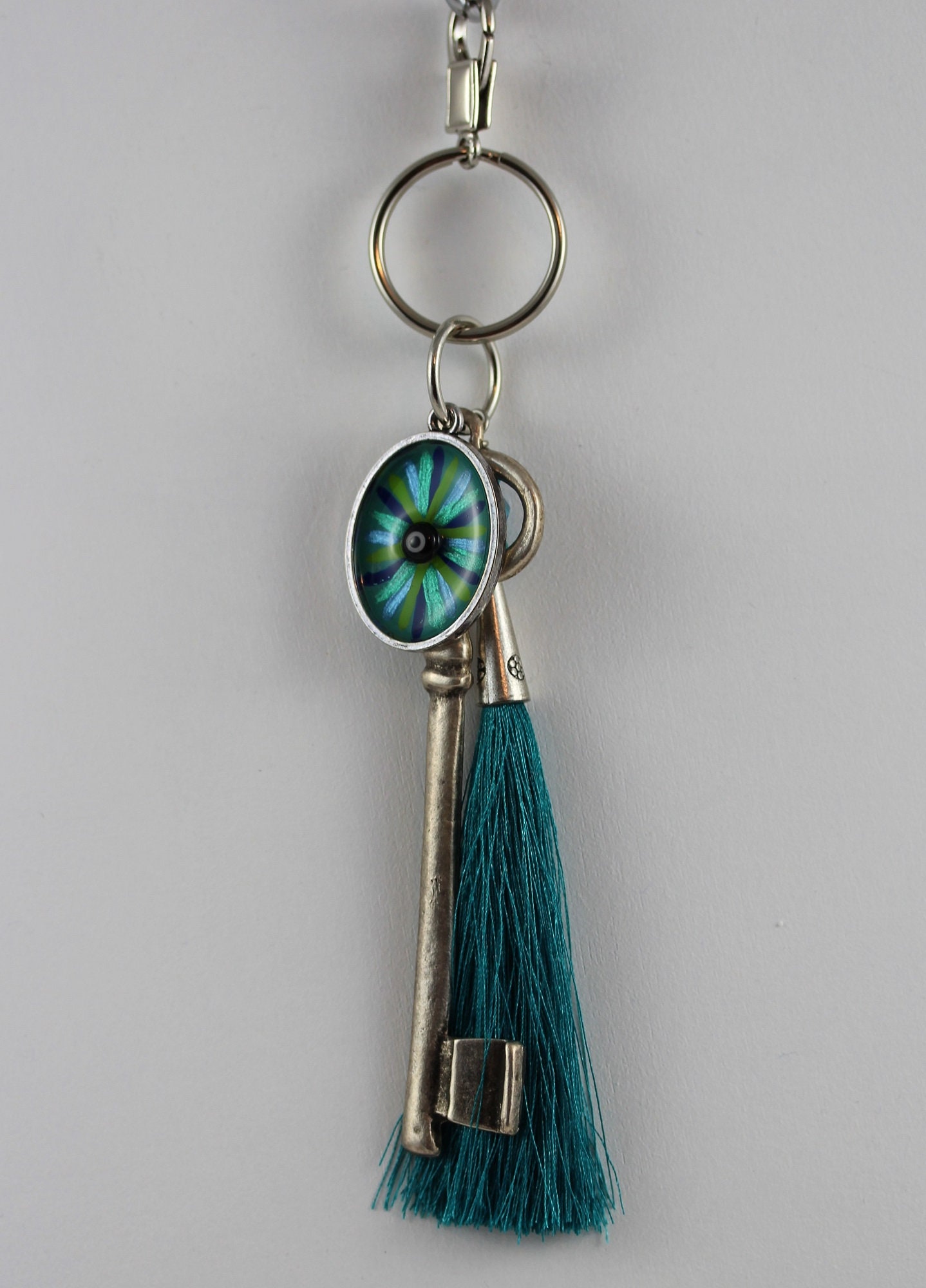 Das Material ist antik silberfarbenes Metall, das Eye of Hilarion Glücksbringer Auge ist handgemalt und kunstharzversiegelt, die Quaste aus Seidengarn, geschmückt mit Glasperlen. Das Auge mißt 2 x 3 cm, der Schlüssel 10,5 cm und der Anhänger hat eine Gesamtlänge von 12,5 cm.