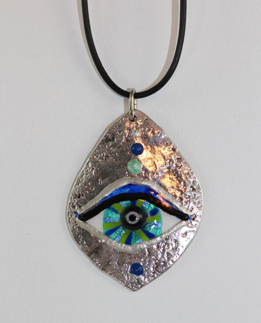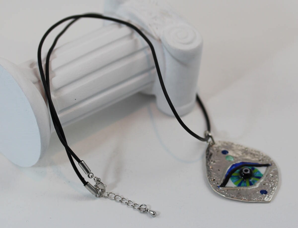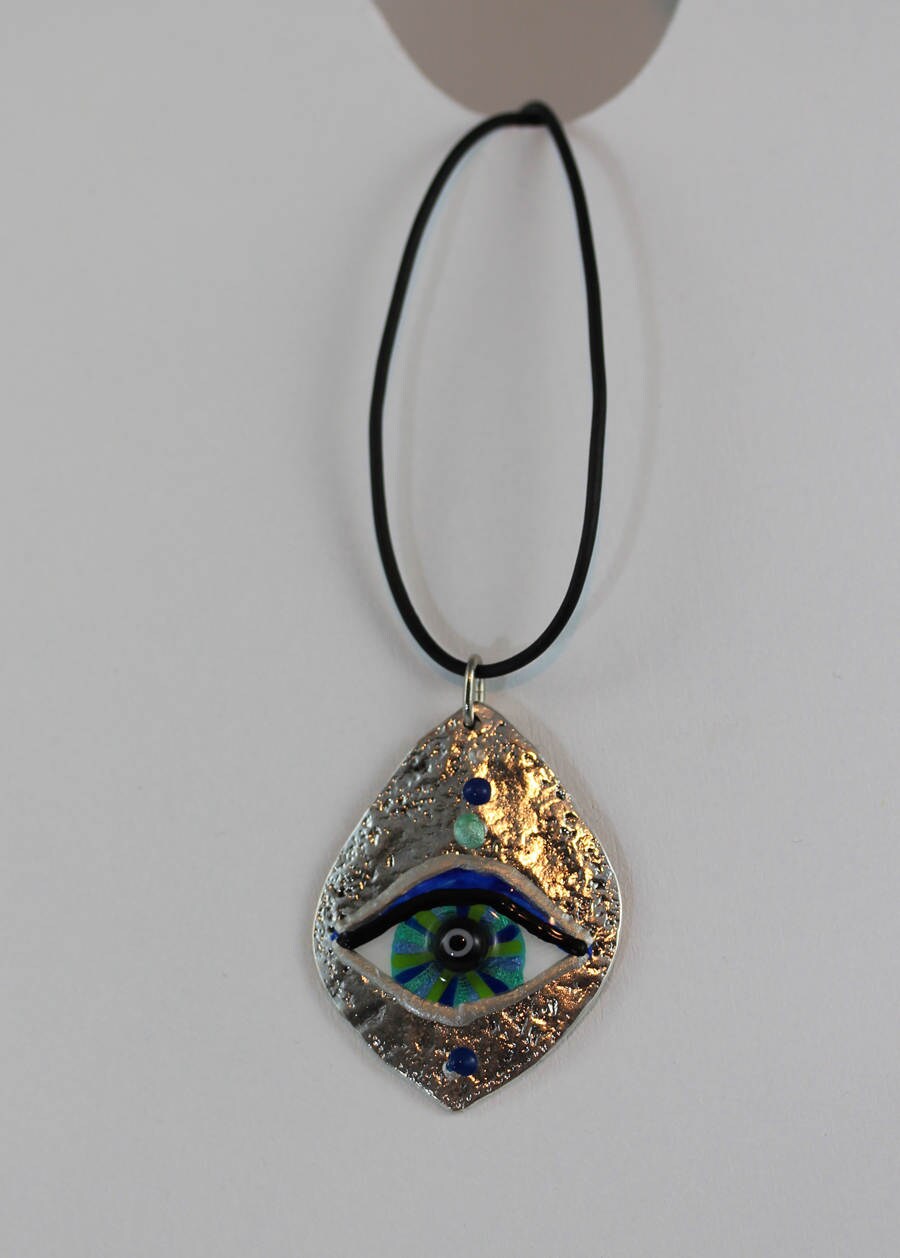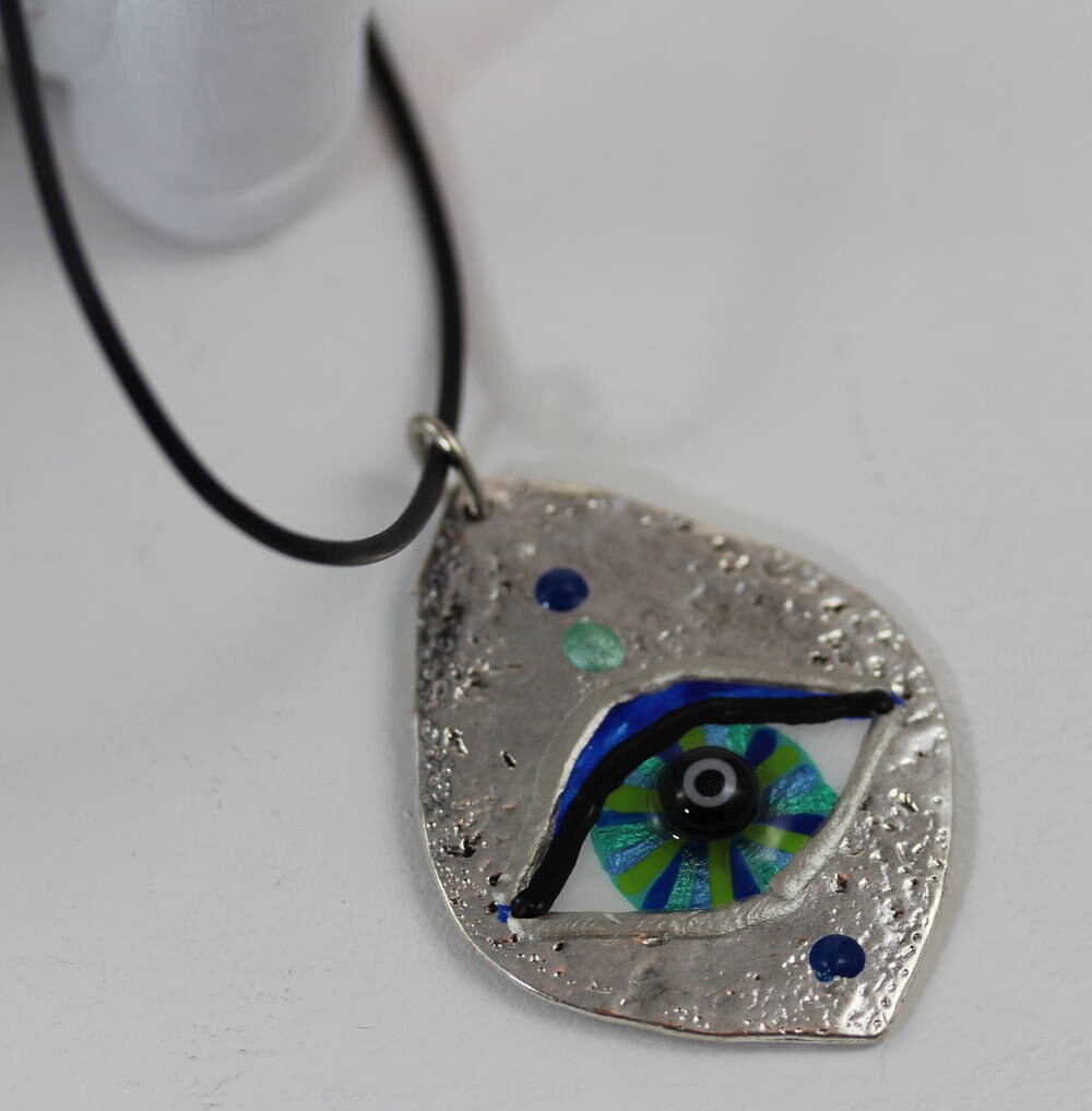 Das Eye of Hilarion Glücks-Auge ist handgemalt auf einen altsilberfarbenen tropfenförmigen Anhänger.