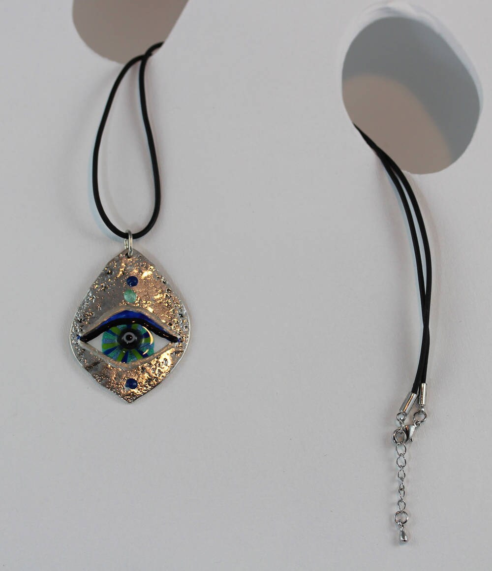 Der Anhänger ist aus altsilberfarben legiertem Metall, handbemalt und mit einer kleinen Talismanperle belegt, kunstharzversiegelt, die Kordel aus Kautschuk, verlängerbar durch ein kleines Kettchen an der silberfrabenen Metallschließe. Die Maße des Anhängers sind 35 x 45 cm, die Kautschukkordel hat eine Länge von 40 cm + Verlängerungskettchen.
