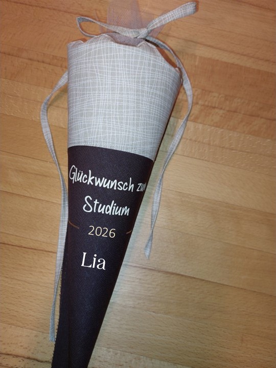 Angeboten wird eine kleine Schultüte mit einem passenden Spruch zum Studium, Studium Abschluss oder Berufsstart.