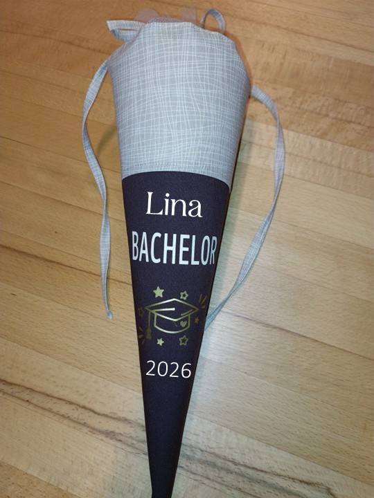 ➡ Namenswunsch: Auf Wunsch kann die Abschlusstüte mit dem Namen der Person versehen werden. Bitte geben Sie in das Feld Personalisierungswünsche den Namen ein. Max. 12 Zeichen (Sonderzeichen nur nach Rücksprache). Je nach Länge wird die Positionierung des Namens und die Größe angepasst.
