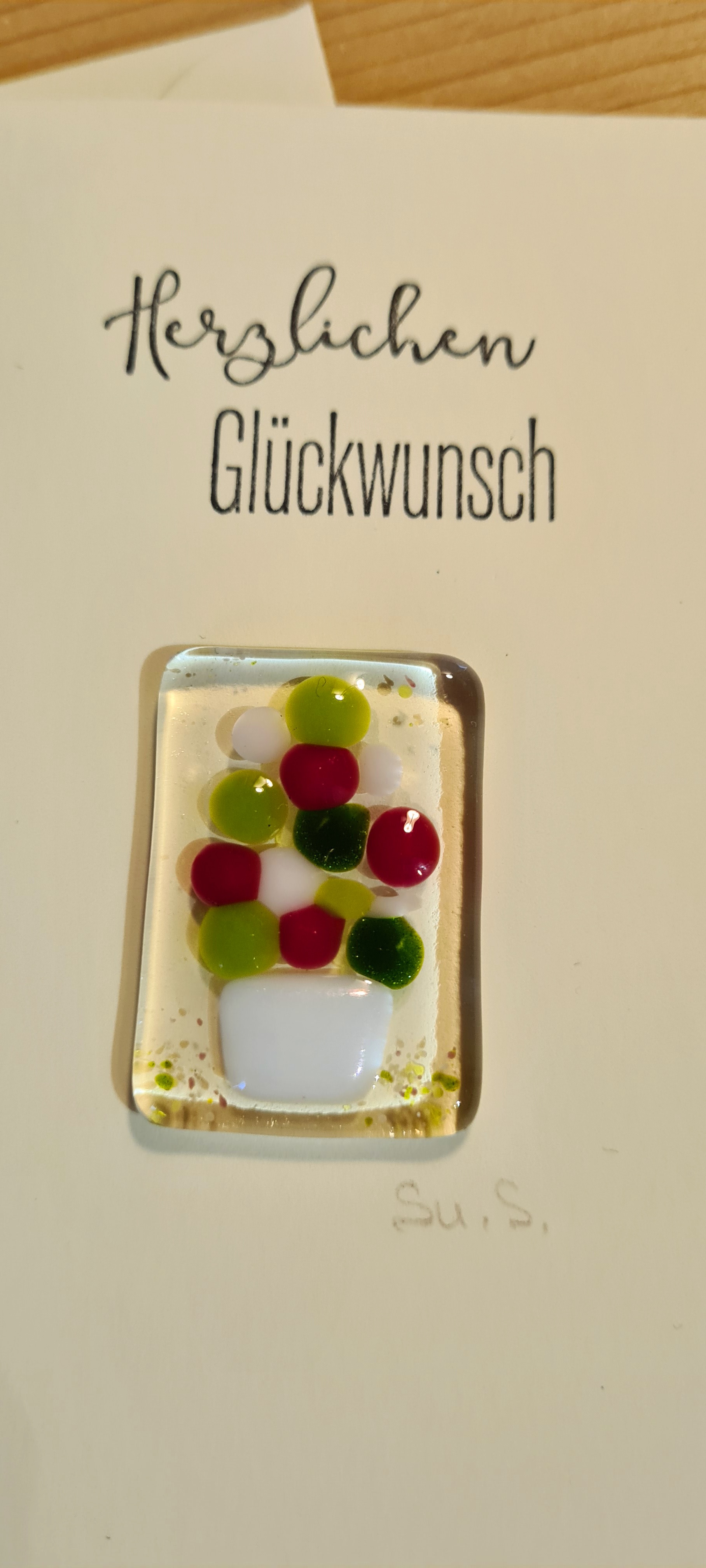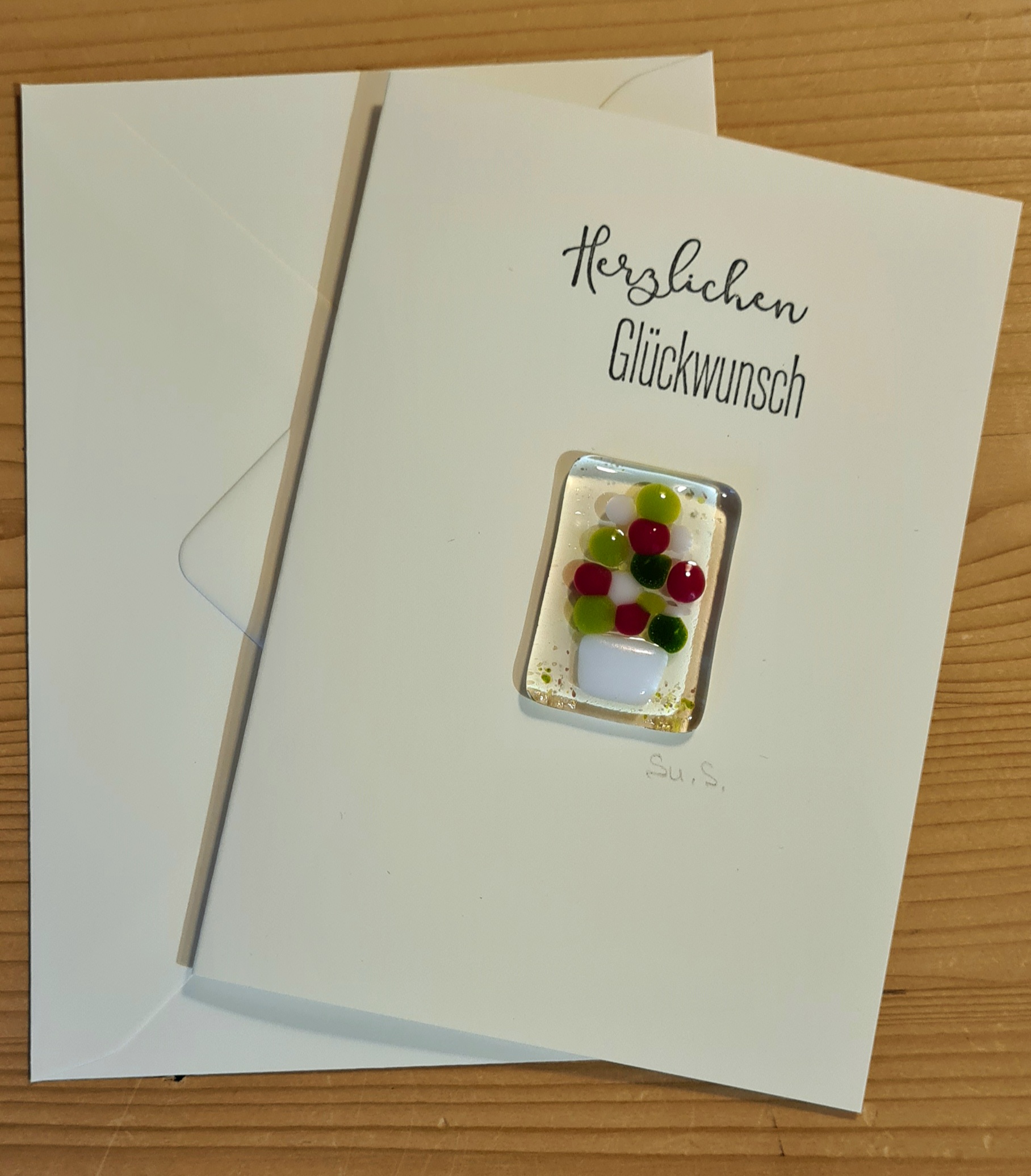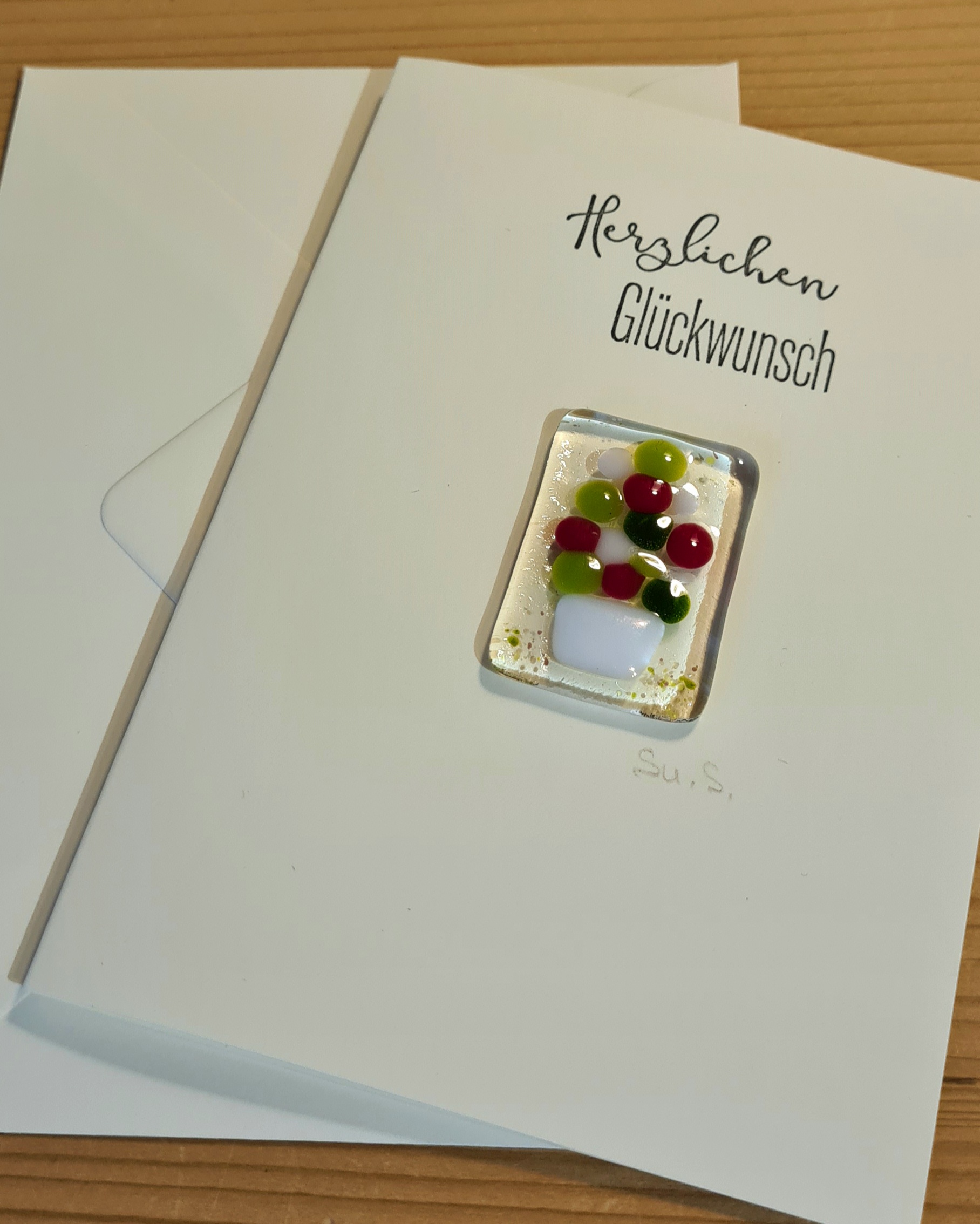 Eine Grußkarte, geschmückt mit einem kleinen Glasbild aus eigener Herstellung.