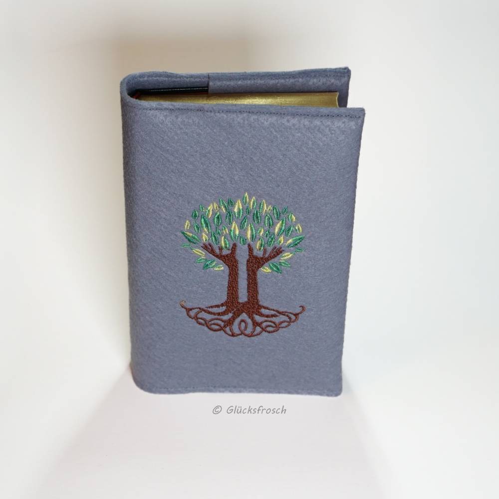 Die Gotteslobhülle ist aus grauem Filz gearbeitet, bestickt ist sie mit einem Lebensbaum. Die grünen Blätter werden von Ästen die wie Hände aussehen getragen.
