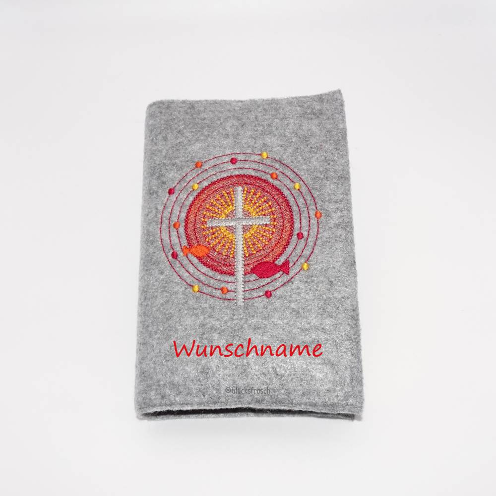 Die Gotteslobhülle ist aus grauem Filz gearbeitet, bestickt ist sie mit einem grauen Kreuz, Kreisen, Punkten und zwei Fischen, in rot, orange und gelb