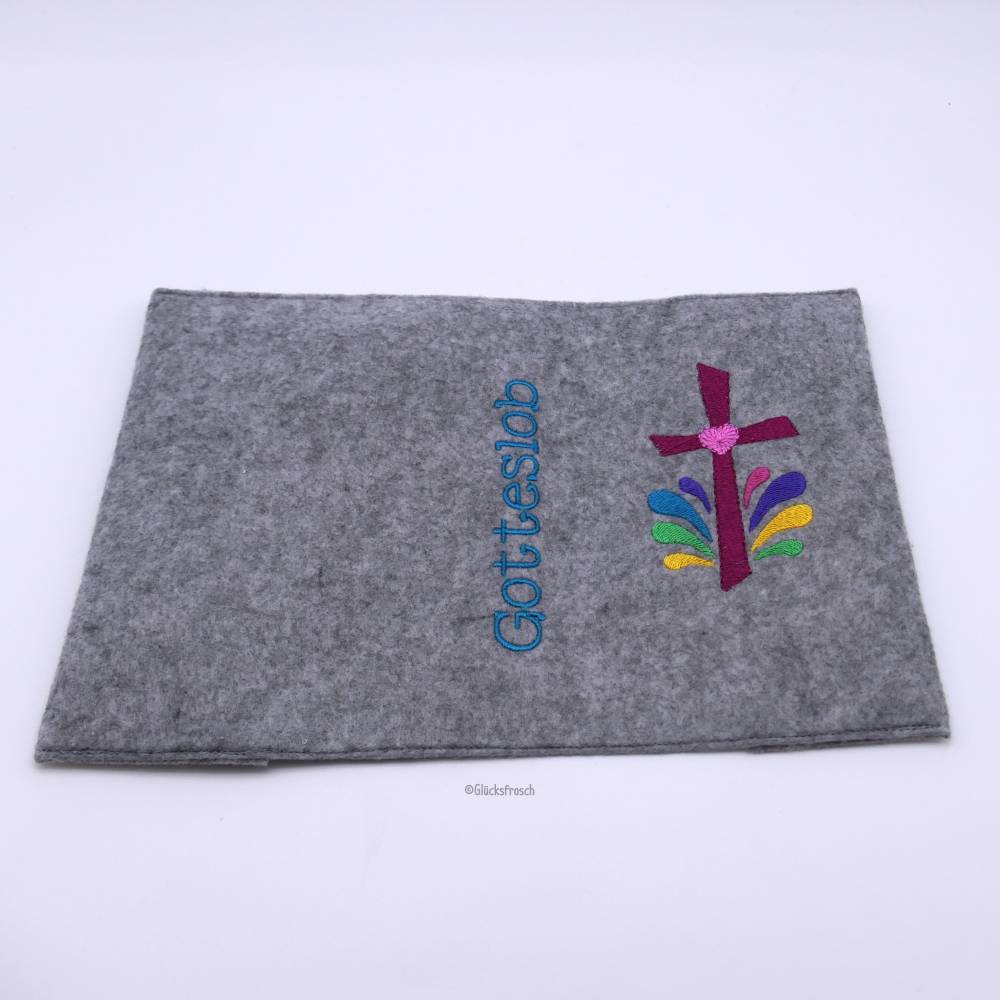Gotteslobhülle, Filz, Kreuze und Schmetterlinge, gestickt