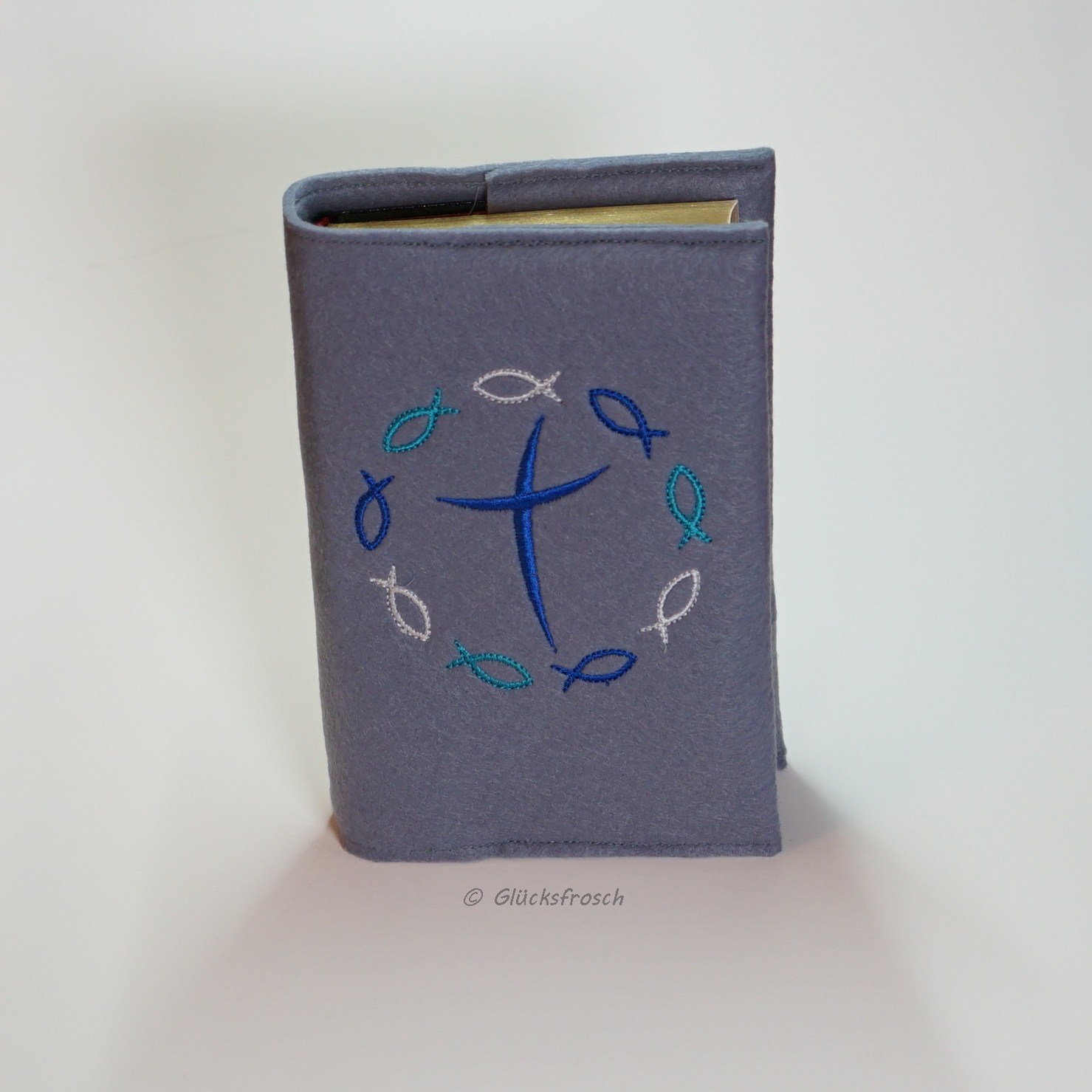 Gotteslobhülle mit blauem Kreuz und Fischen