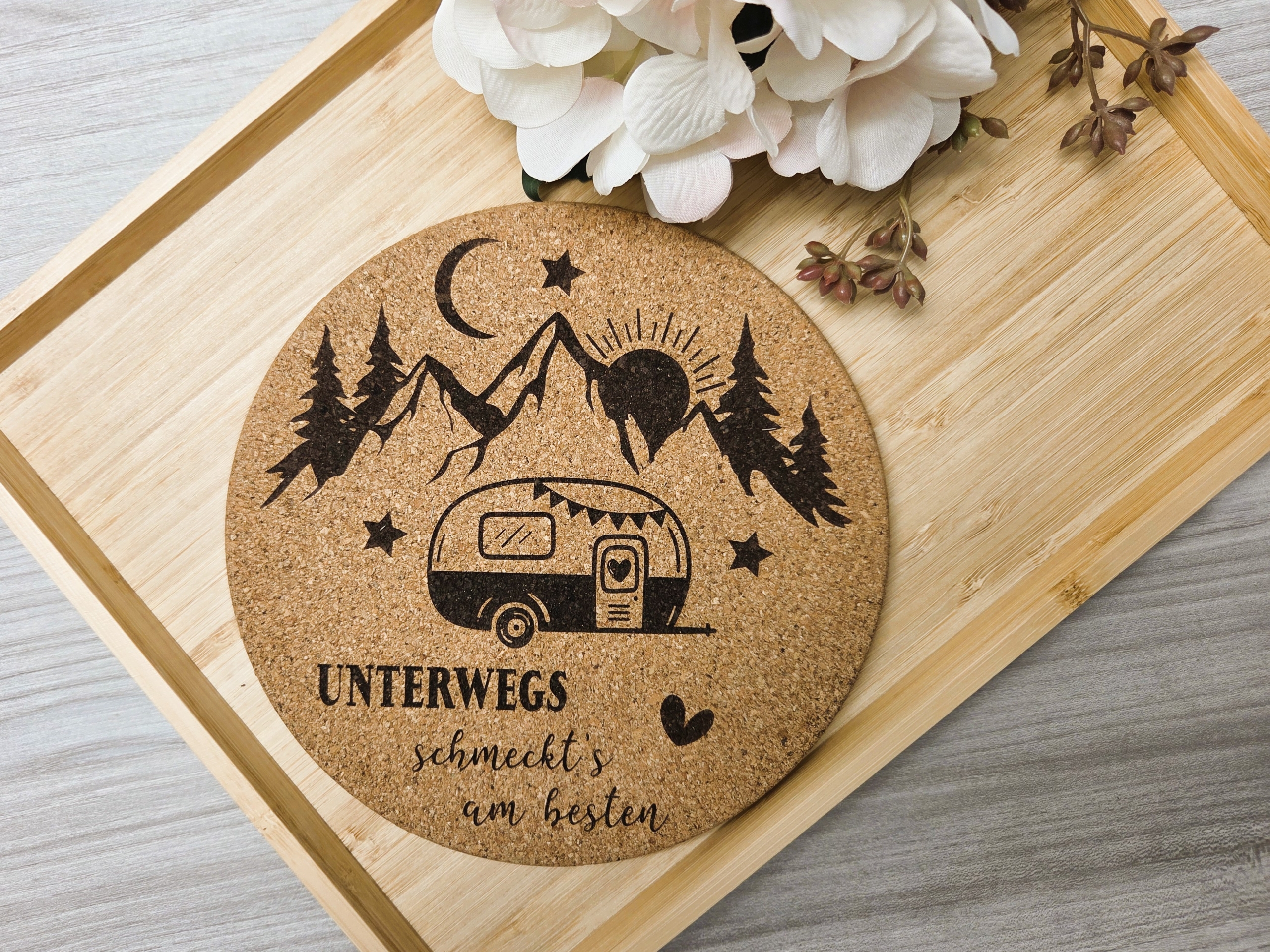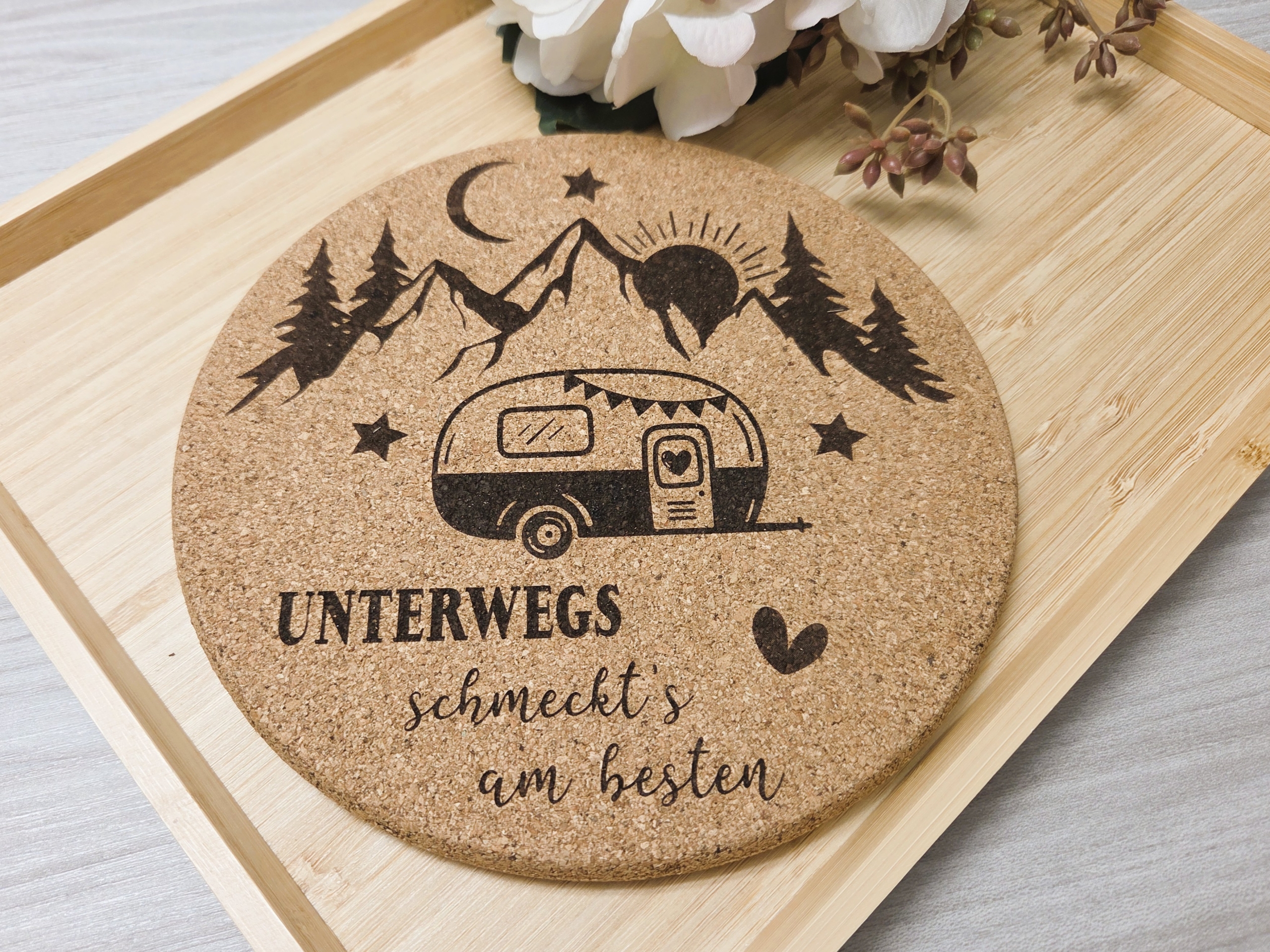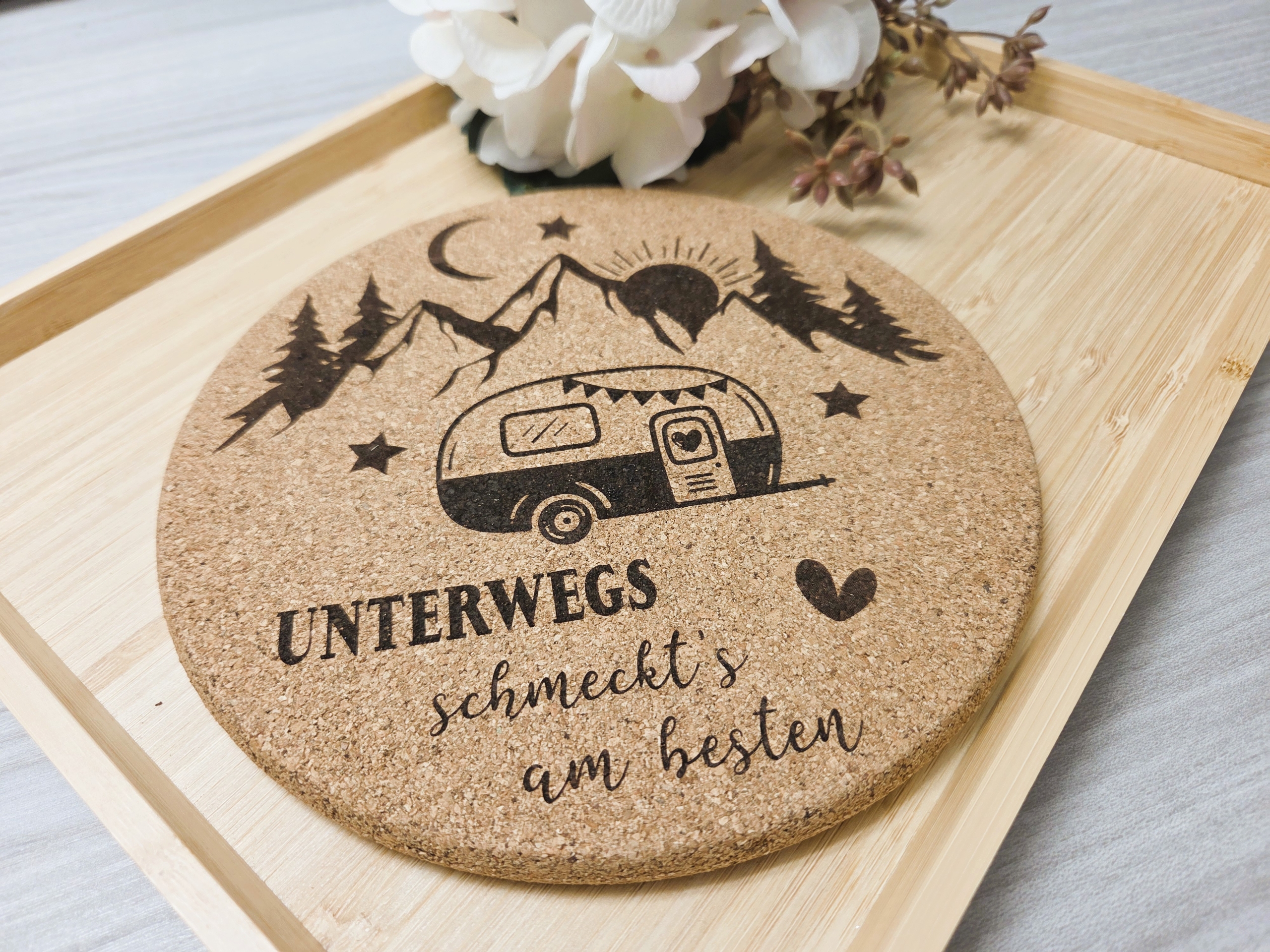 Gravierter Topfuntersetzer "Camping Wohnwagen" aus Kork
