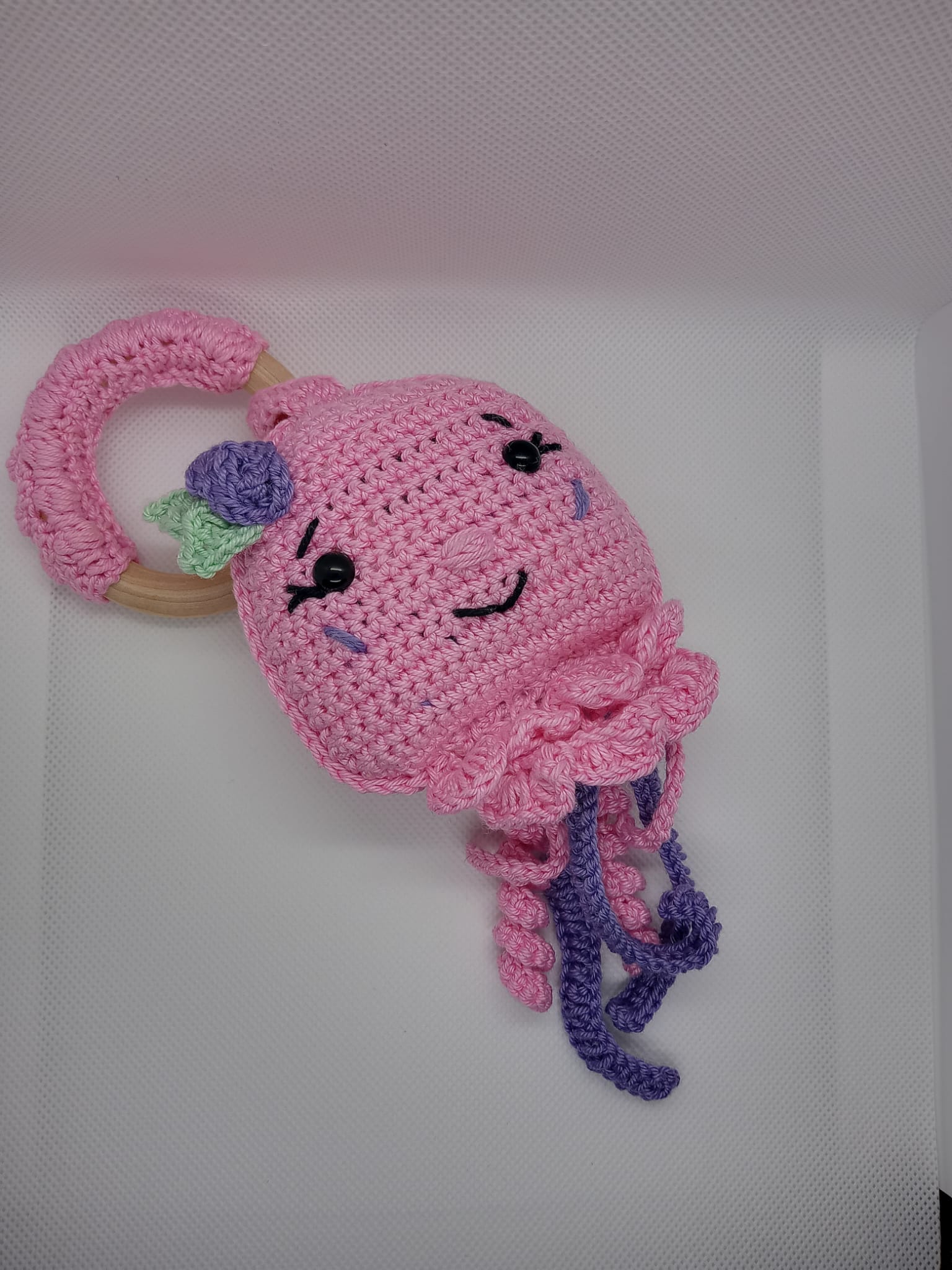 Süßer Greifring als Qualle. Das perfekte Spielzug um das greifen zu lernen. Der Holzring ist unbehandelt und somit Babysicher. Die Rassel im innern ist angehen von der Lautstärke und fördert die Aufmerksamkeit ihres Kindes. Der Greifring ist außerdem auch als Kuscheltier geeignet. Der Greifring ist das perfekte Geschenk für Babypartys, Taufe, Geburtstag oder einfach Mal so zwischendurch. Der Greifring ist für kleine Kinderhände perfekt angepasst. Die Augen sind Sicherheitsaugen und im inneren mit einer Sicherheitskappe verschlossen . Das Produkt ist Schweiß und Speichel echt.