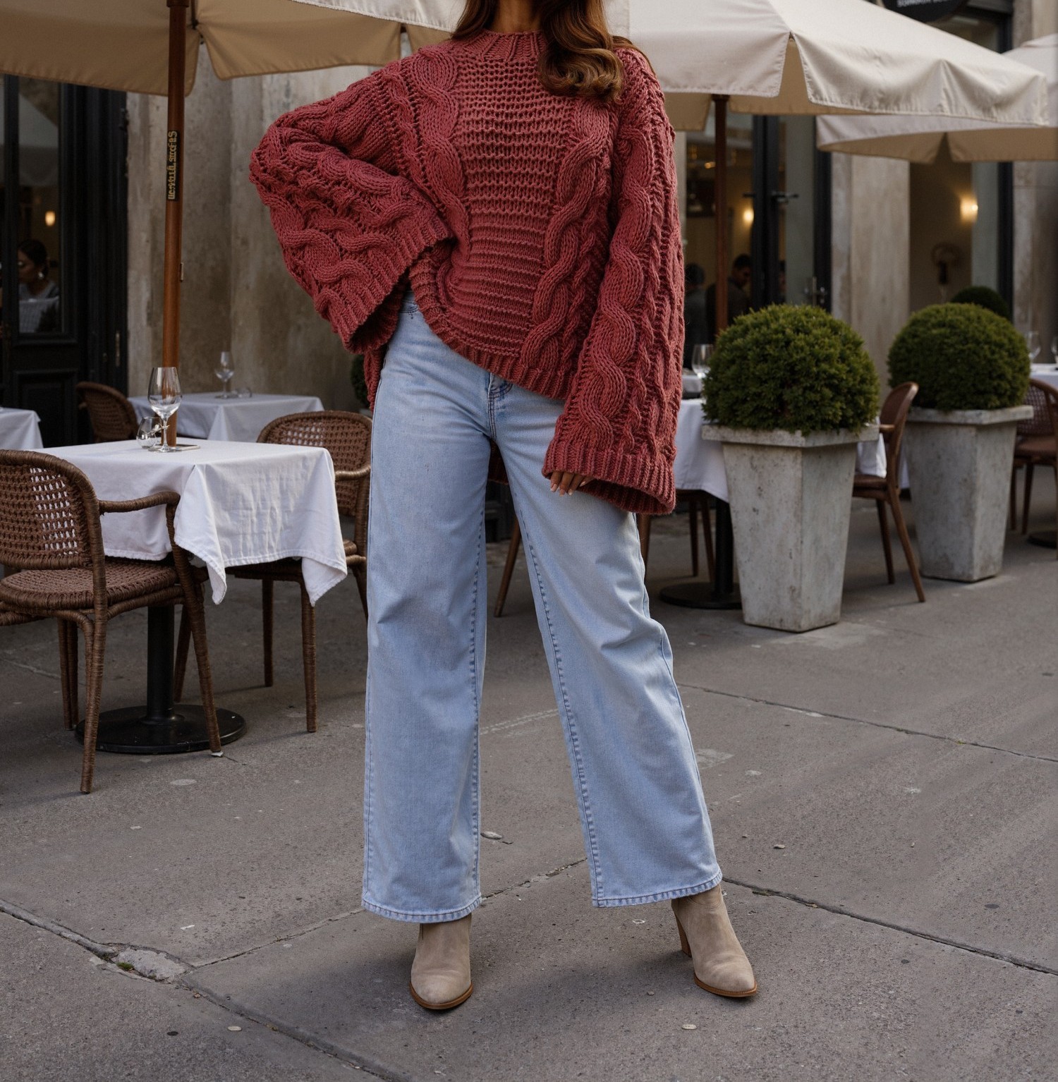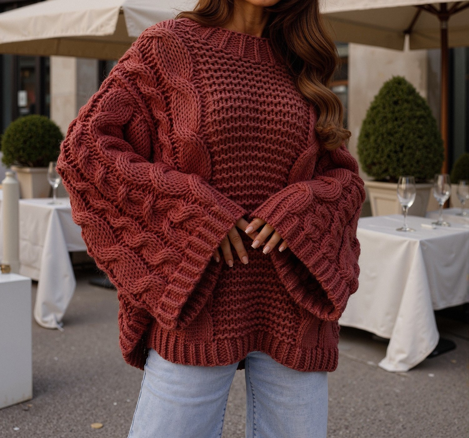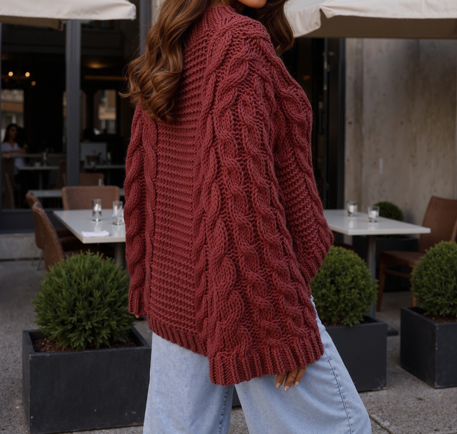 Dieser sehr hochwertige oversize Zopfmuster Strickpullover mit lange und schöne weite Ärmeln in Bordeauxrot ist in Einheitsgröße und passt bei Größe : S M L XL