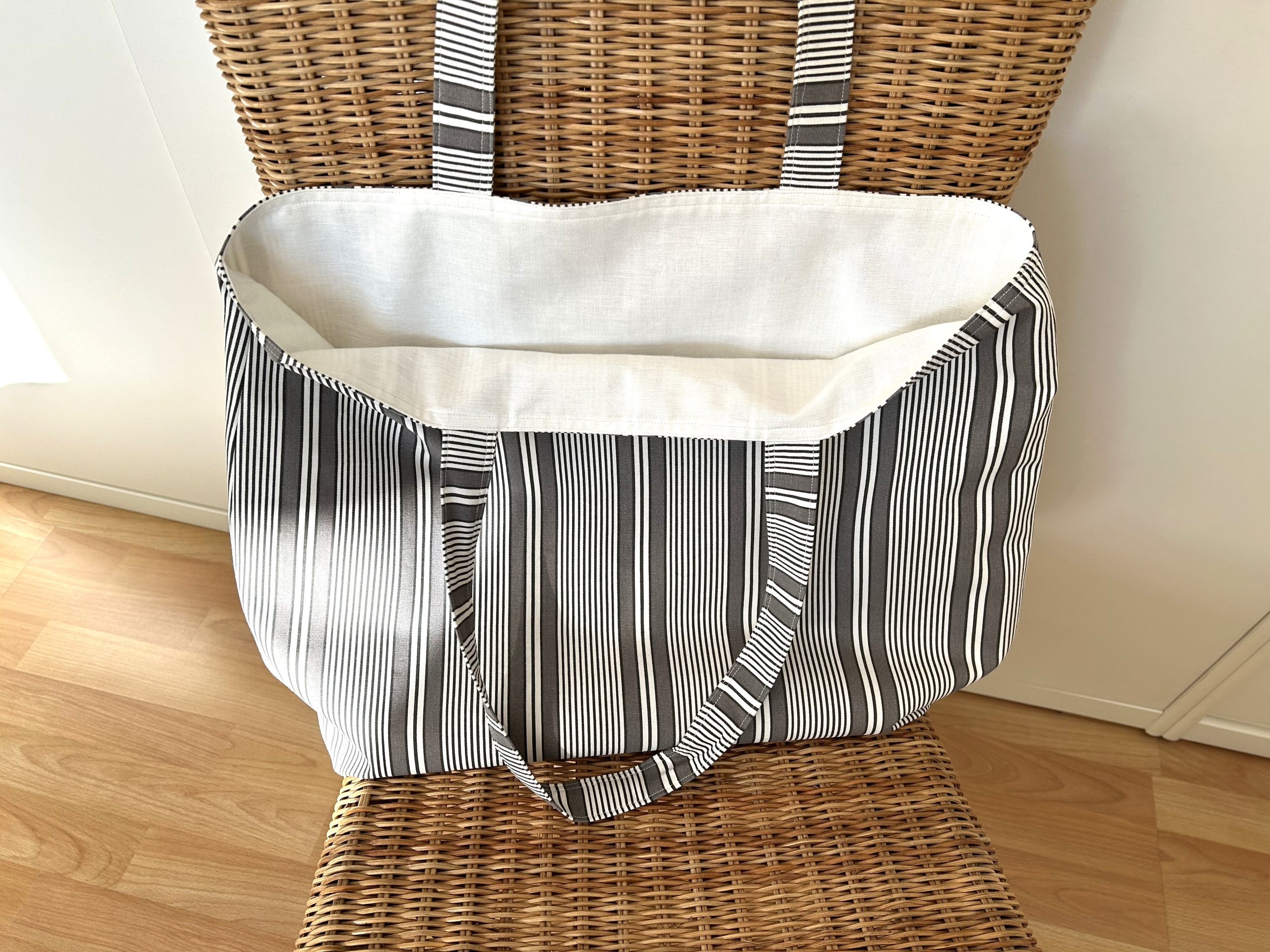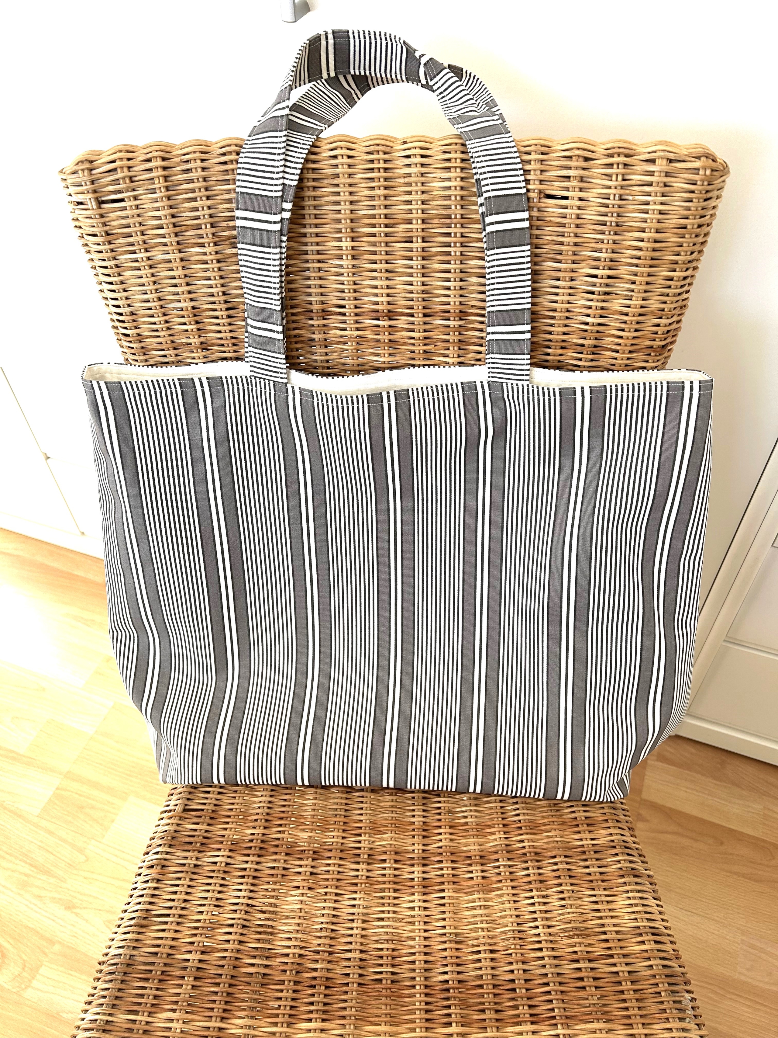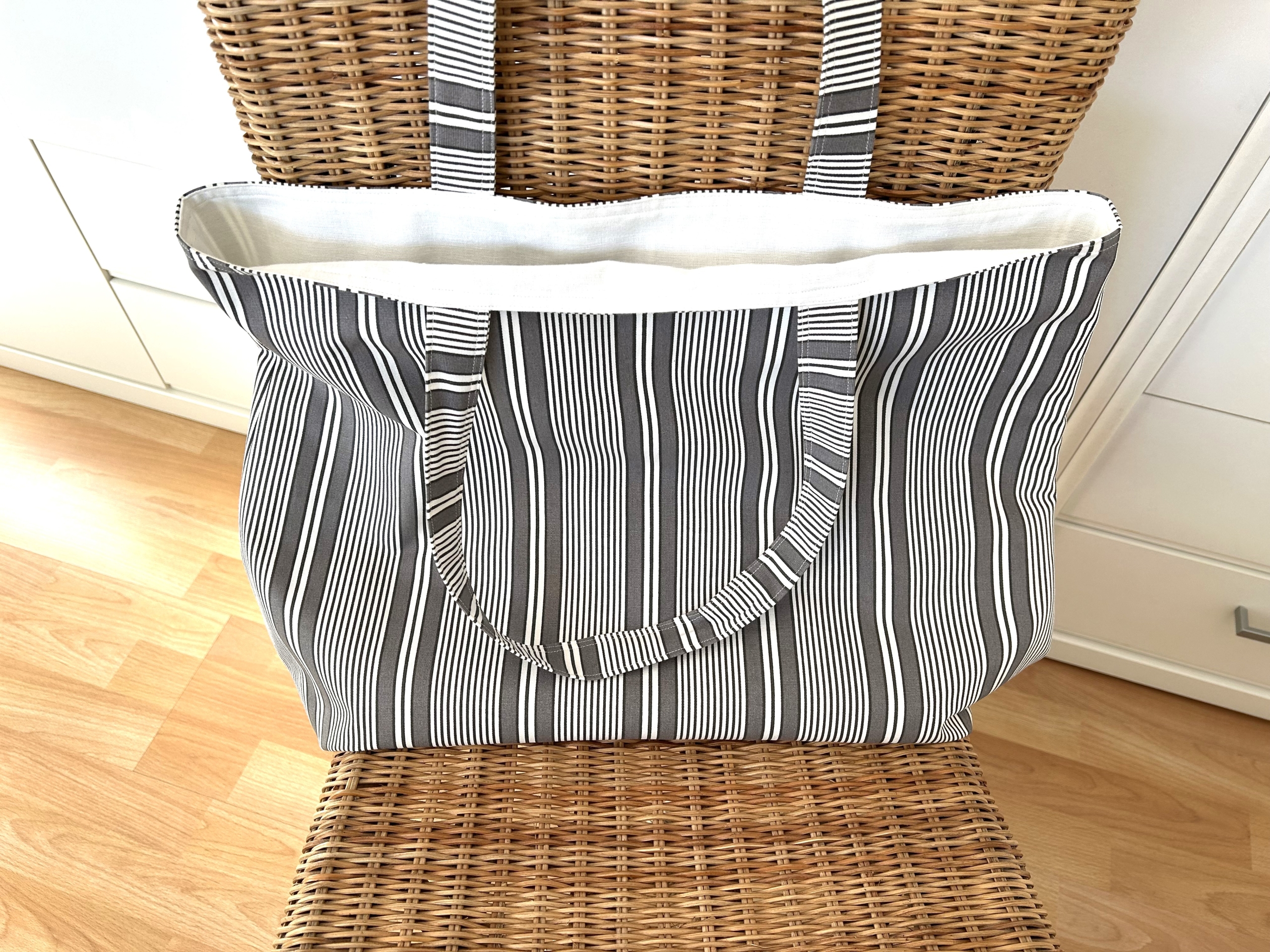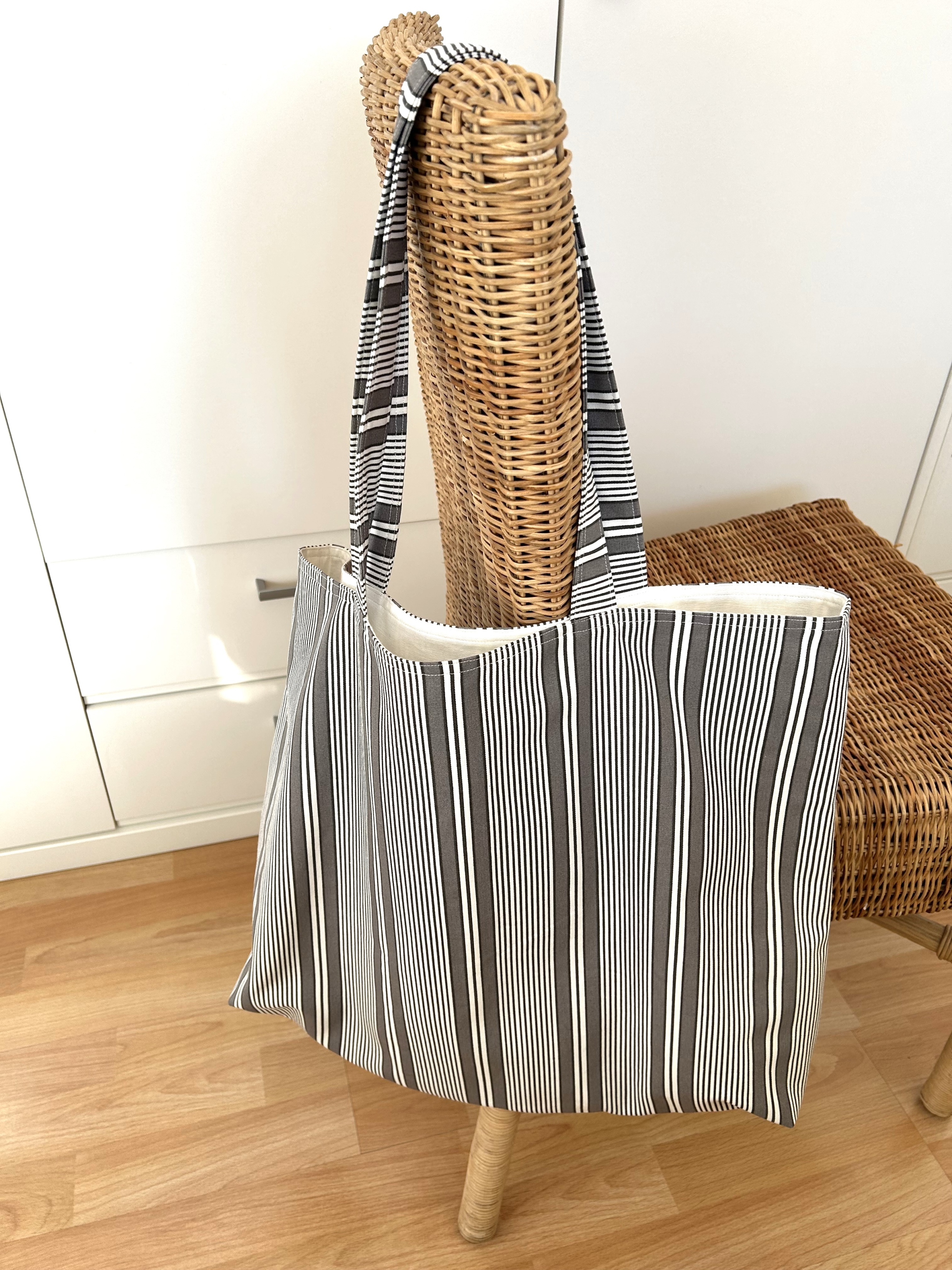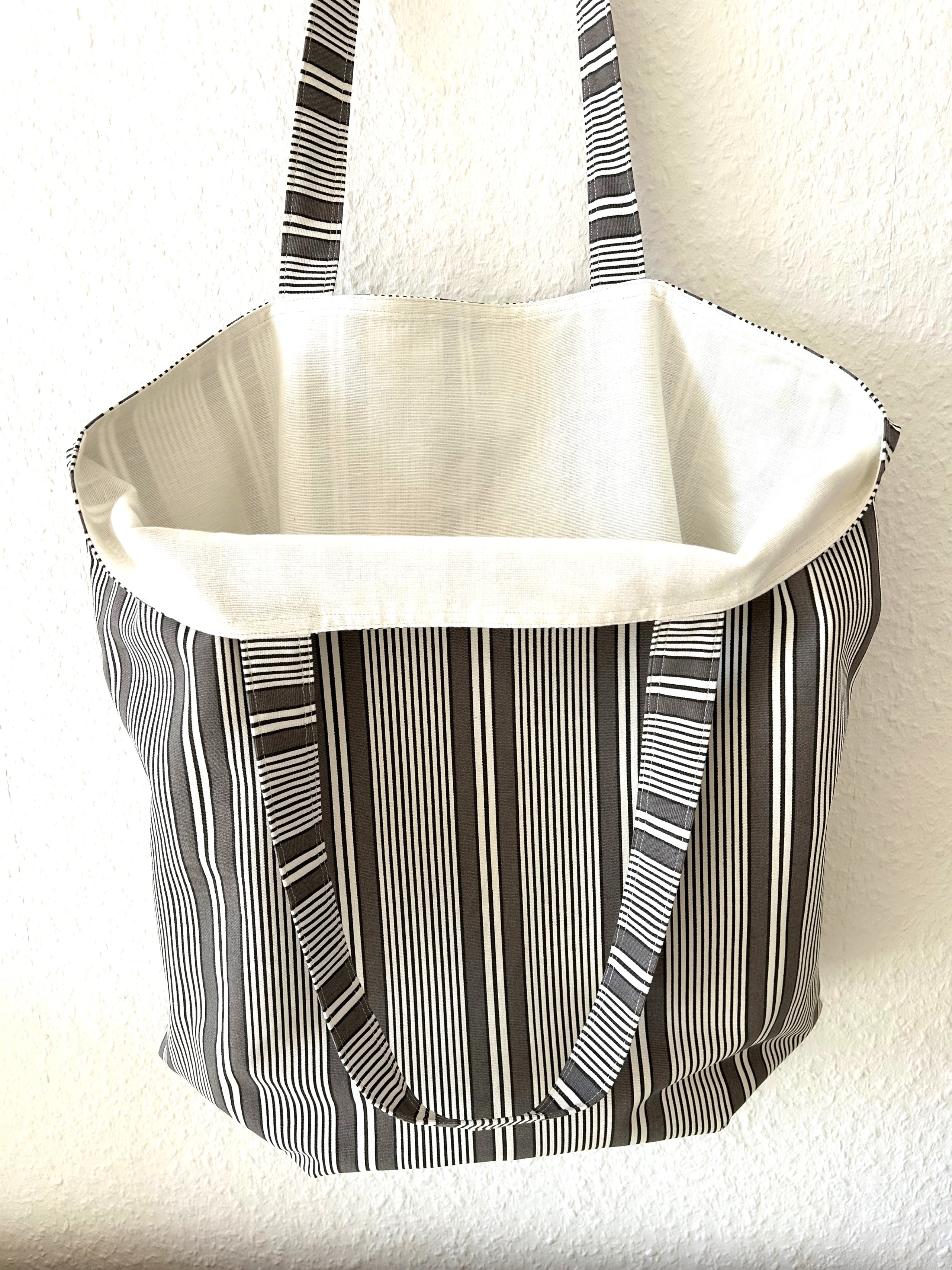 Die Tasche ist aus einem stabilen Baumwollstoff gefertigt mit weißen und hellbraunen Streifen.
