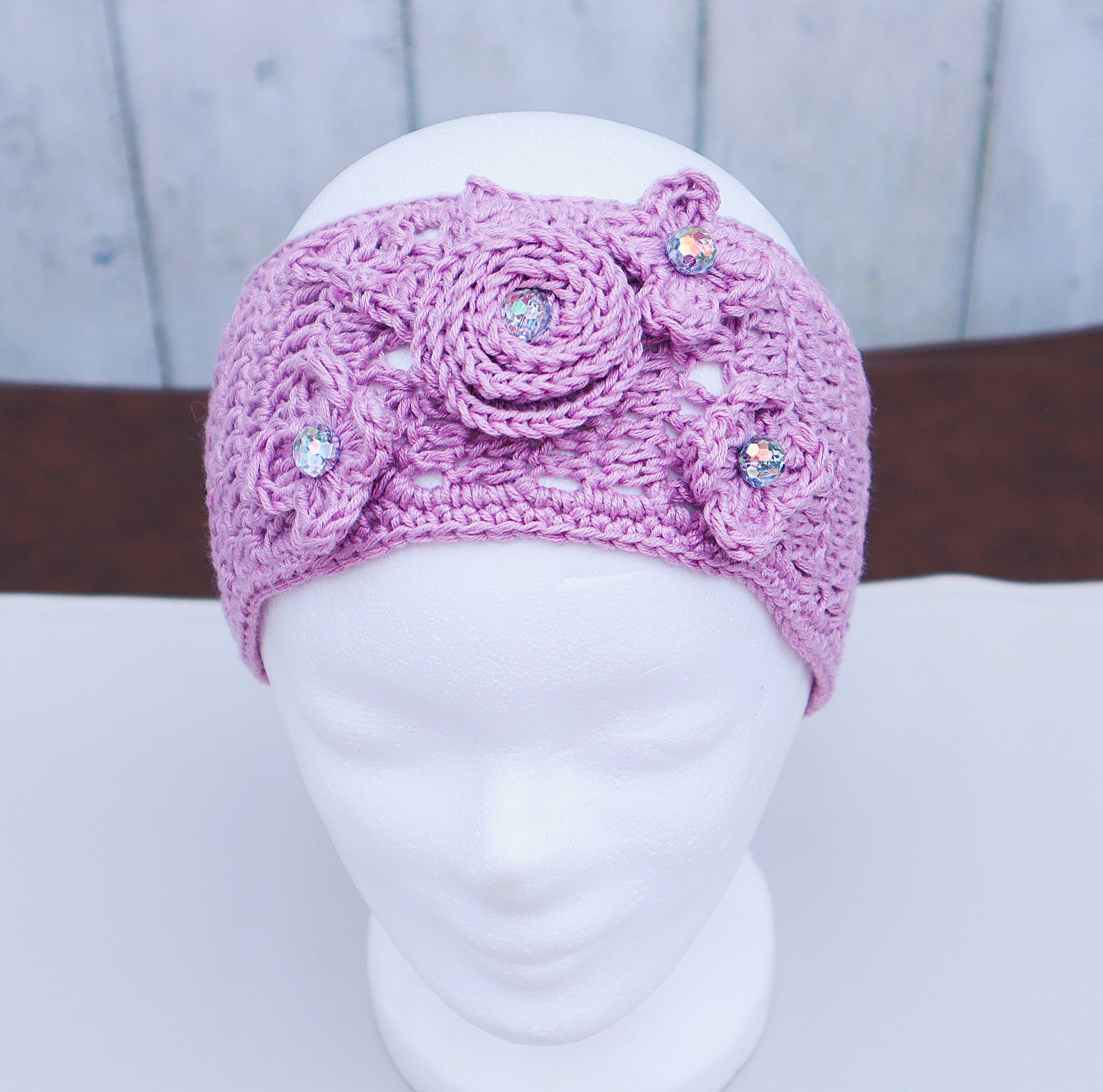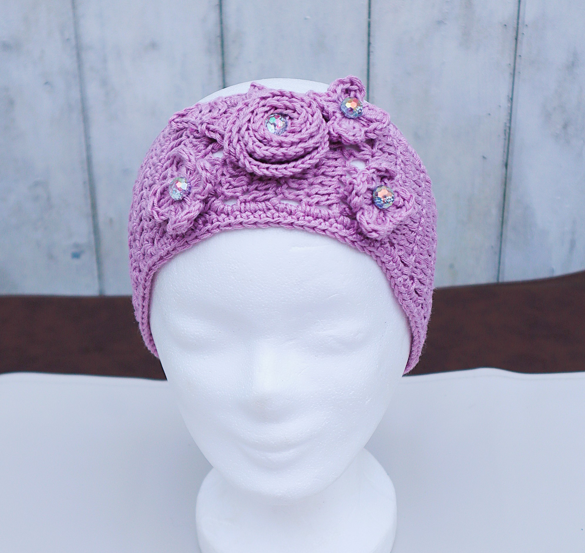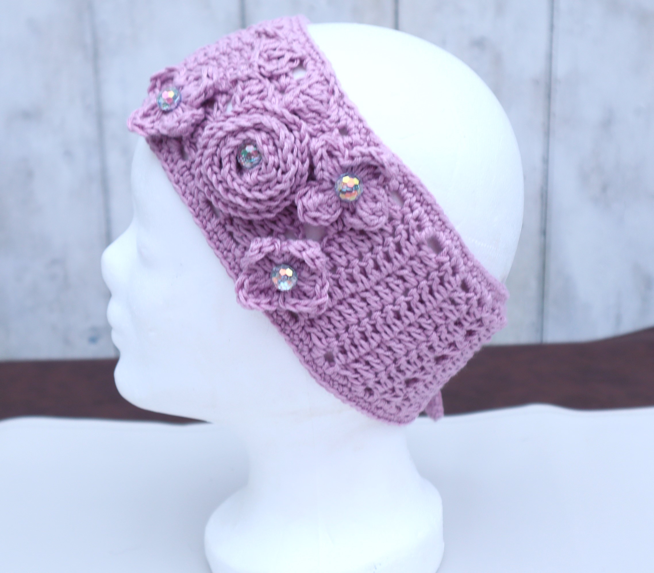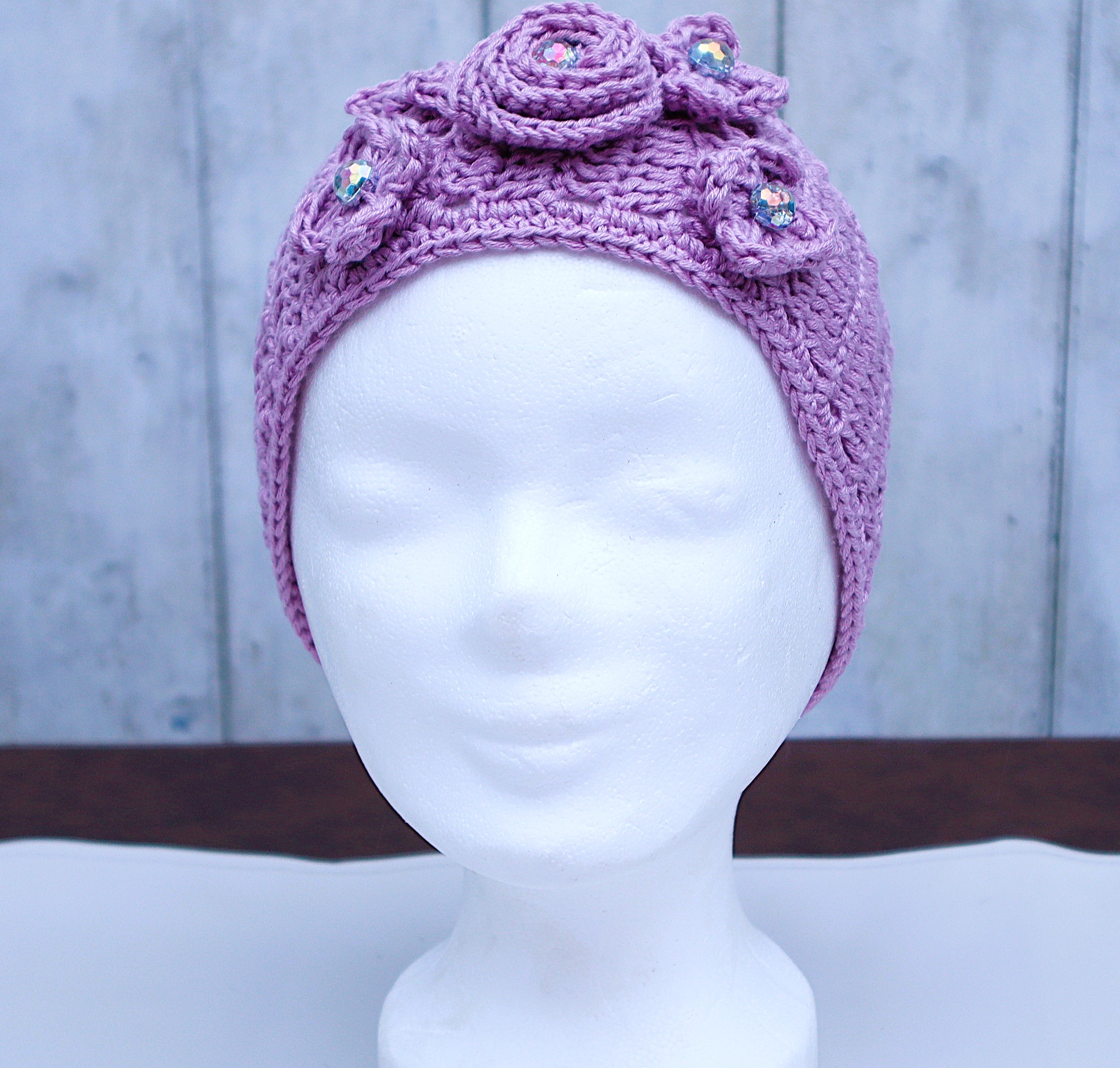 Liebevoll gehäkelter Ohrenwärmer in einem schönen, superweichem Mischgarn in zartlila mit zahlreichen,von Hand gehäkelten Blüten und Blättern.