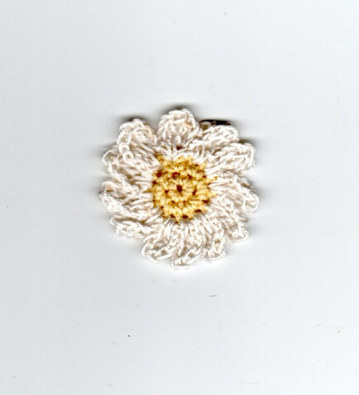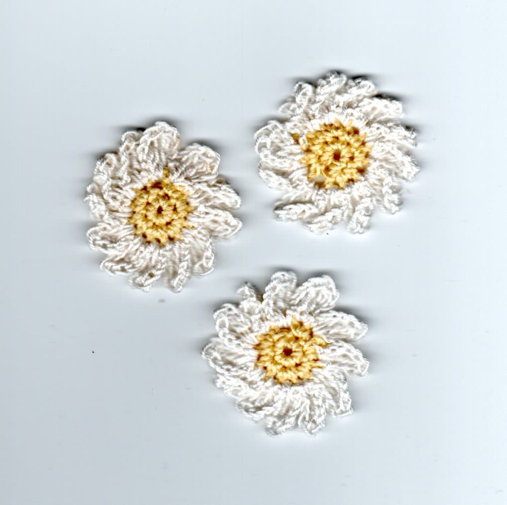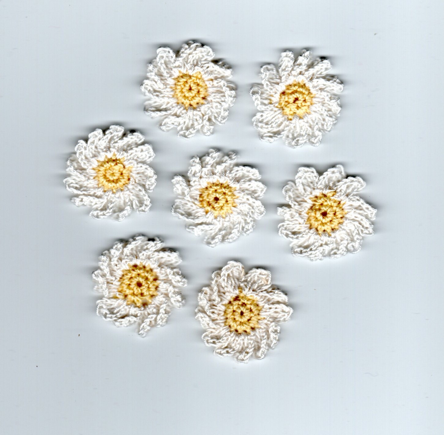 Hier habe ich Häkelblüten, welche an den Frühling erinnern. Durchmesser ca 3,0 cm in gelb und die Farben weiss als Blütenblätter, wie Gänseblümchen Die gehäkelten Strahlen sehen aus wie die Blütenblätter der Blumen-äusserst filigran. 12 Blütenblätter Zum aufnähen-zum Beispiel an Kinderkleidung oder Trachtenmode oder zum ausstreuen-und als Geschenkanhänger eine witzige Idee. Alles absolut von mir selbst angefertigt/gehäkelt. Menge 10 Stück, andere Mengen möglich. Dann einfach anfragen