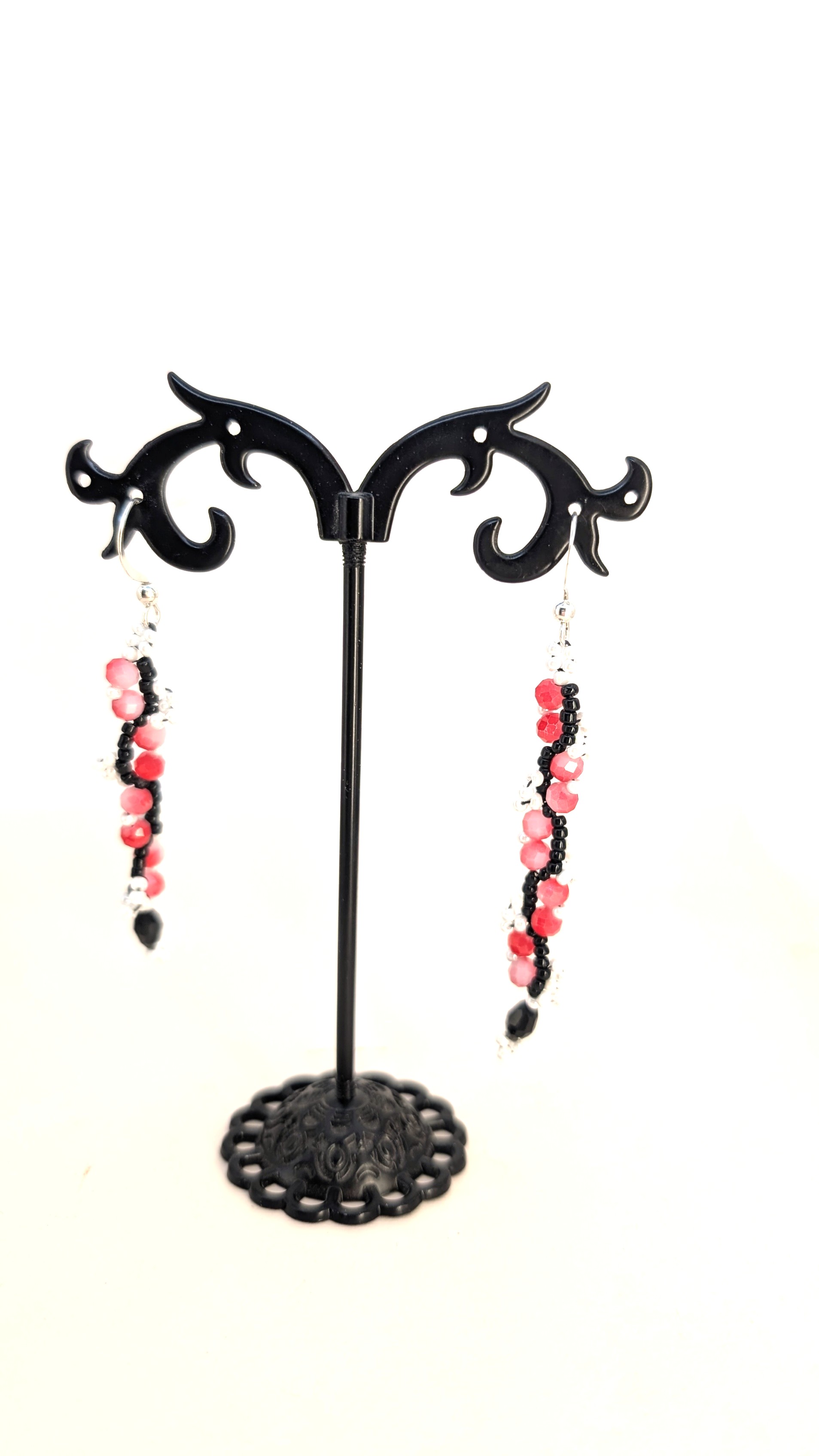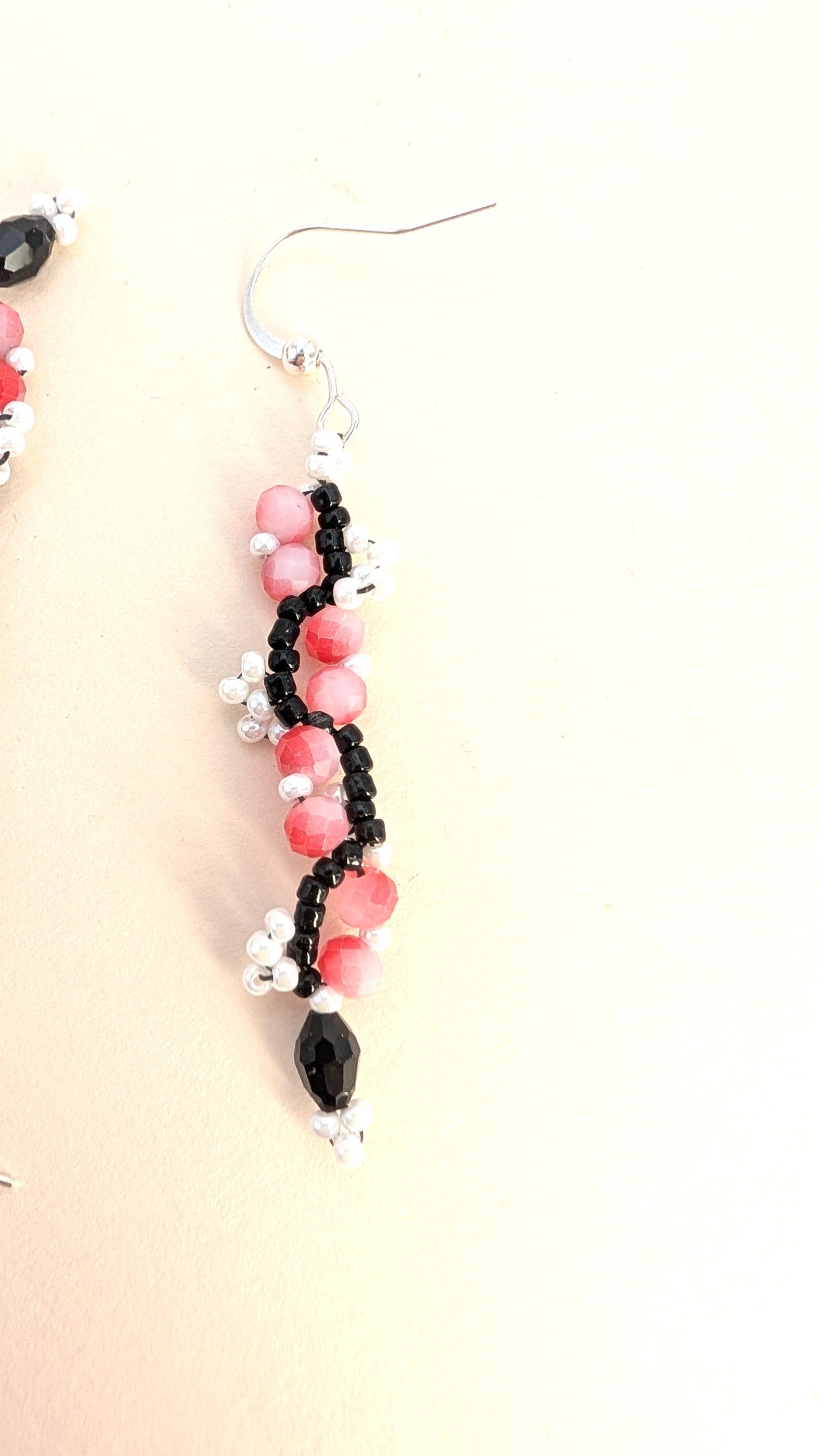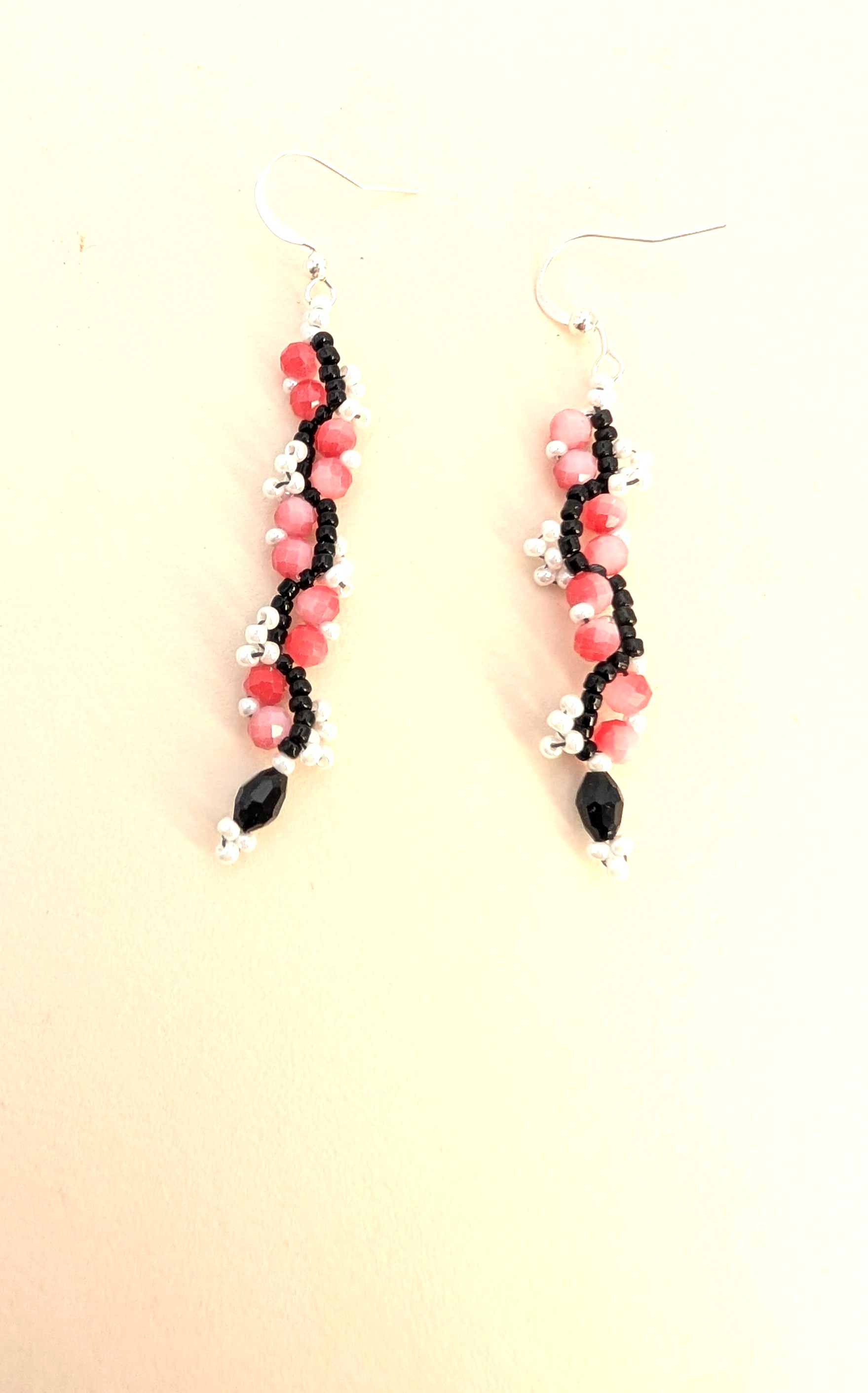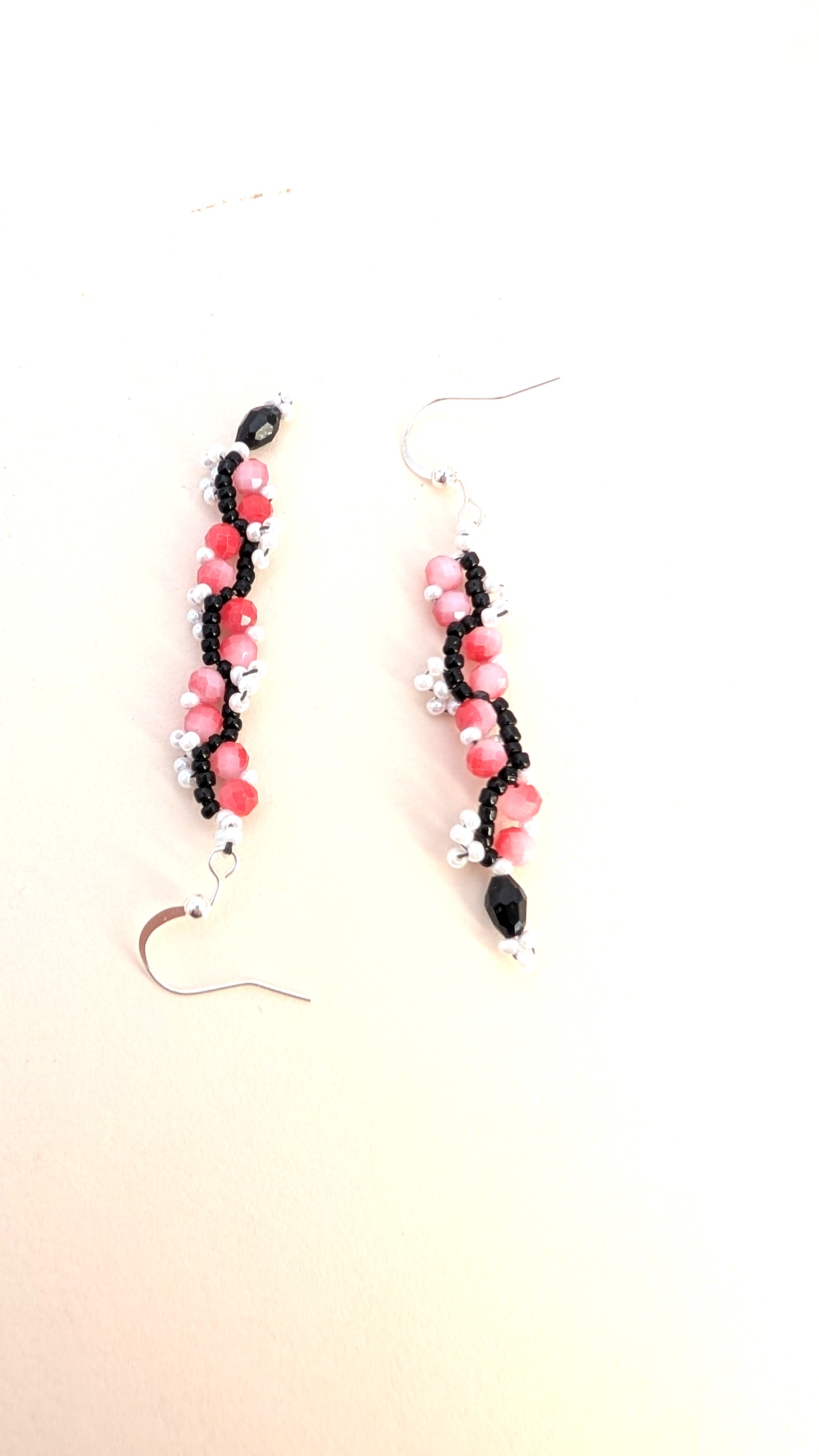 Diese handgefertigten Ohrringe aus tiefschwarzen, facettierten Glasperlen vereinen zeitlose Eleganz mit einem Hauch von Boho-Charme. Die Perlen sind kunstvoll miteinander verflochten und bilden eine filigrane, leicht bewegliche Struktur, die bei jedem Schritt sanft schimmert und das Licht wunderschön reflektiert.