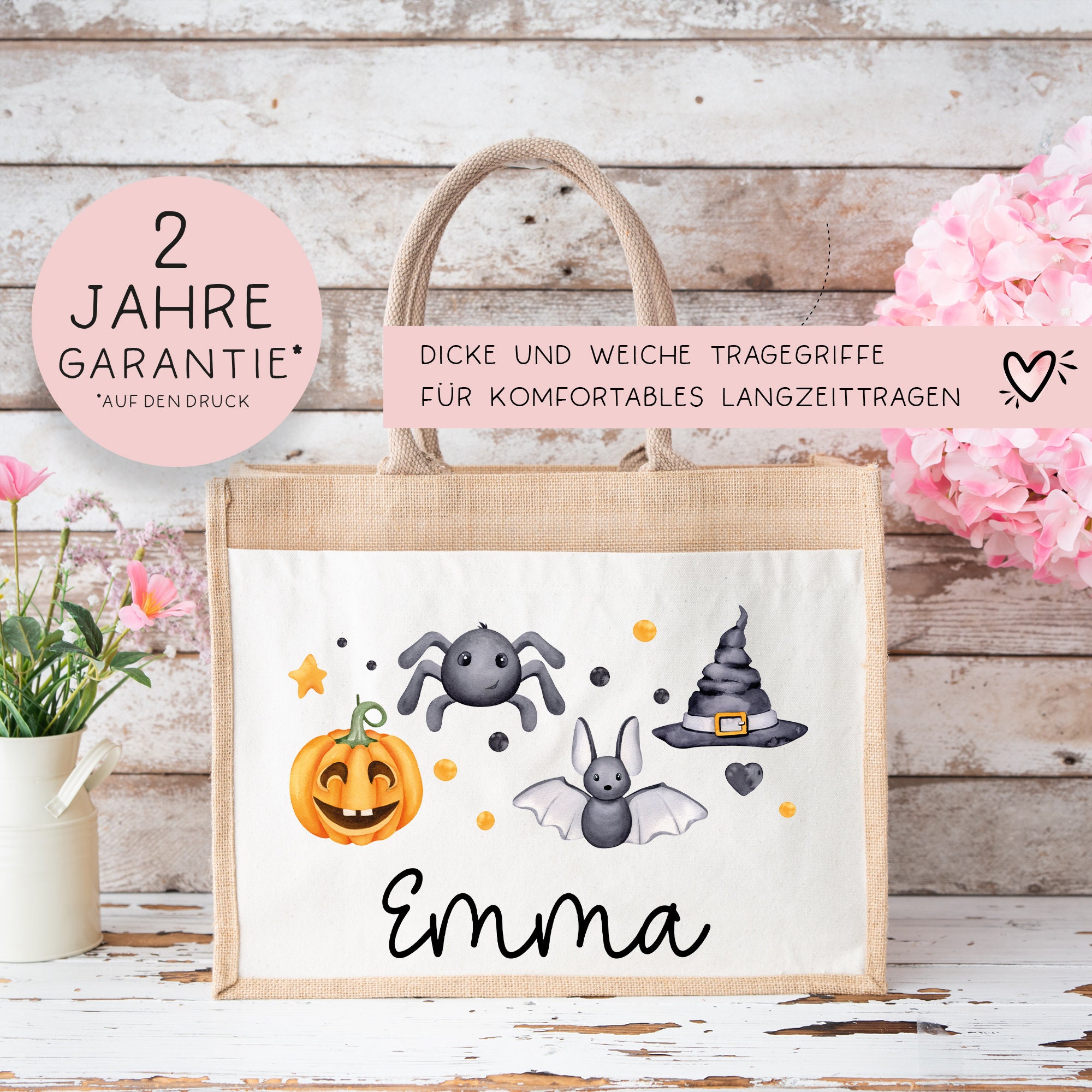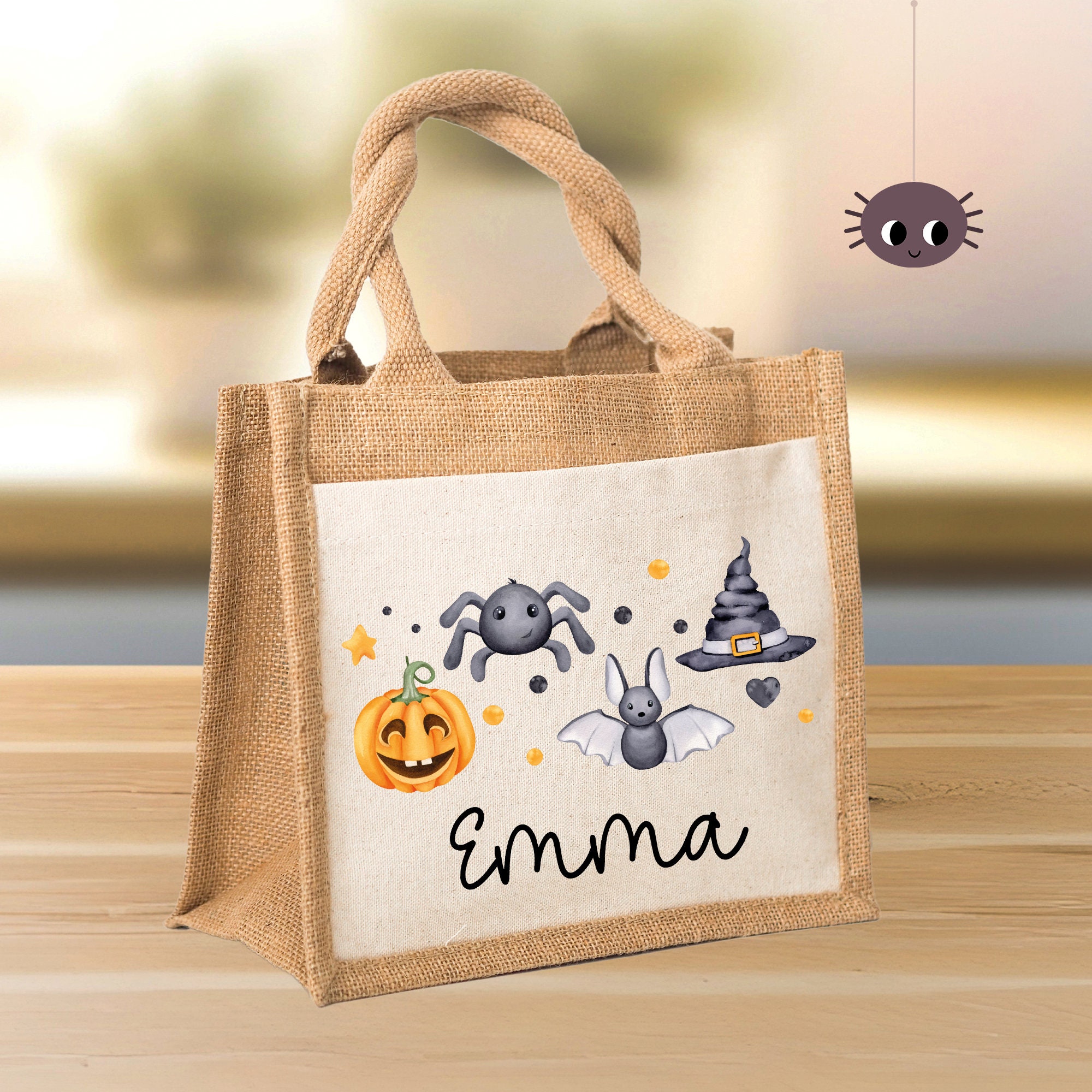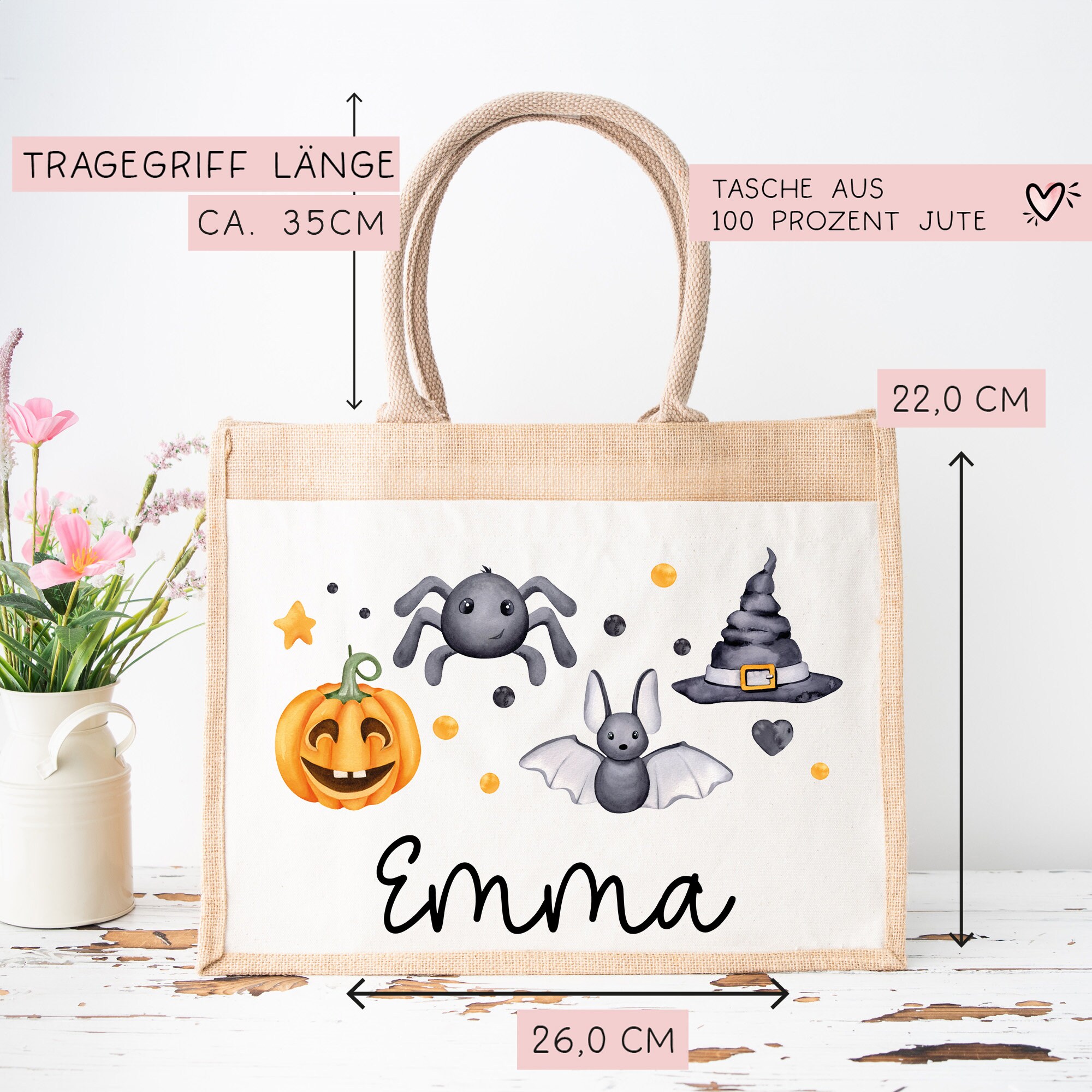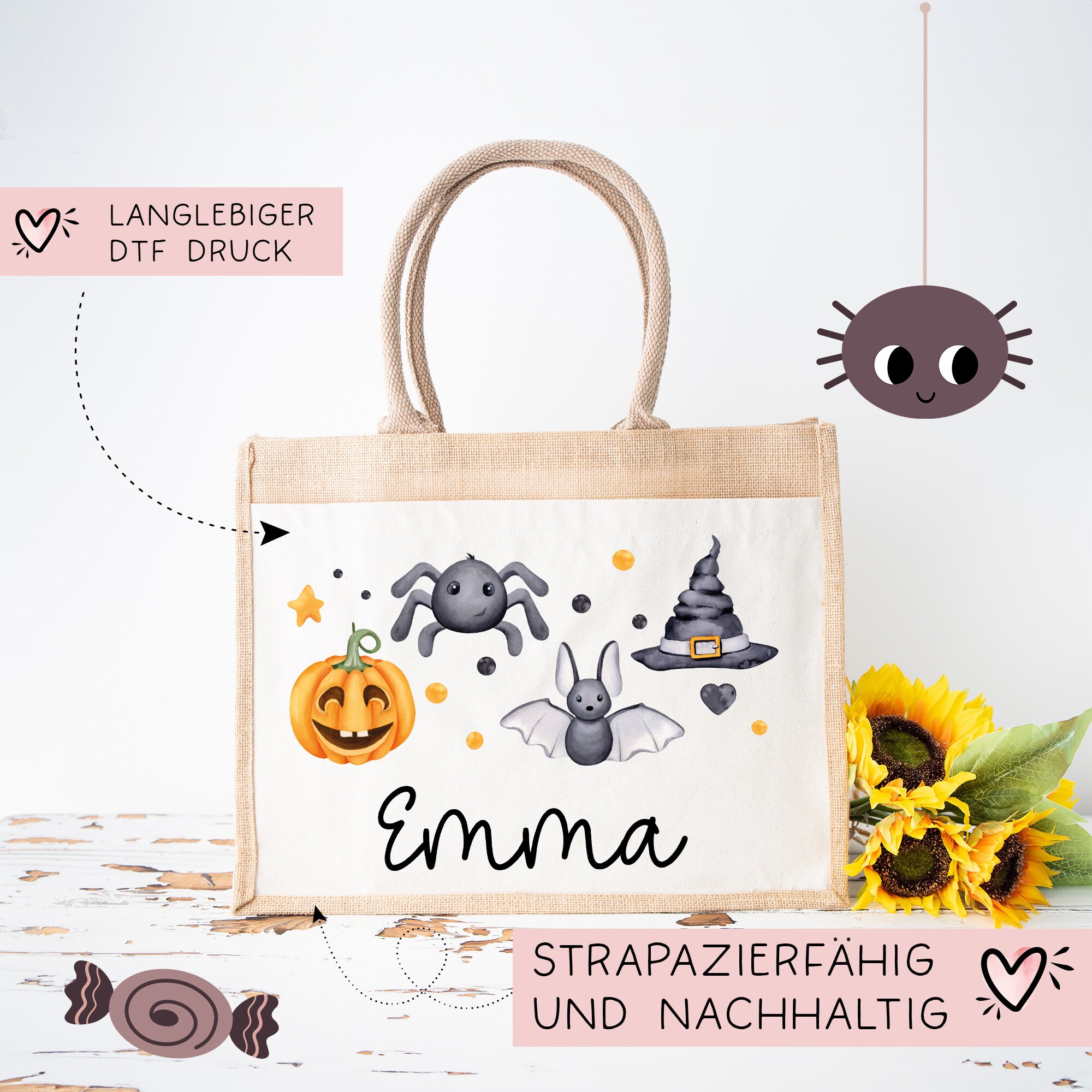 Halloween-Stofftasche mit Namen | Beutel mit Geist, Kürbis, Spinne und Hexenhut | Süßigkeitentasche mit Namen | Kinder-Tragetasche für Halloween-Süßigkeiten