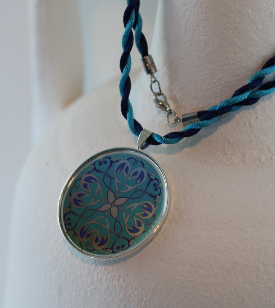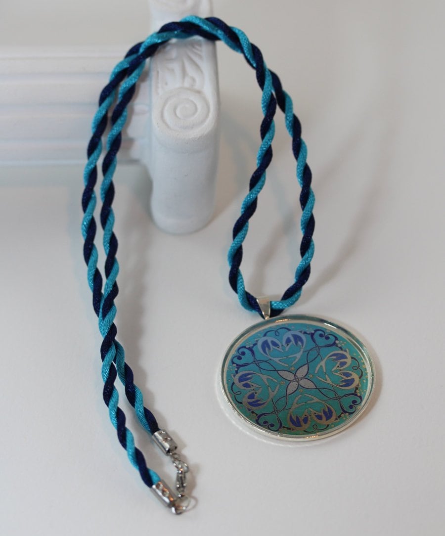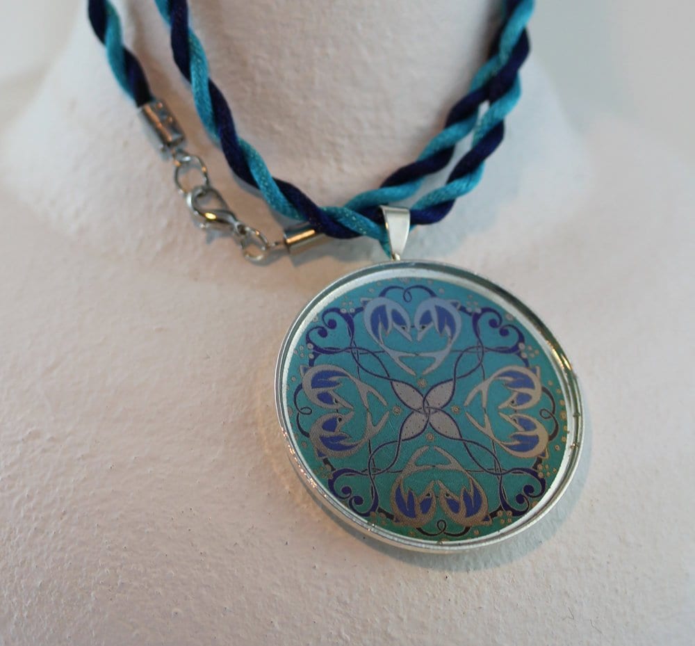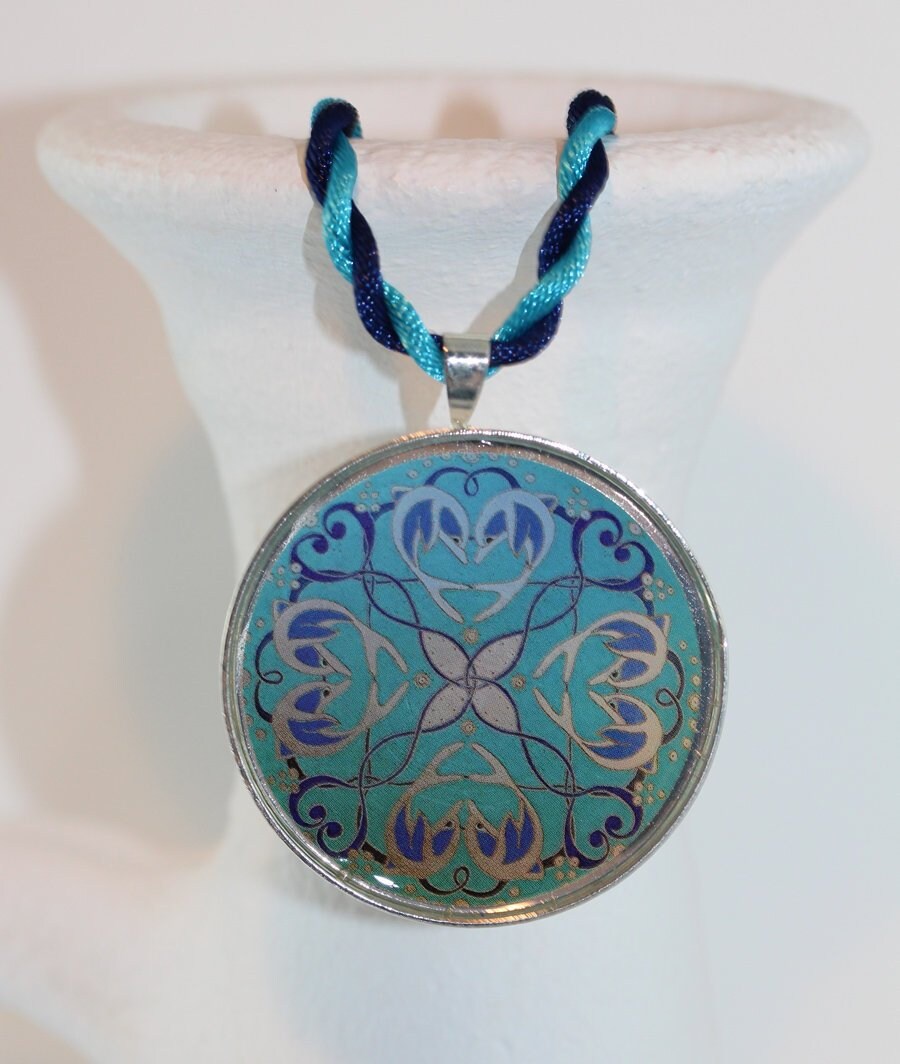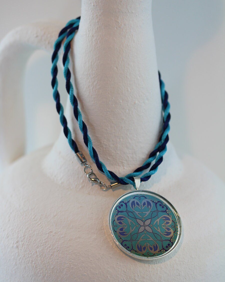 Die Materialien sind versilbertes Metall, Motiv unter schützendem Kunstharzguß, handgedrehte Kordel aus weicher Acetatseide. Der Anhänger hat einen Durchmesser von 4 cm, die Kordelkette ist angenehme 50 cm lang.