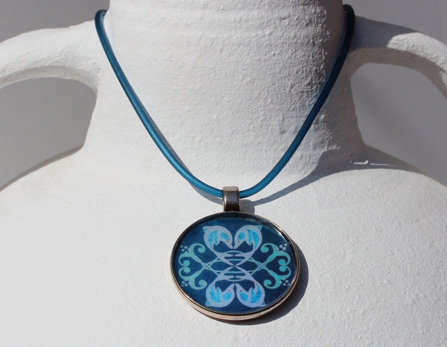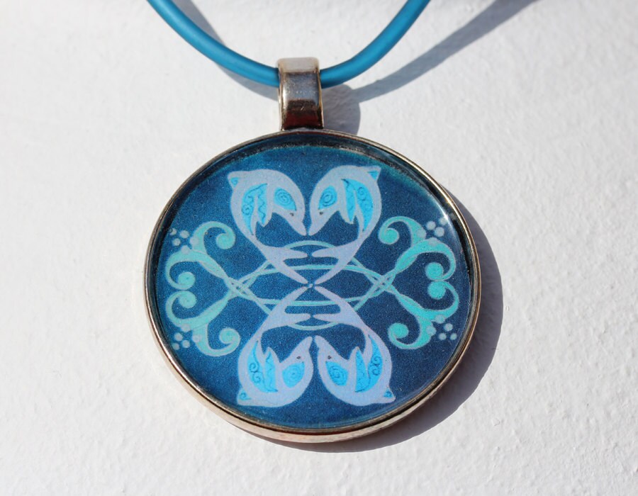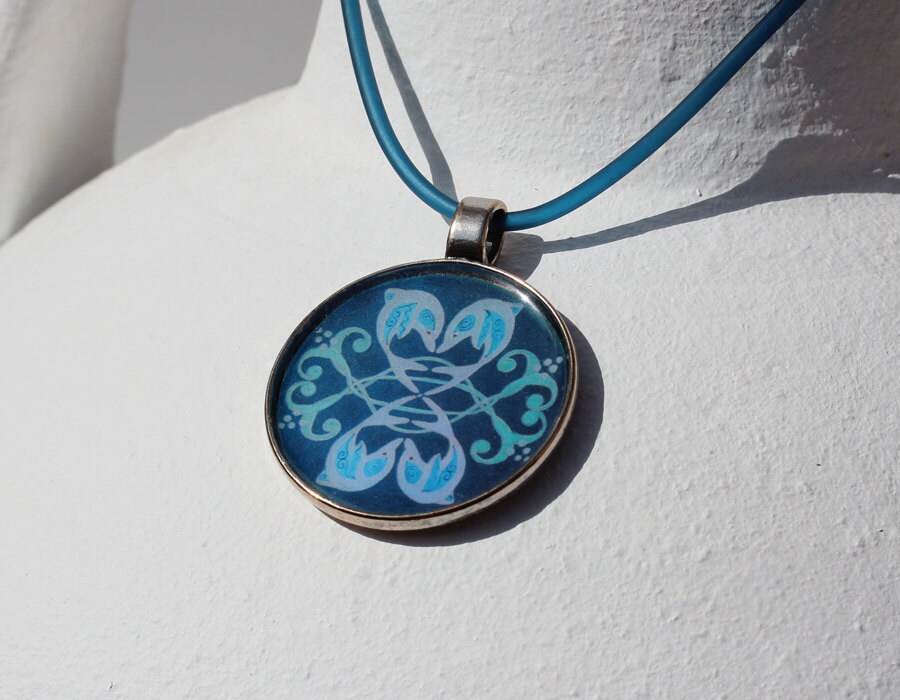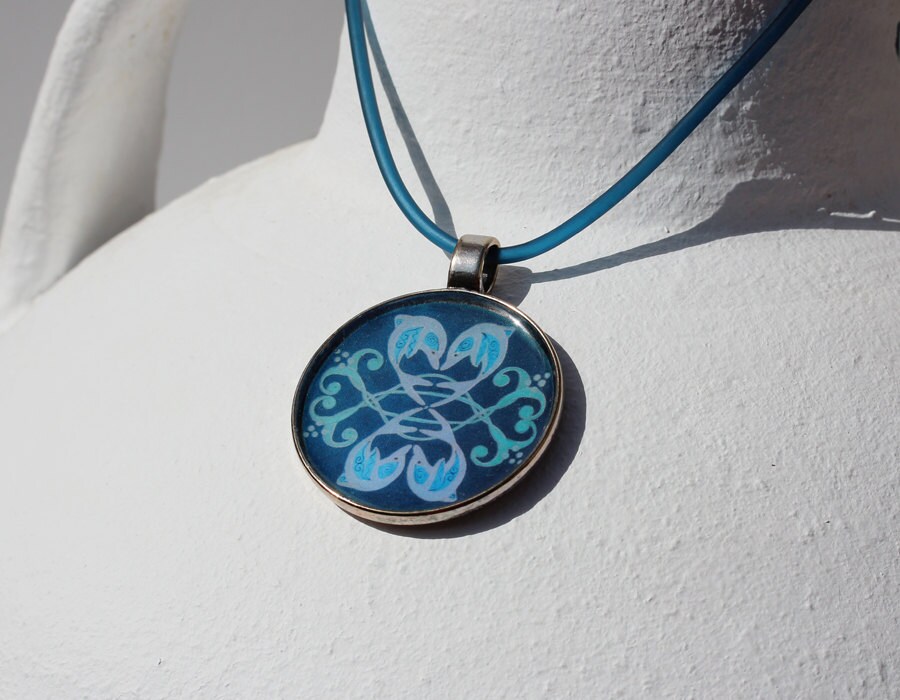 Das Delphin Mandala Motiv "Dolphin Love", fröhlich springende Delfinpaare auf dunkelblauem Hintergrund, hier in einem antiksilberfarbenen Anhänger, an einer dunkelblauen Kautschukkordel.