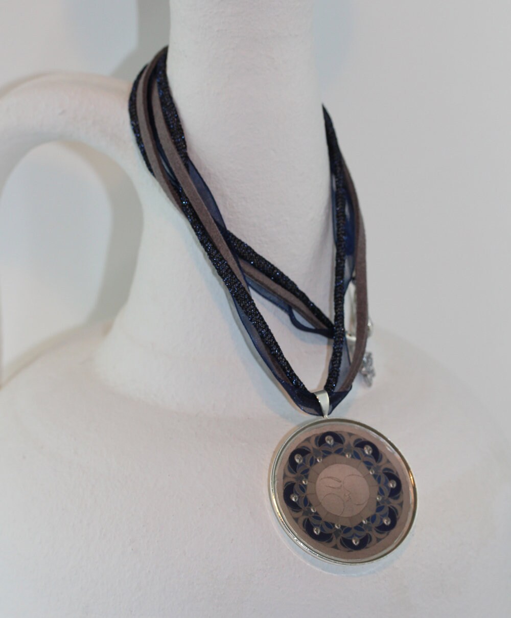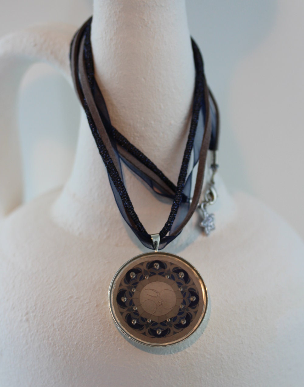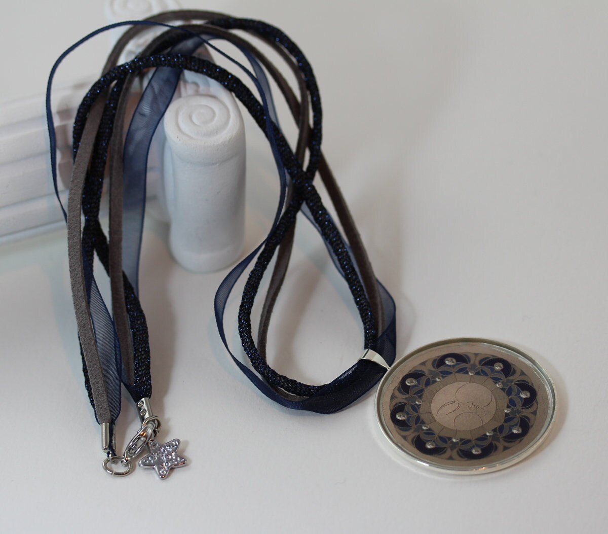 Die Materialien sind silbern legiertes Metall, Motiv unter Kunstharzguß, Künstlerfarben und Kordeln aus weichem Velours und Metallikgarn. Der Anhänger hat einen Durchmesser von 4 cm, die Kordelkette ist 50 cm lang.