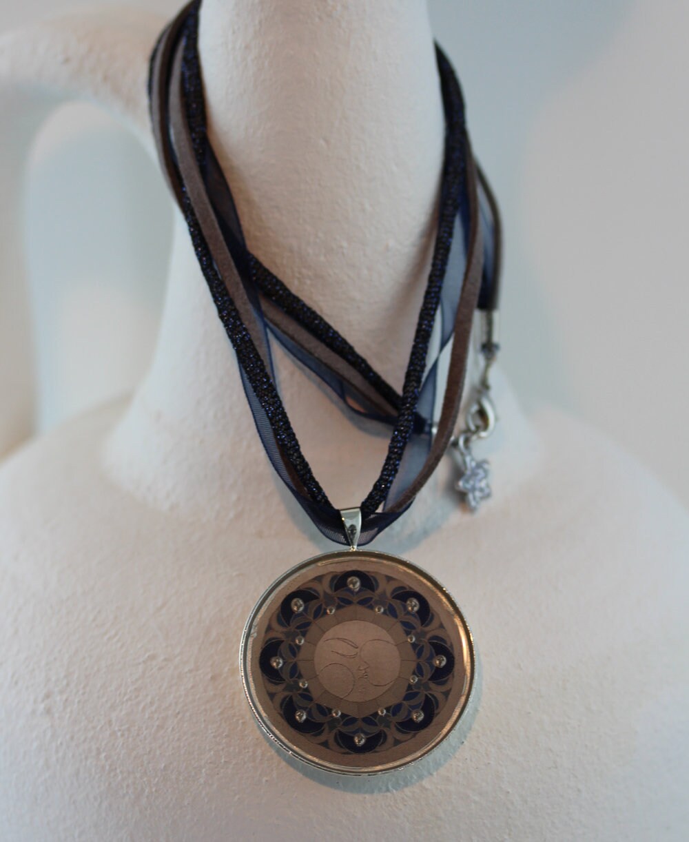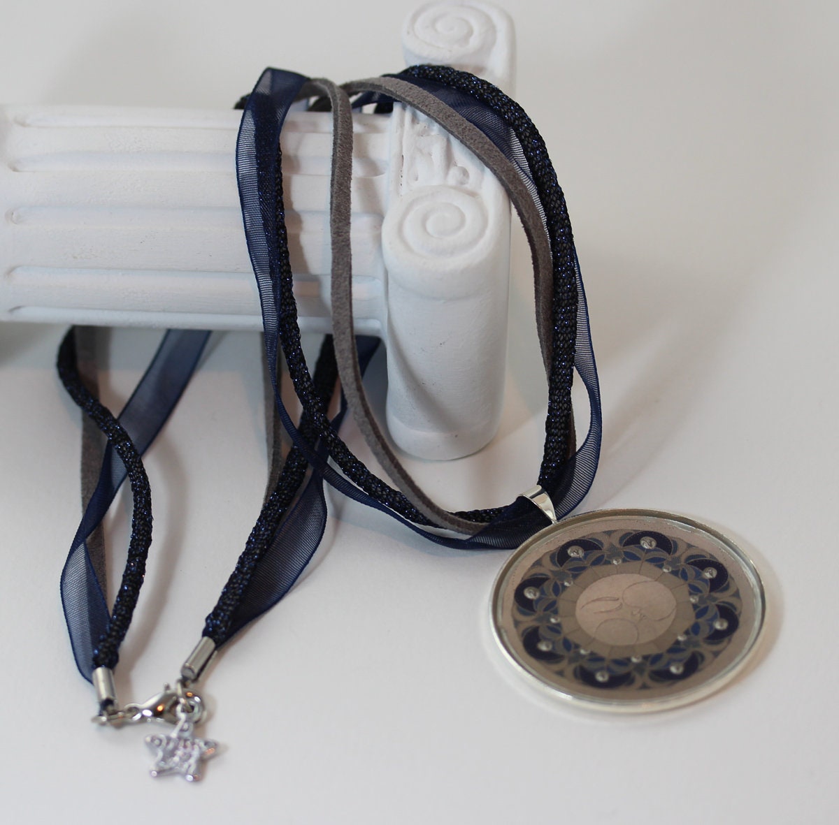 Ein ausdrucksstarkes Schmuckstück ist diese Halskette im Design Lunasacrada mit einem Mond Mandala in silbergrau und blau im Stil der Maya, mit einer farblich passenden Kordelkette.