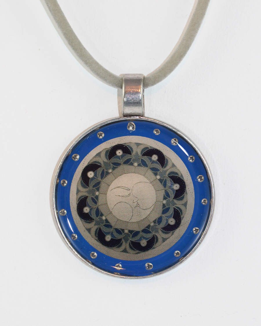 Das Material ist altsilbern legiertes Metall, Künstlerfarben, Motiv unter Resinguß. Der Anhänger hat einen Durchmesser von 5 cm, die Kordel ist ca. 50 cm lang.