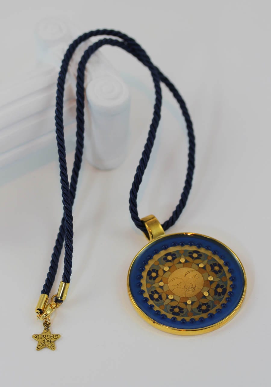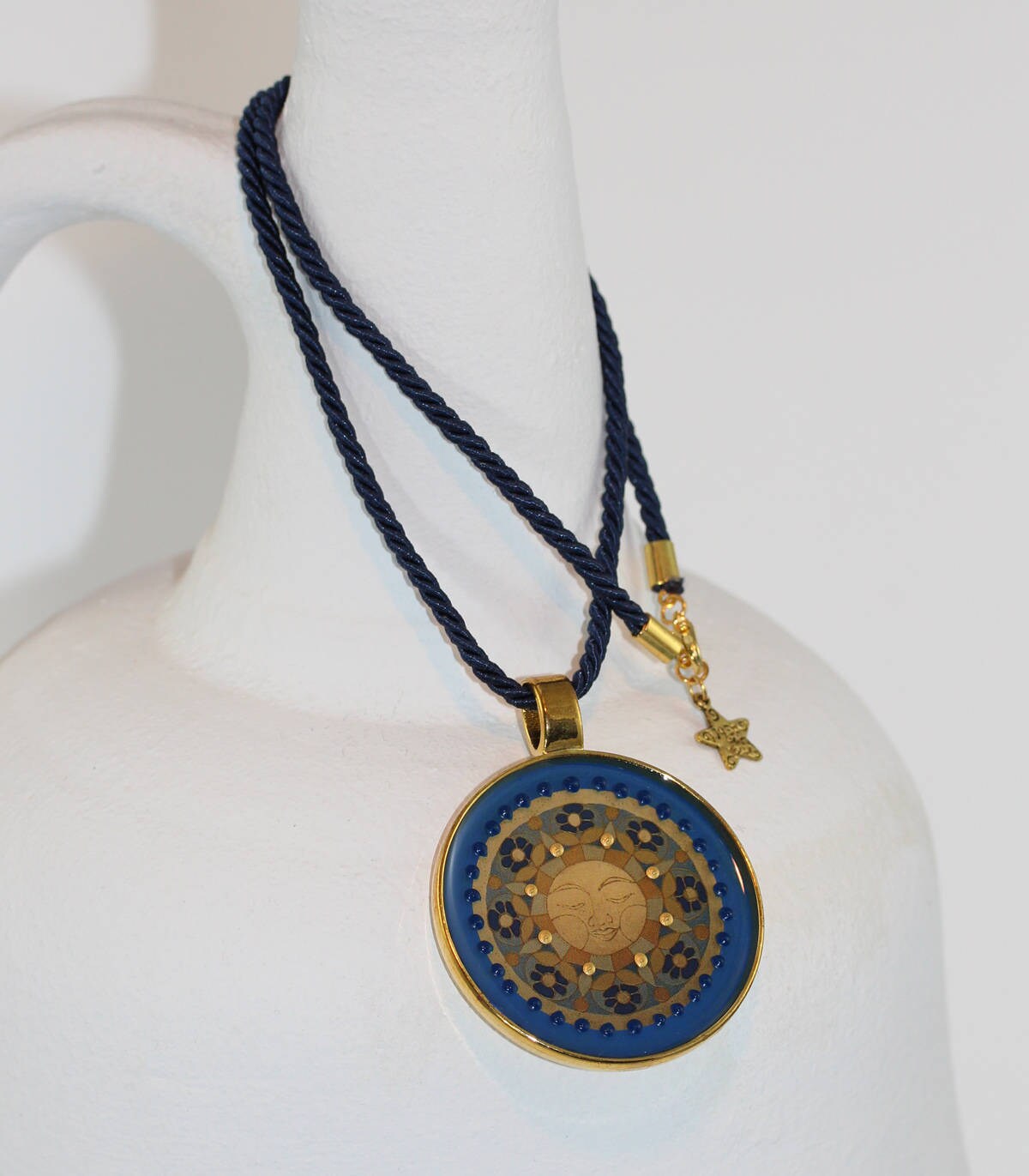Ein besonders ausdrucksstarkes Schmuckstück ist diese Halskette im Design Solsacrado mit einem Sonnen Mandala in gold und blau im Stil der Maya, mit einer farblich passenden weichen dunkelblauen Kordel.