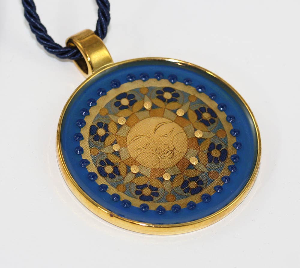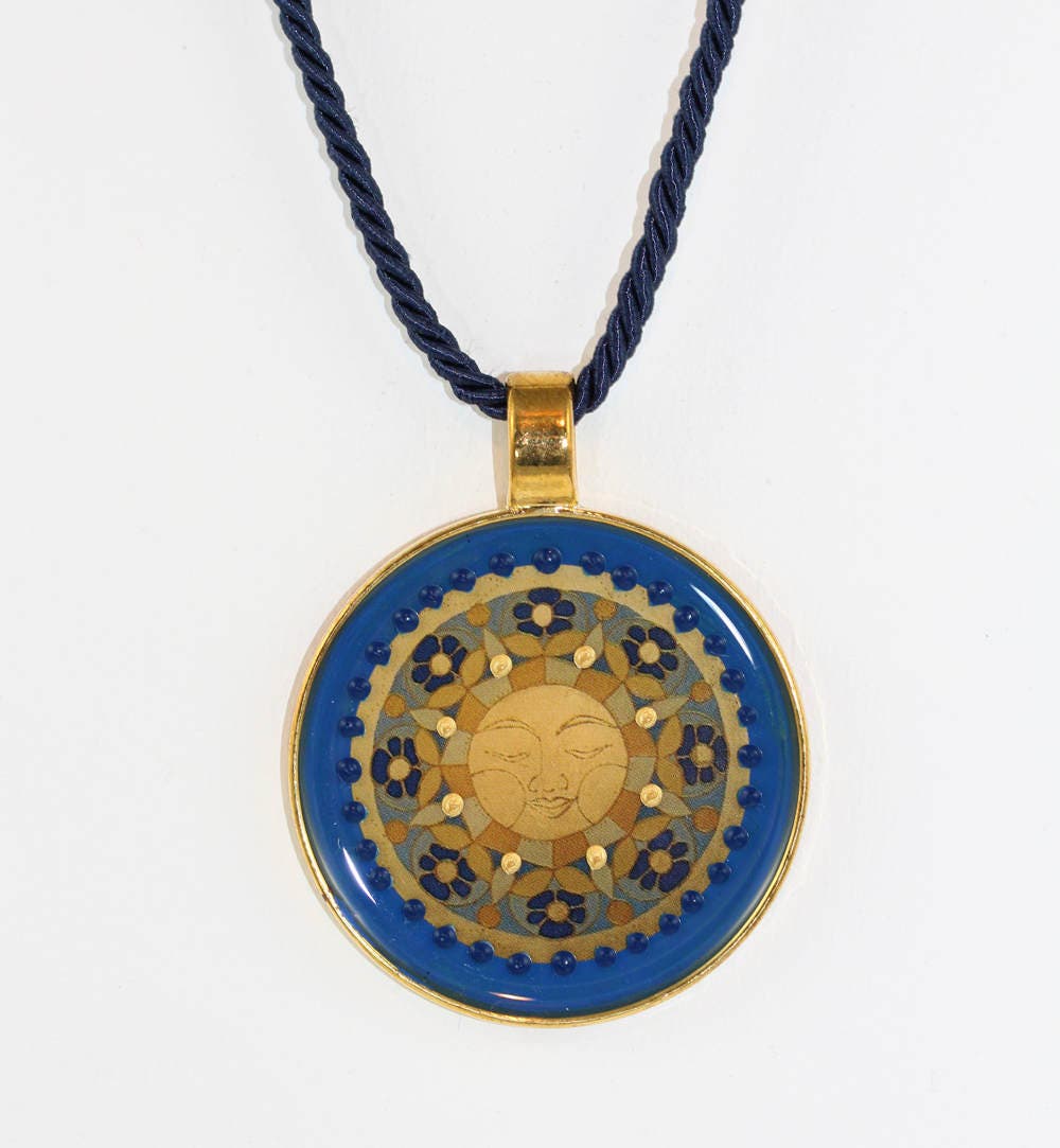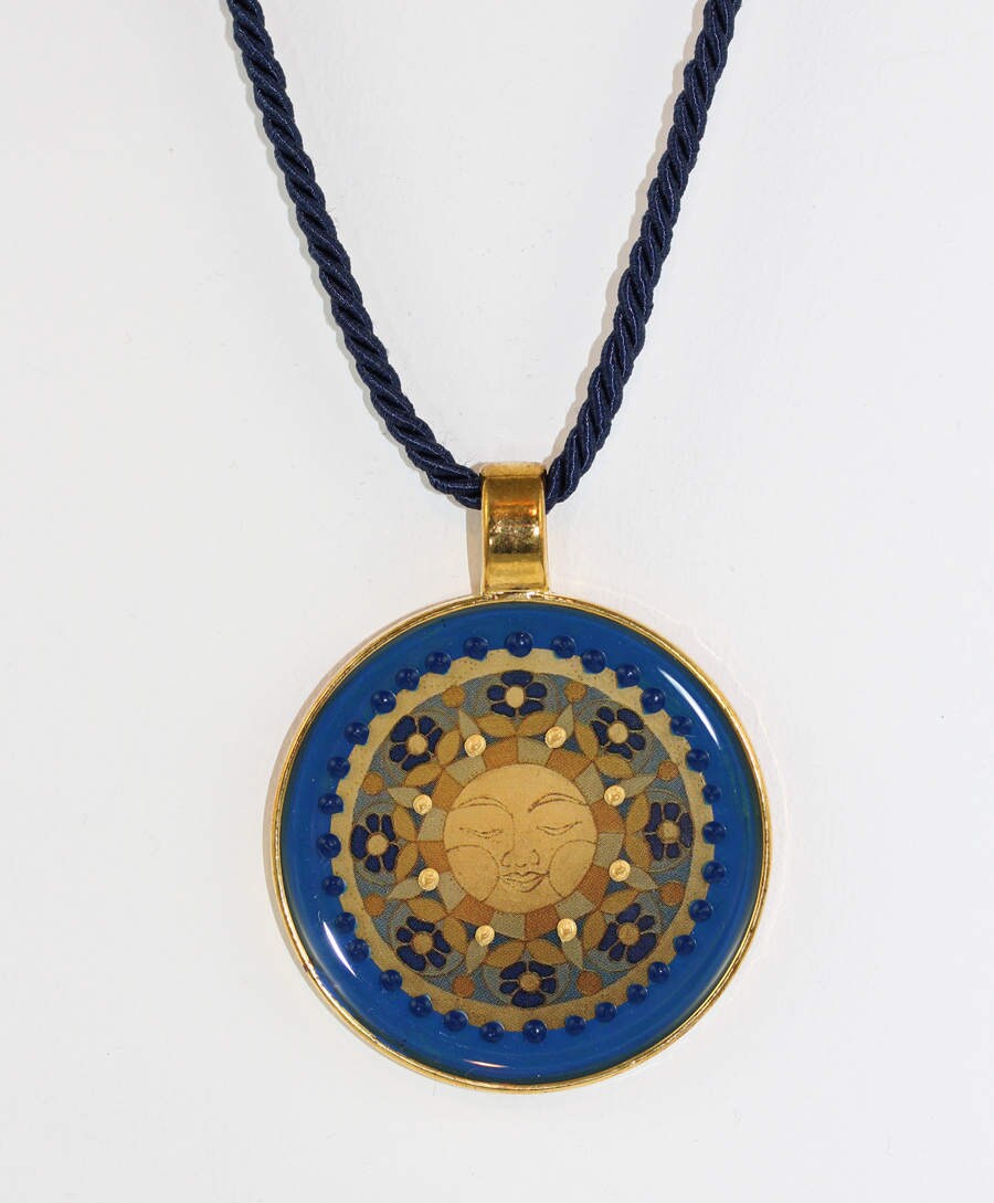 Die Materialien sind goldfarben legiertes Metall, Künstlerfraben, Motiv unter Resinguß, Kordelkette. Der Anhänger hat einen Durchmesser von 5 cm, die Kette ist 50 cm lang.