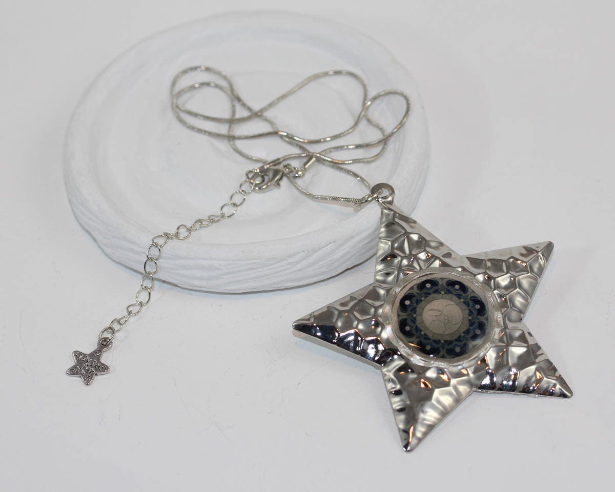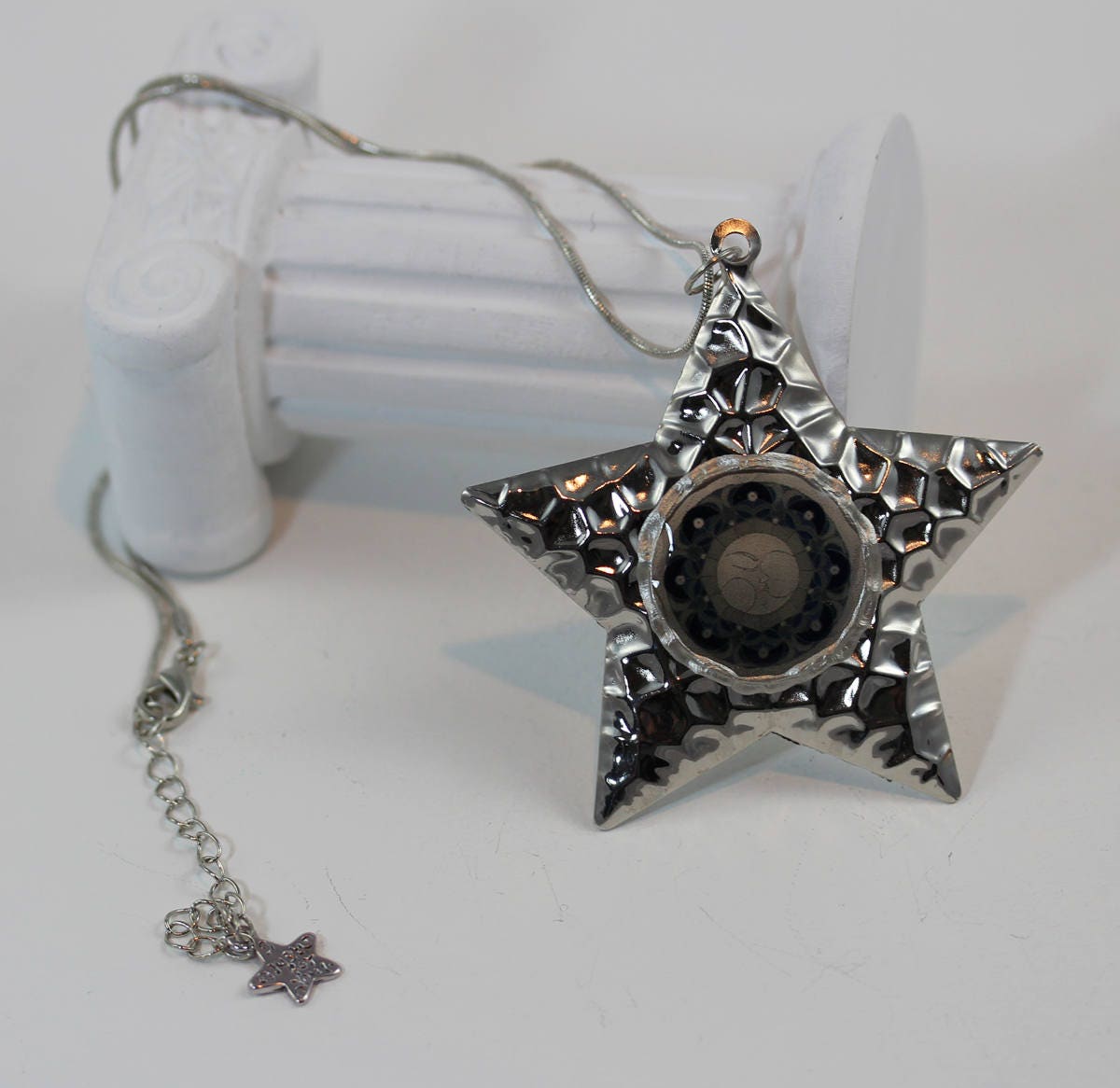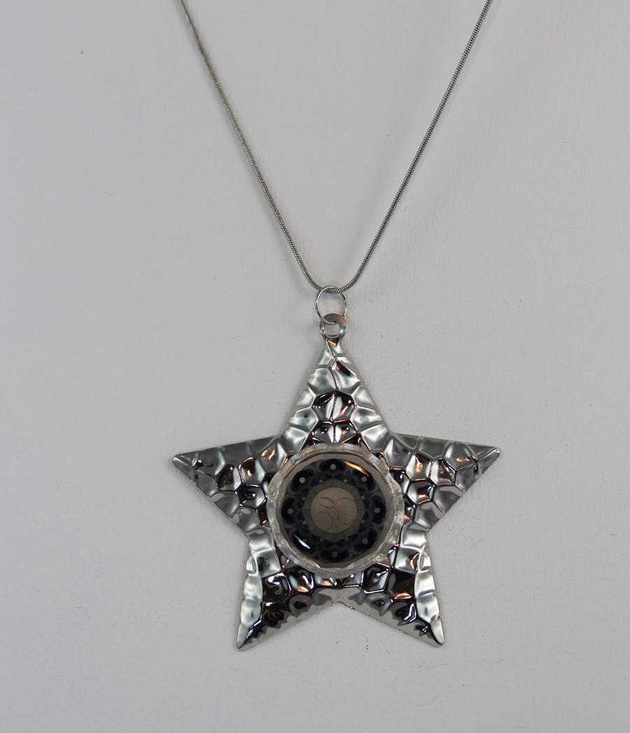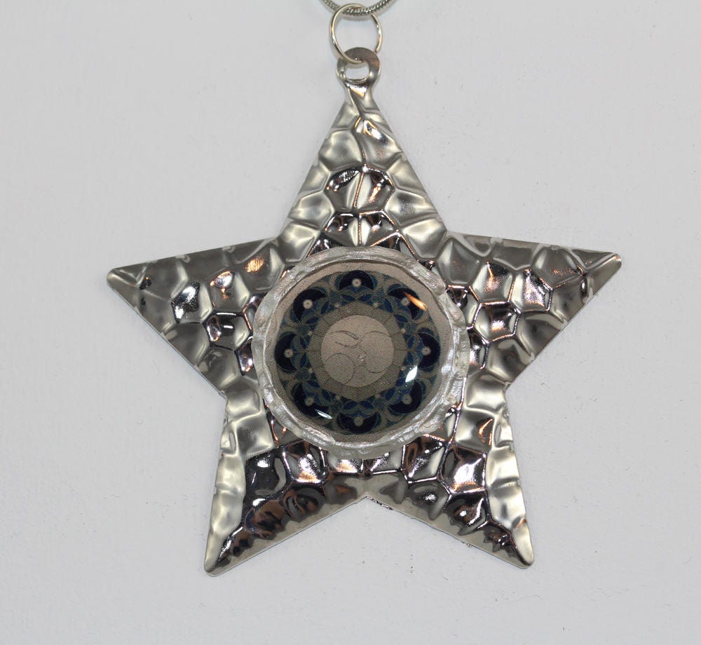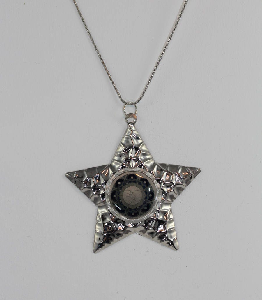 Das Mond Mandala Motiv "Lunasacrada", hier in einem eindrucksvollen silberfarbenen Stern an einer eleganten versilberten Schlangenkette.