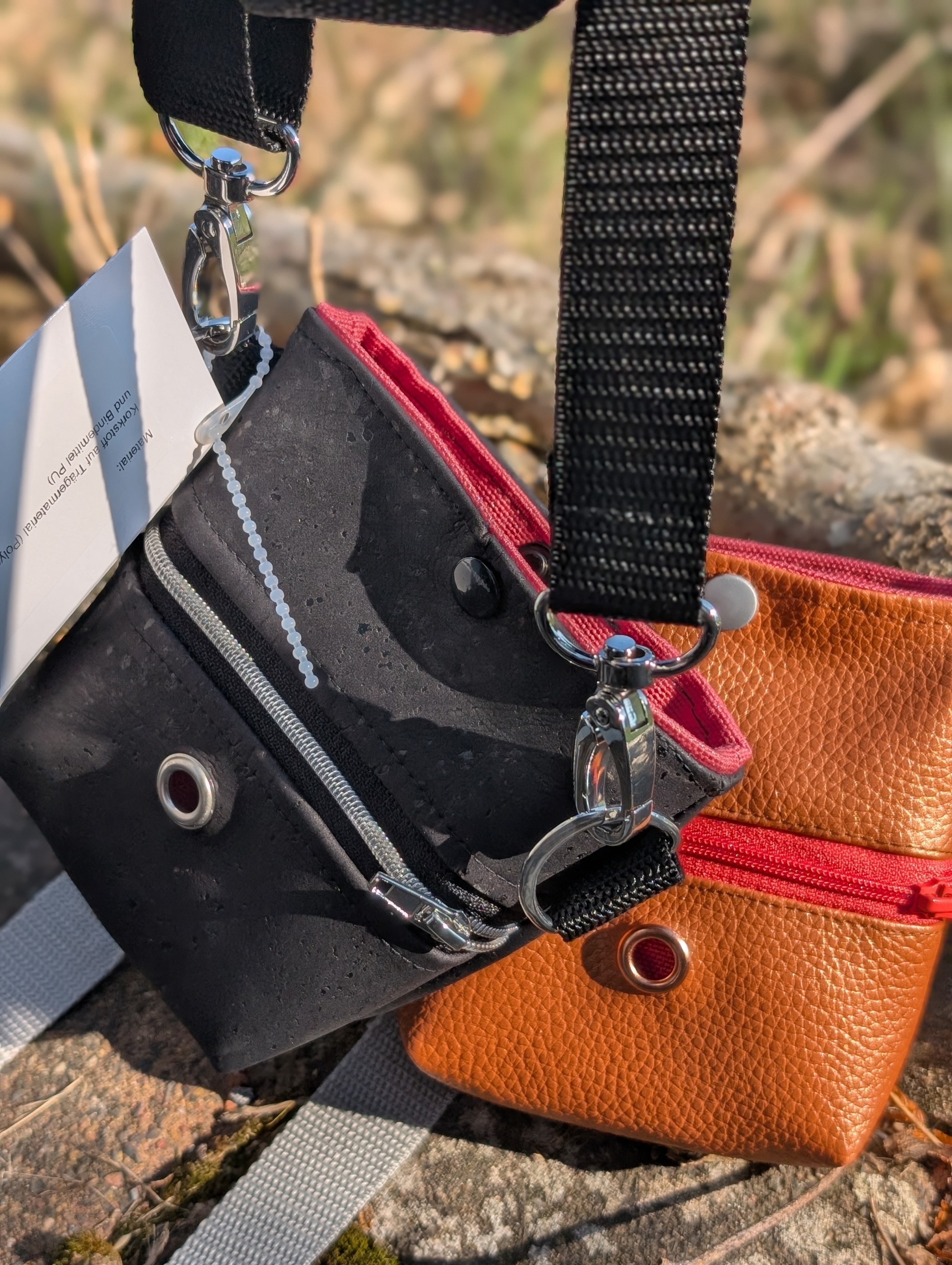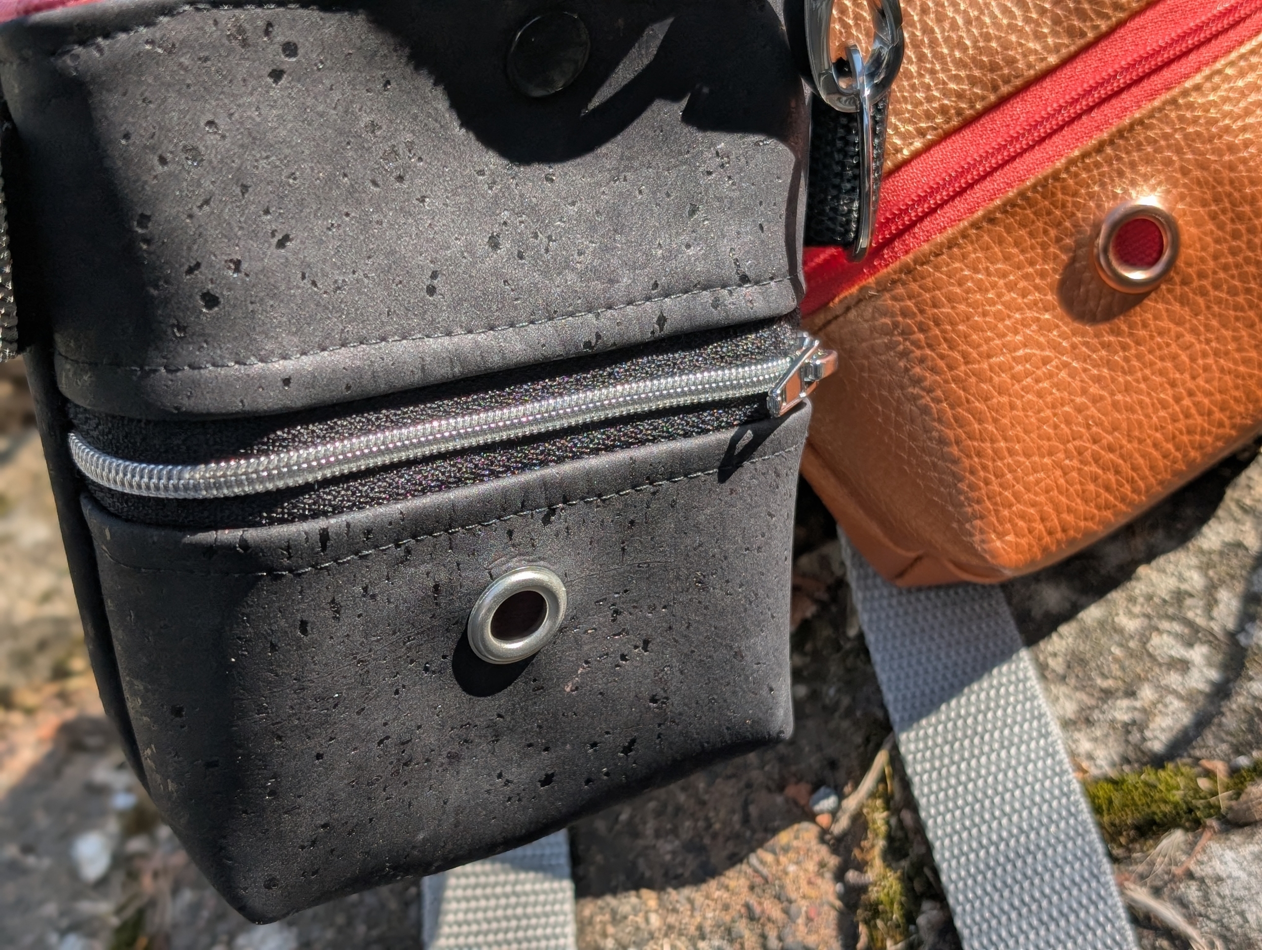 Kleine Tasche aus Kork oder Kunstleder mit einigen Varianten. Innenstoff ist ein robuster Outdoorstoff (nicht lebensmittelgeeignet für Menschen).