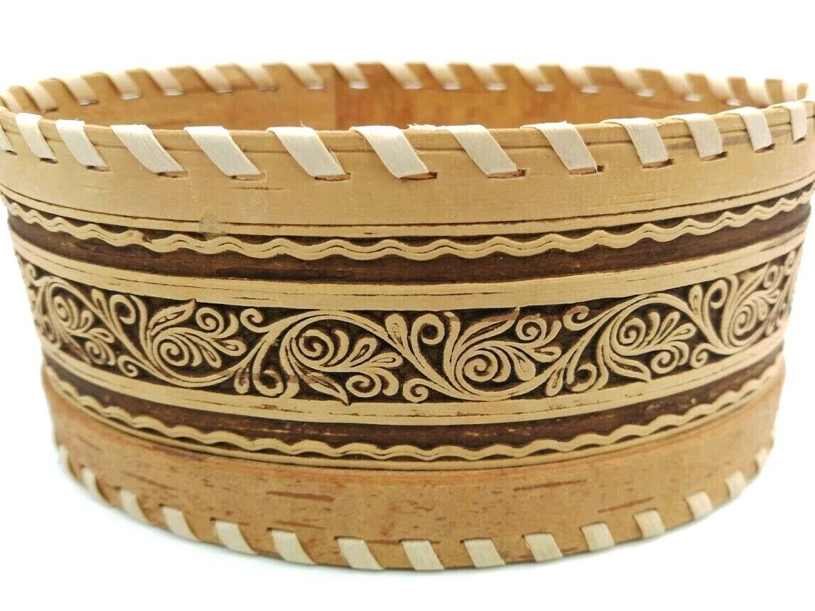 Sie kaufen eine handgearbeitete Birkenrinden-Dose mit Deckel, mit eingeprägten Ornamentenl Motiv "Eichhörnchen", neu.