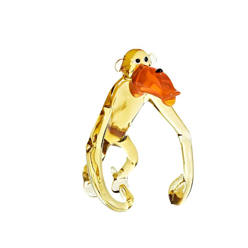 Sie kaufen 1 handgearbeitetes Glastier Affe, gelb, aus Kristallglas, ca. 6 x 15 cm, neu.