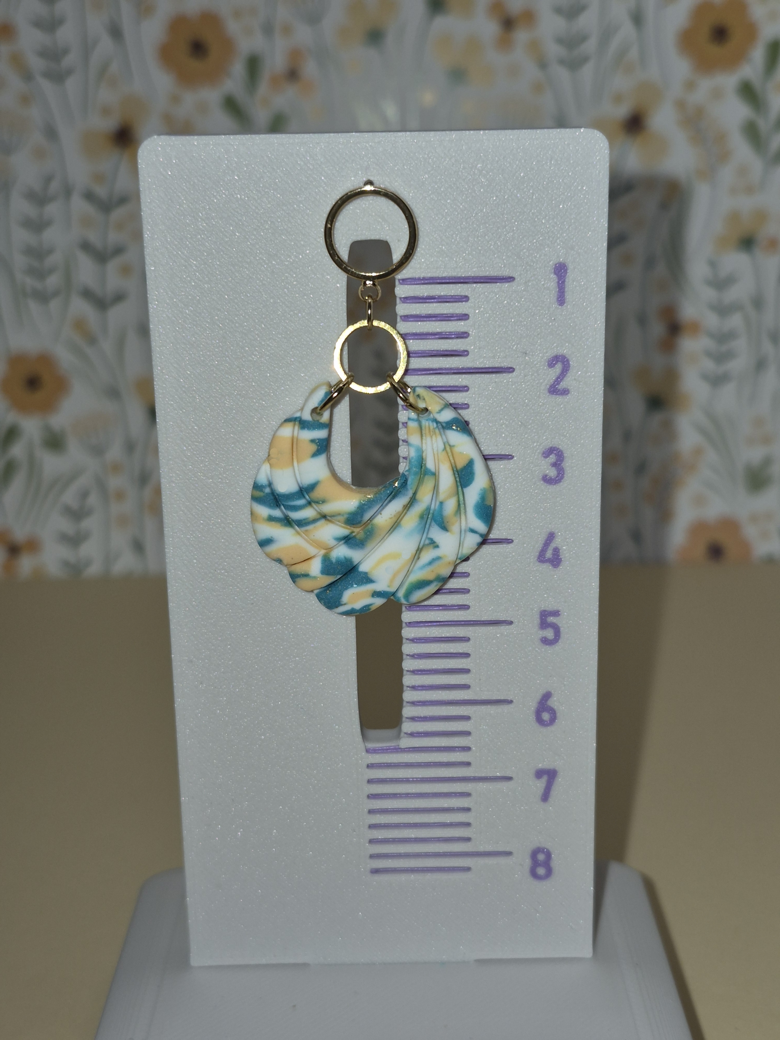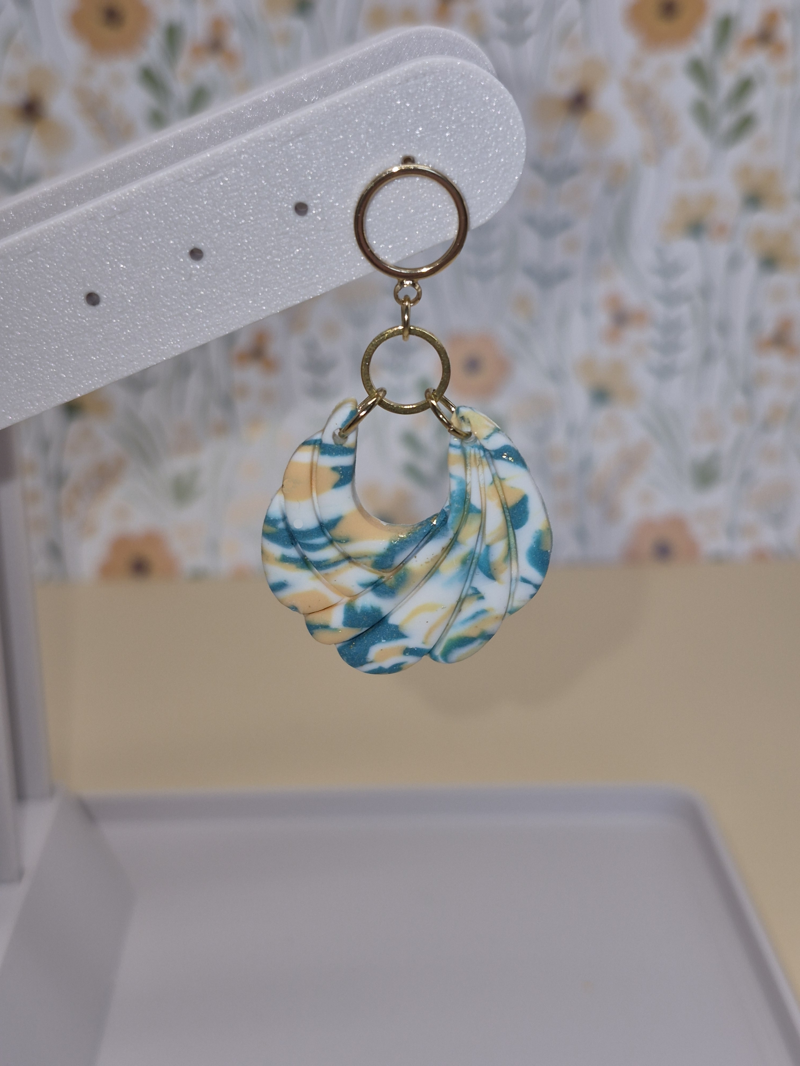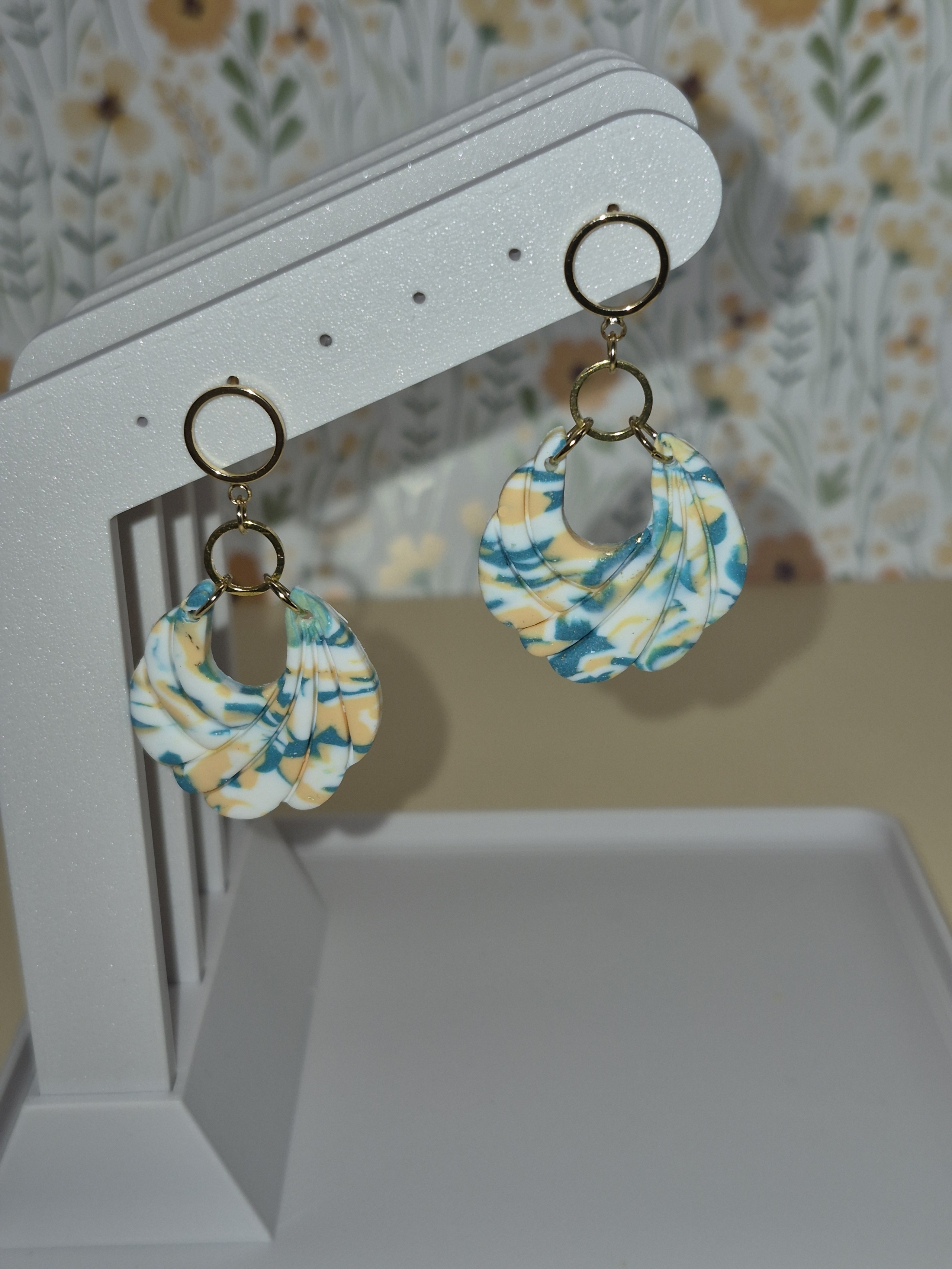 Verleihe deinem Outfit einen Hauch von Sommer und Eleganz! Diese einzigartigen Hängeohrringe kombinieren modernes, geometrisches Design mit einer organischen, muschelähnlichen Form. Die sanfte Marmorierung in Türkis-, Apricot- und Weißtönen erinnert an Wellen und Strandtage – ein echtes Unikat für alle, die das Besondere lieben.