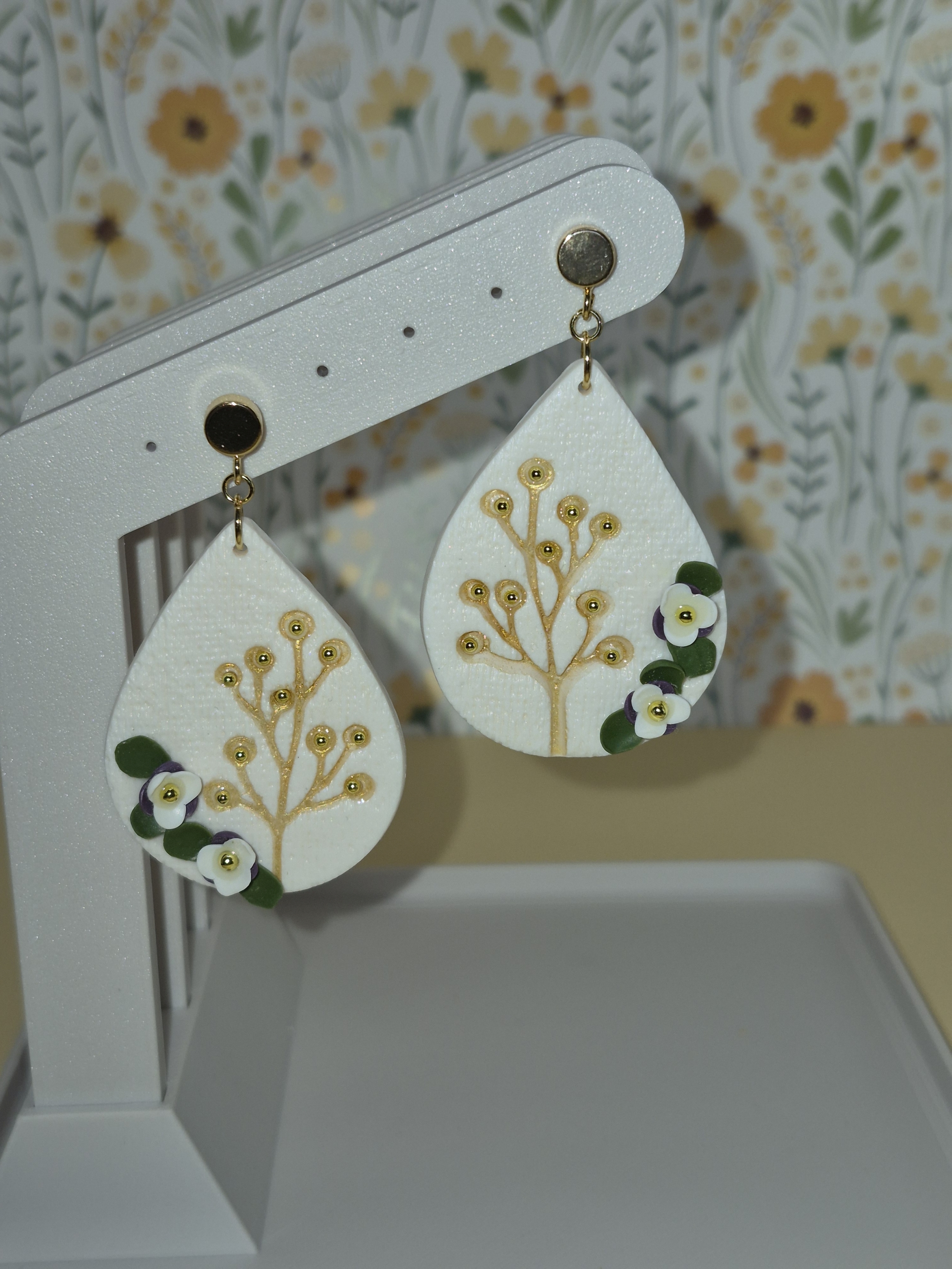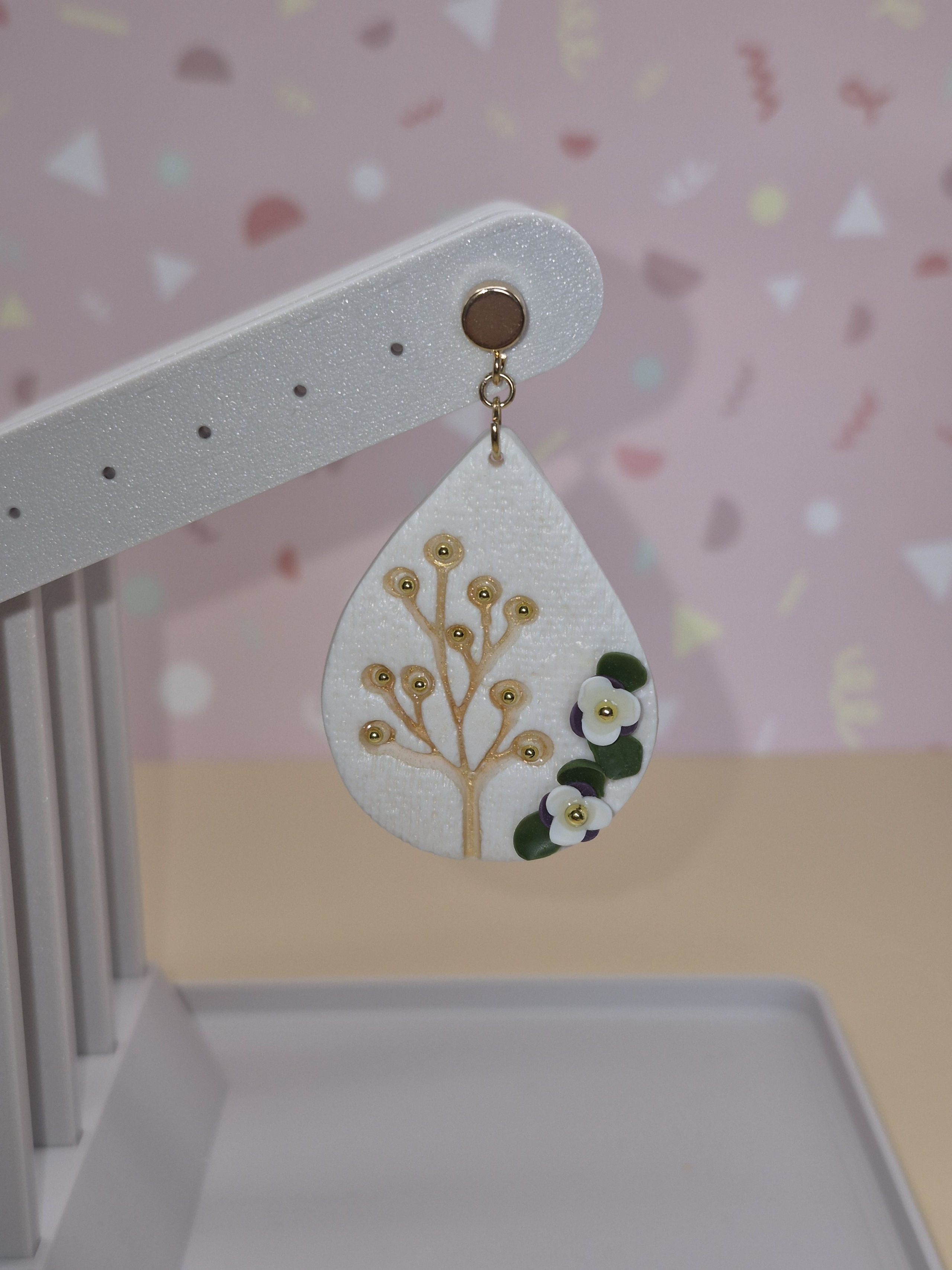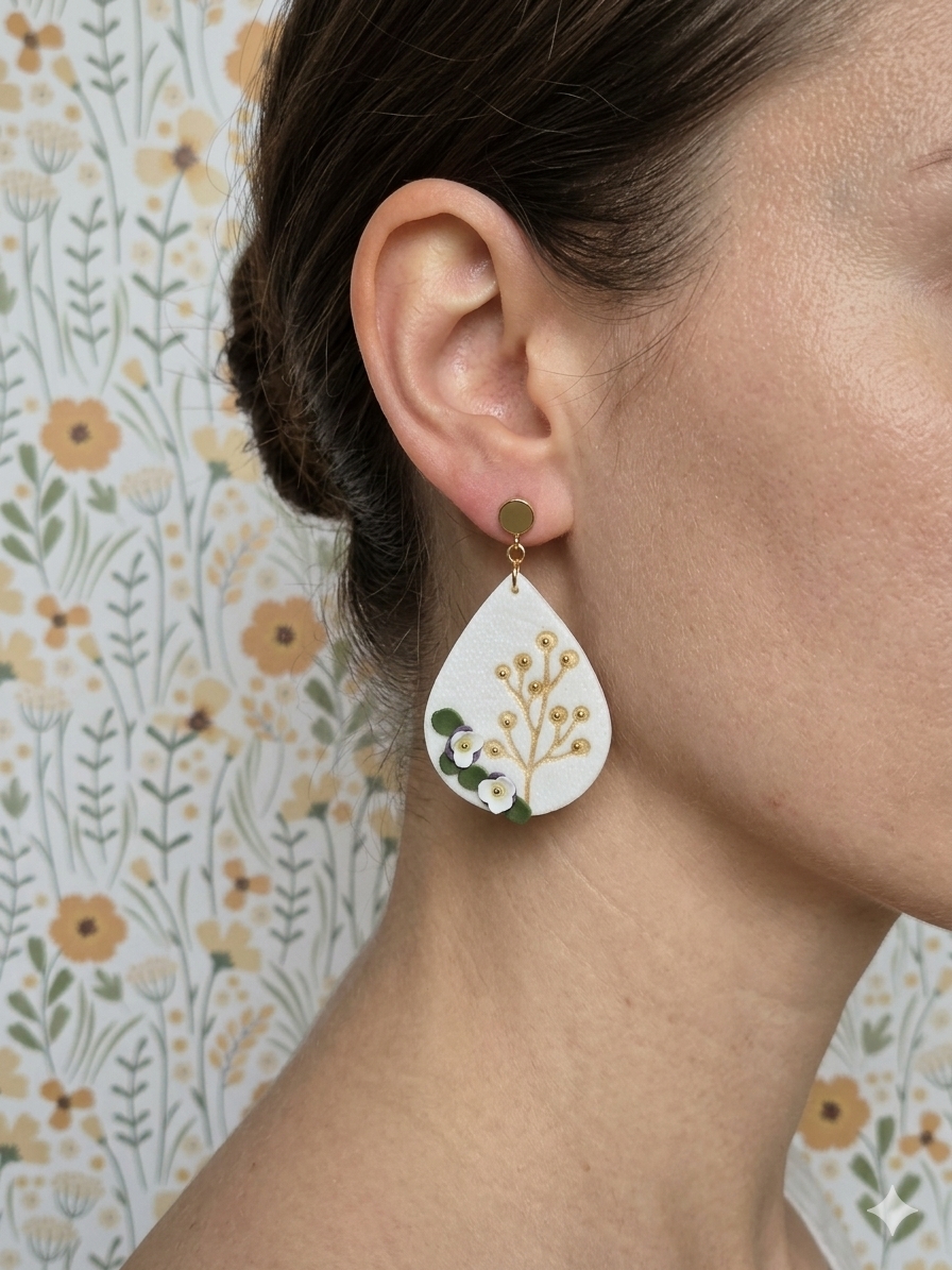 Die Ohrringe bestechen durch ihre klassische Tropfenform in einem strahlenden Weiß. Das Herzstück bildet ein filigranes Goldmotiv, das im hochwertigen Stempelverfahren appliziert wurde. Kleine, goldene Perlchen symbolisieren zarte Knospen und verleihen dem Schmuckstück eine edle Dreidimensionalität.