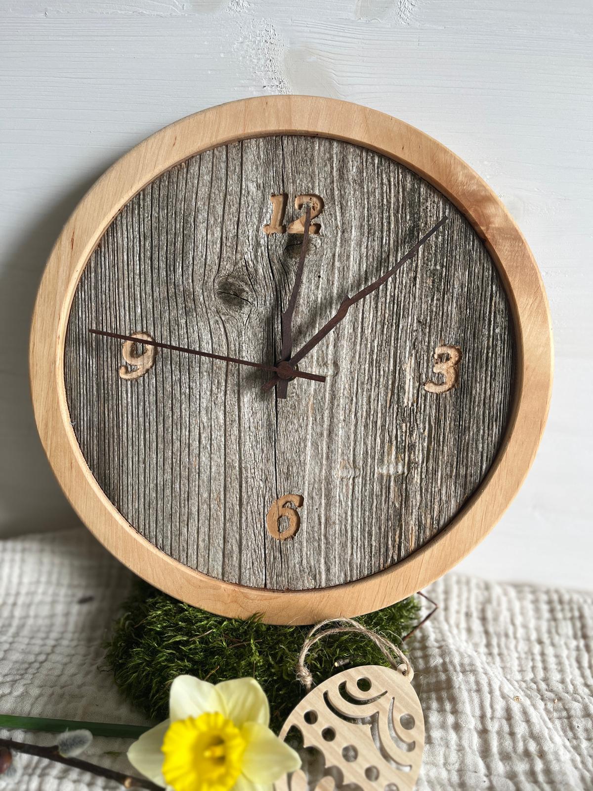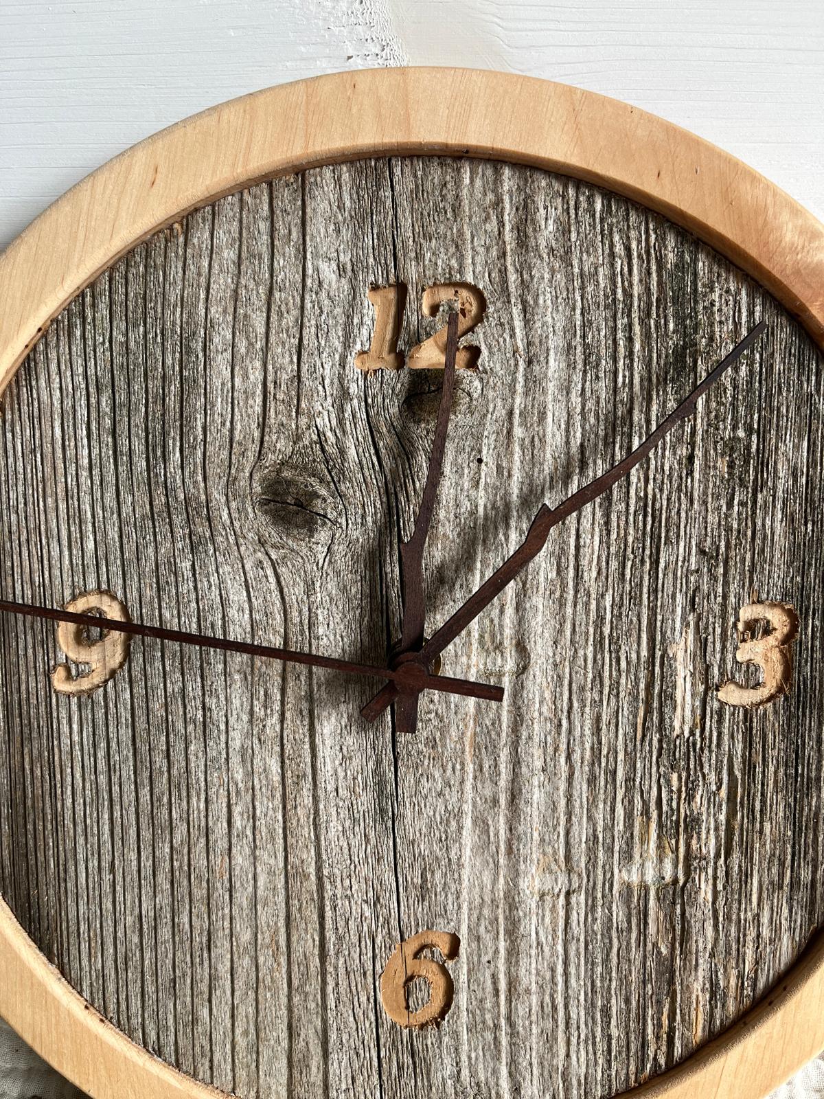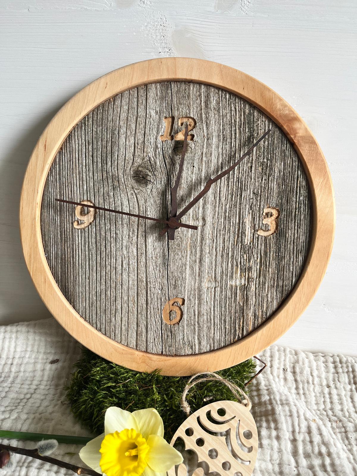 Handgefertigte Wanduhr 2 aus einem Altholzbrett mit Fichteholz Umrandung, Ø28 cm, 2 cm dick,