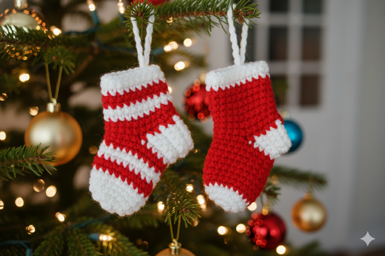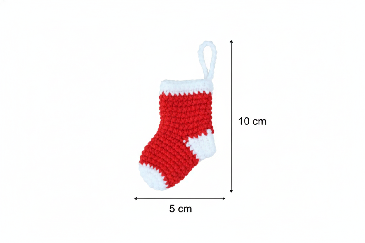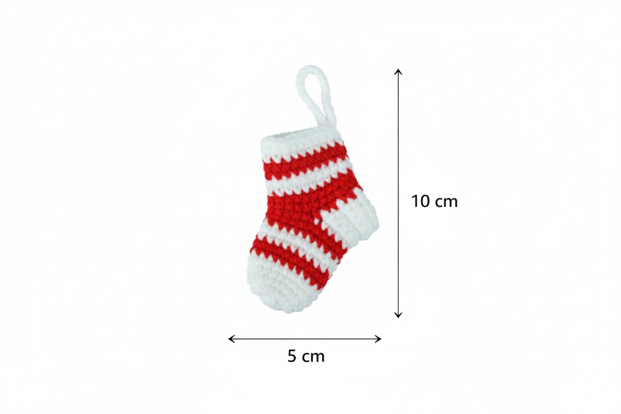 HANDARBEIT: Jedes Stück ist liebevoll gehäkelt und ein Unikat. ABMESSUNGEN:Weihnachtssocken - Kompakte Größe von 10 cm Höhe und 5 cm Breite, perfekt als dekorativer Baumschmuck . DESIGN: Traditionelles Rot und reines Weiß für eine gemütliche Weihnachtsatmosphäre.Diese kleinen