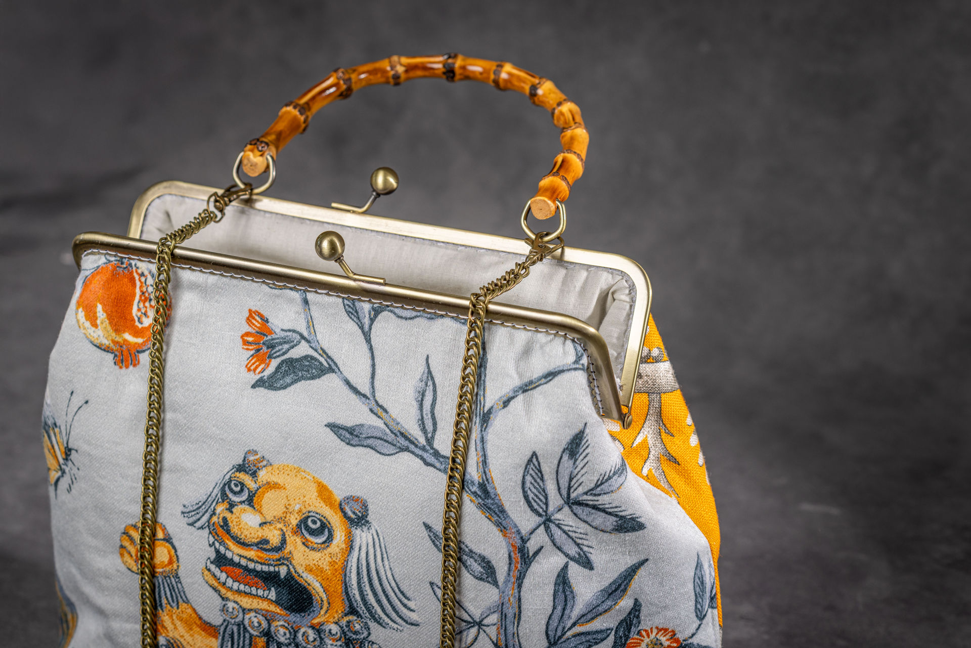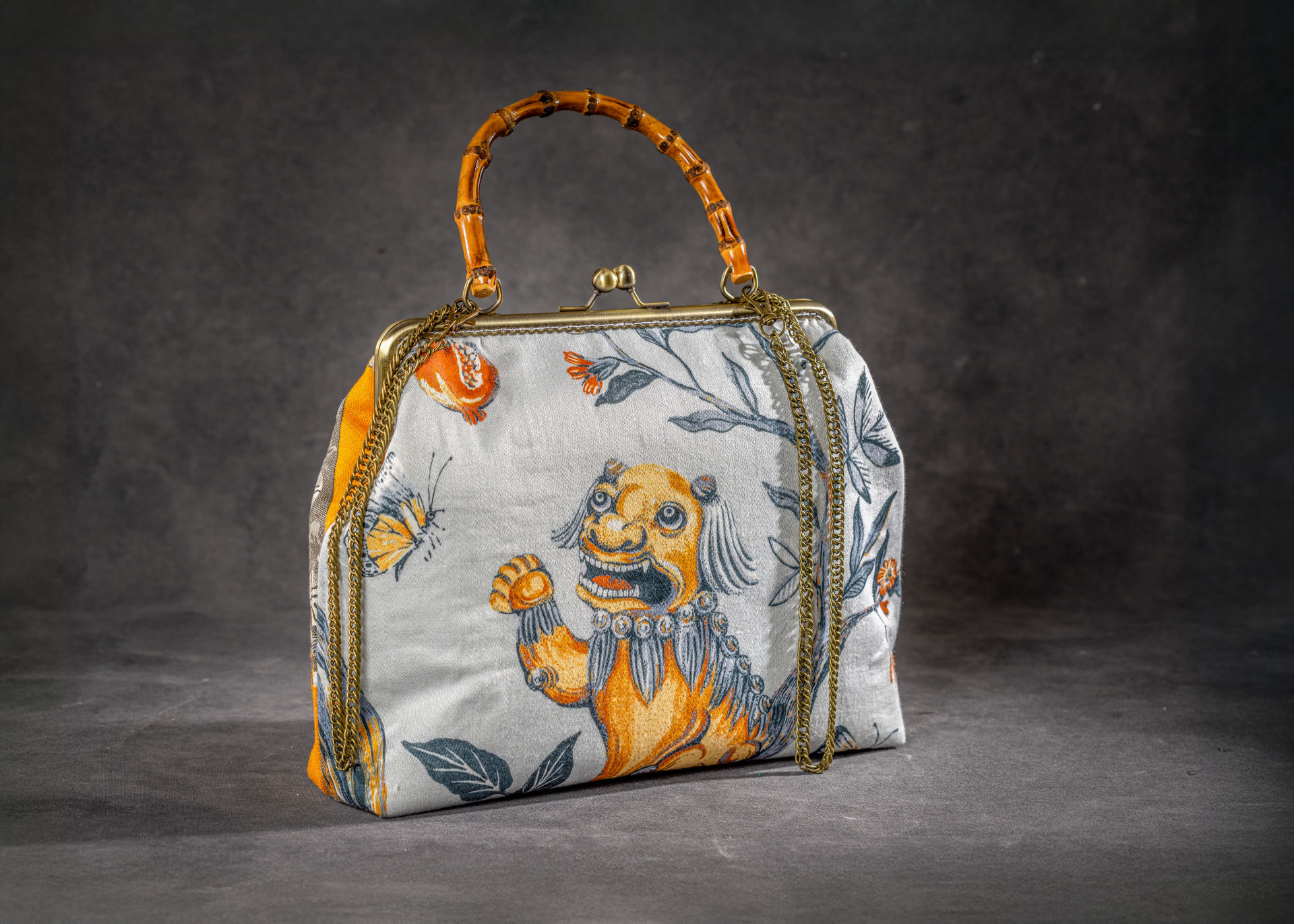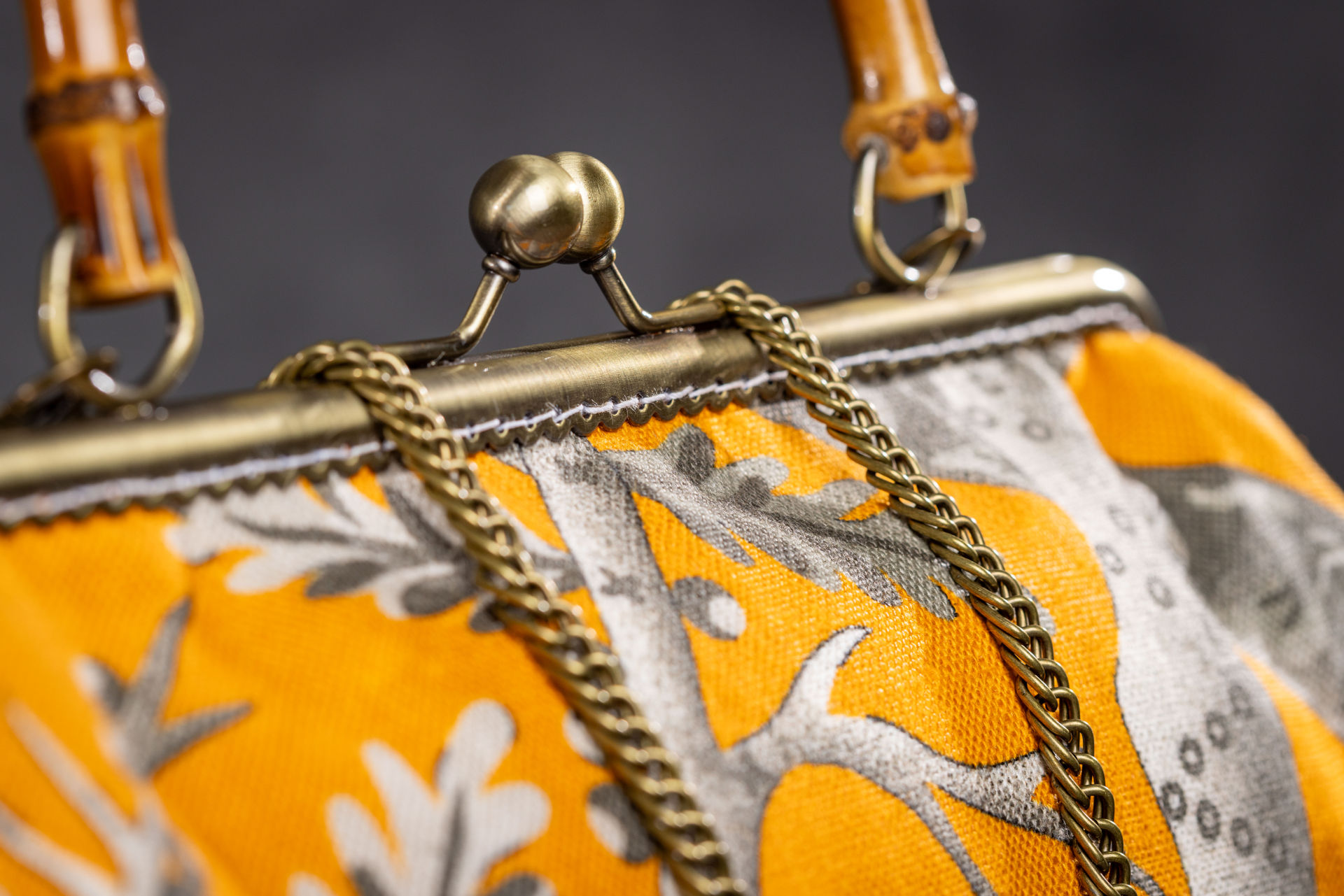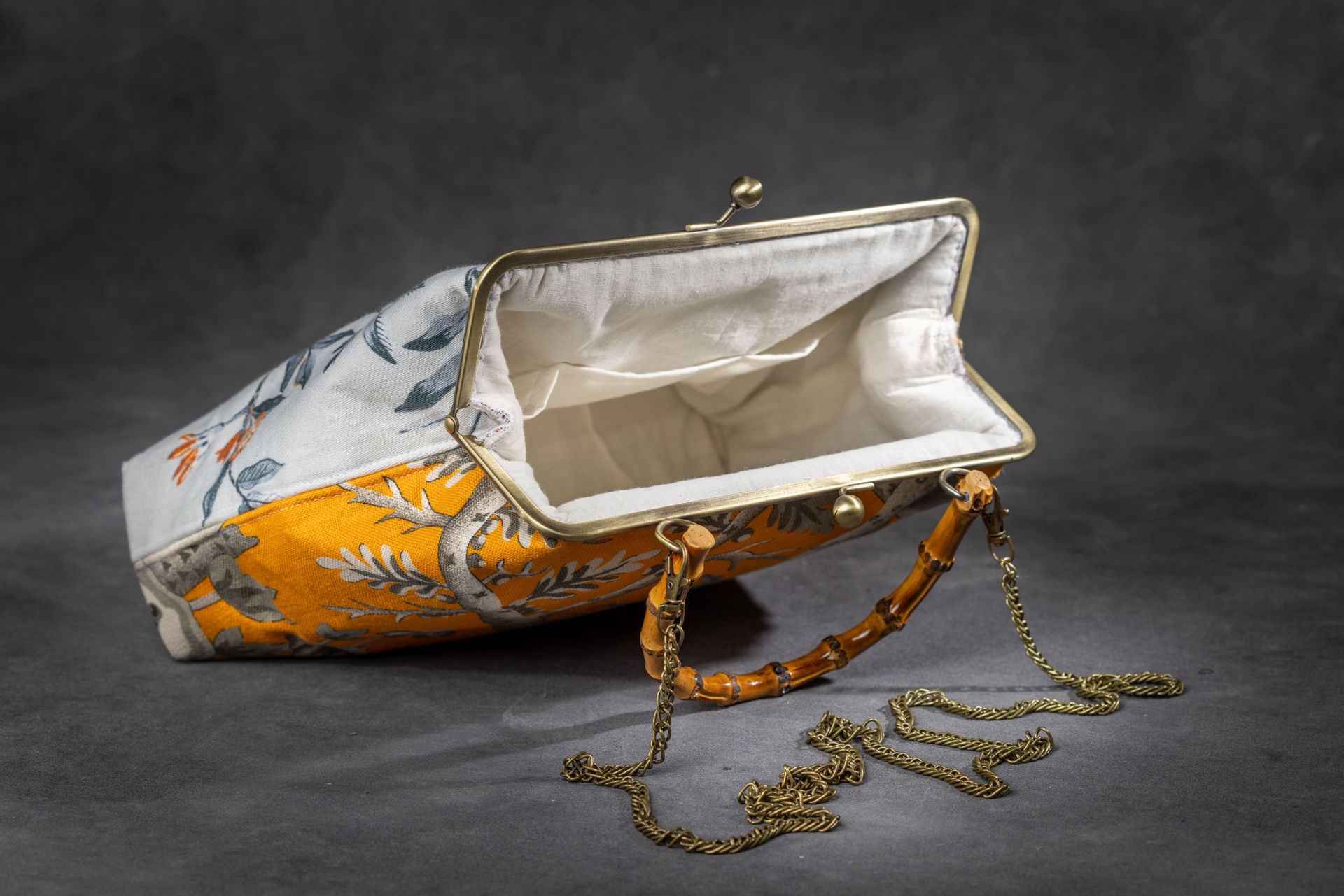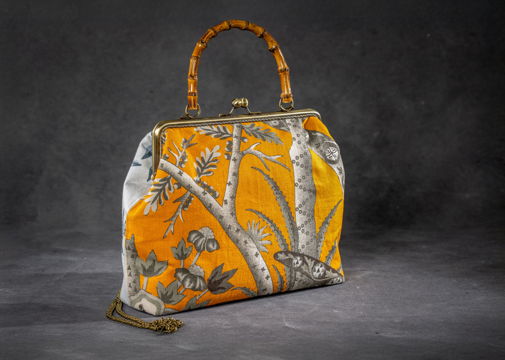Unikat | Jacquard Tasche mit Bambusgriff & goldfarbener Kette