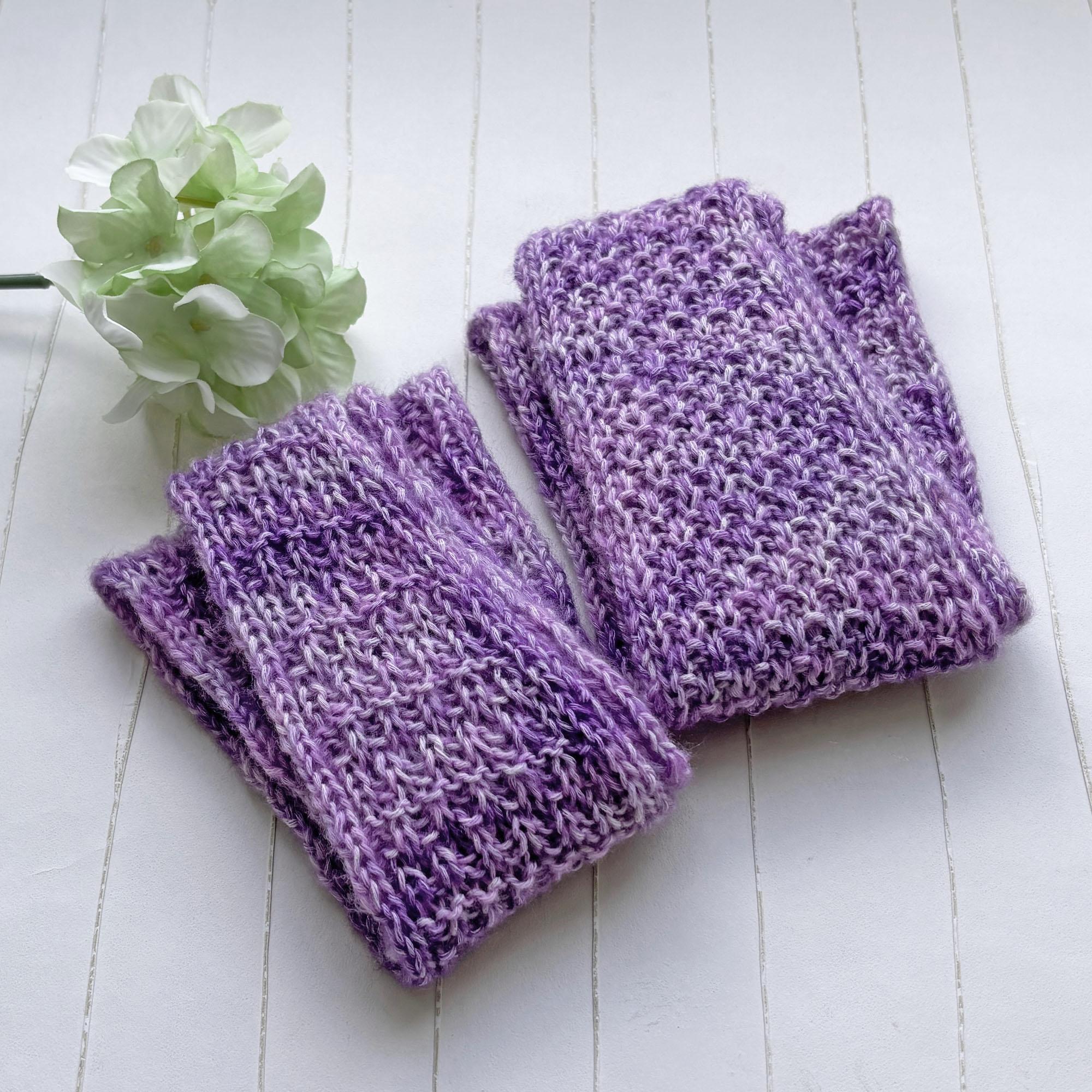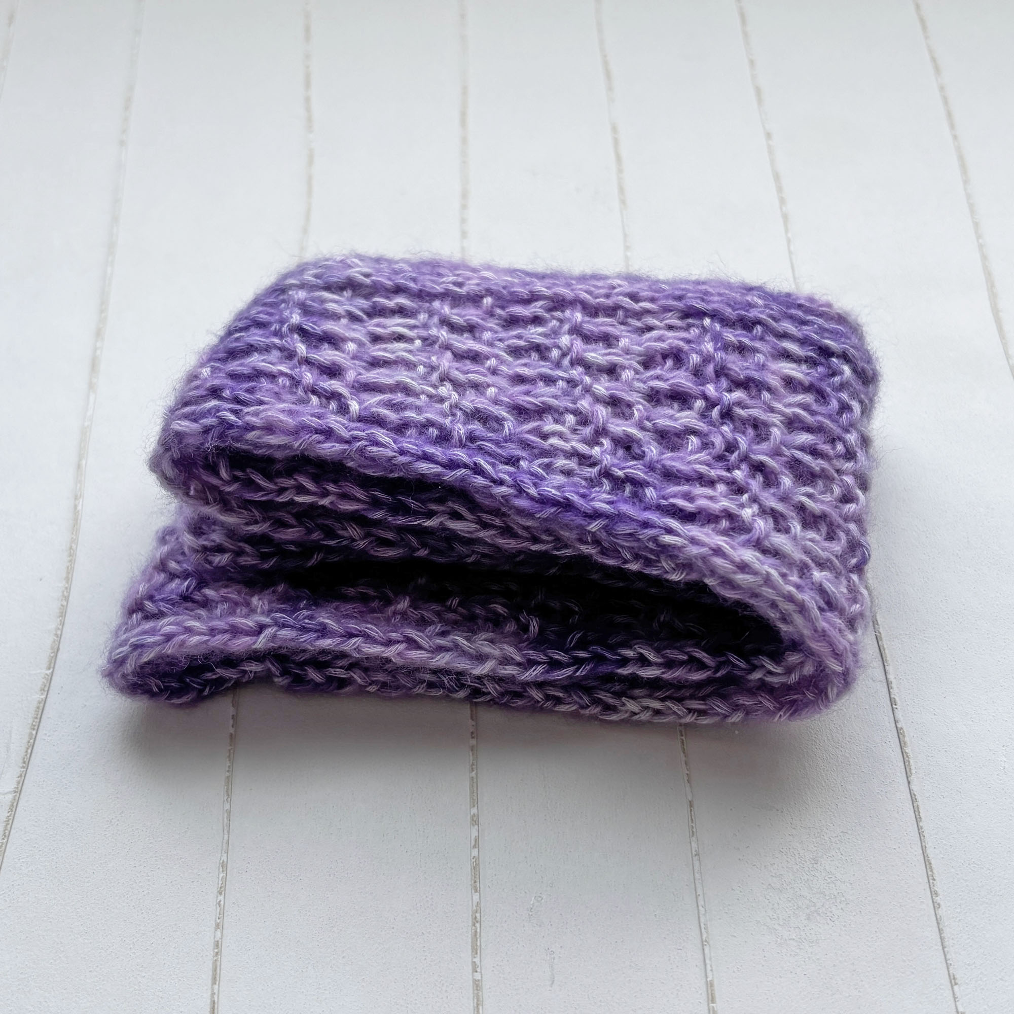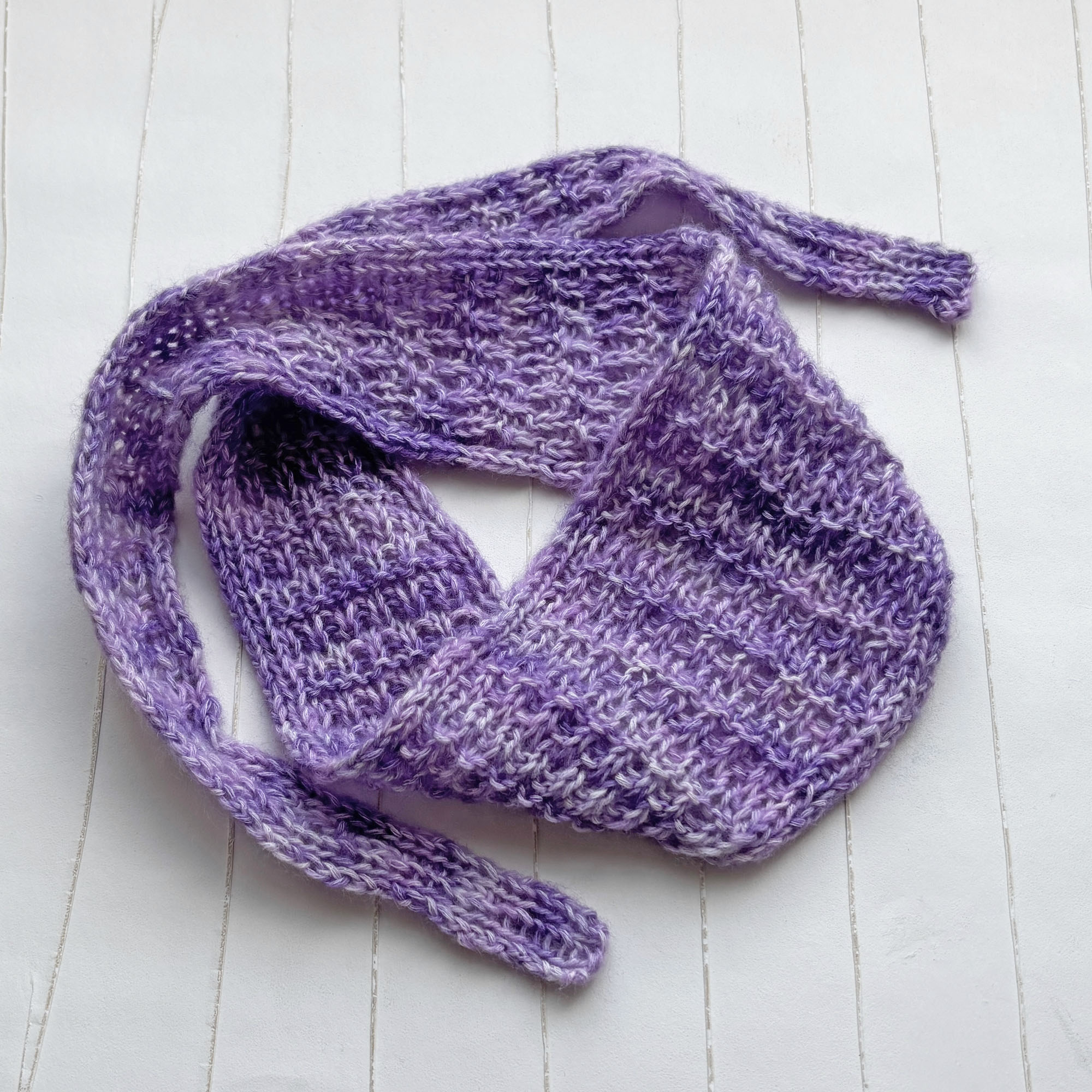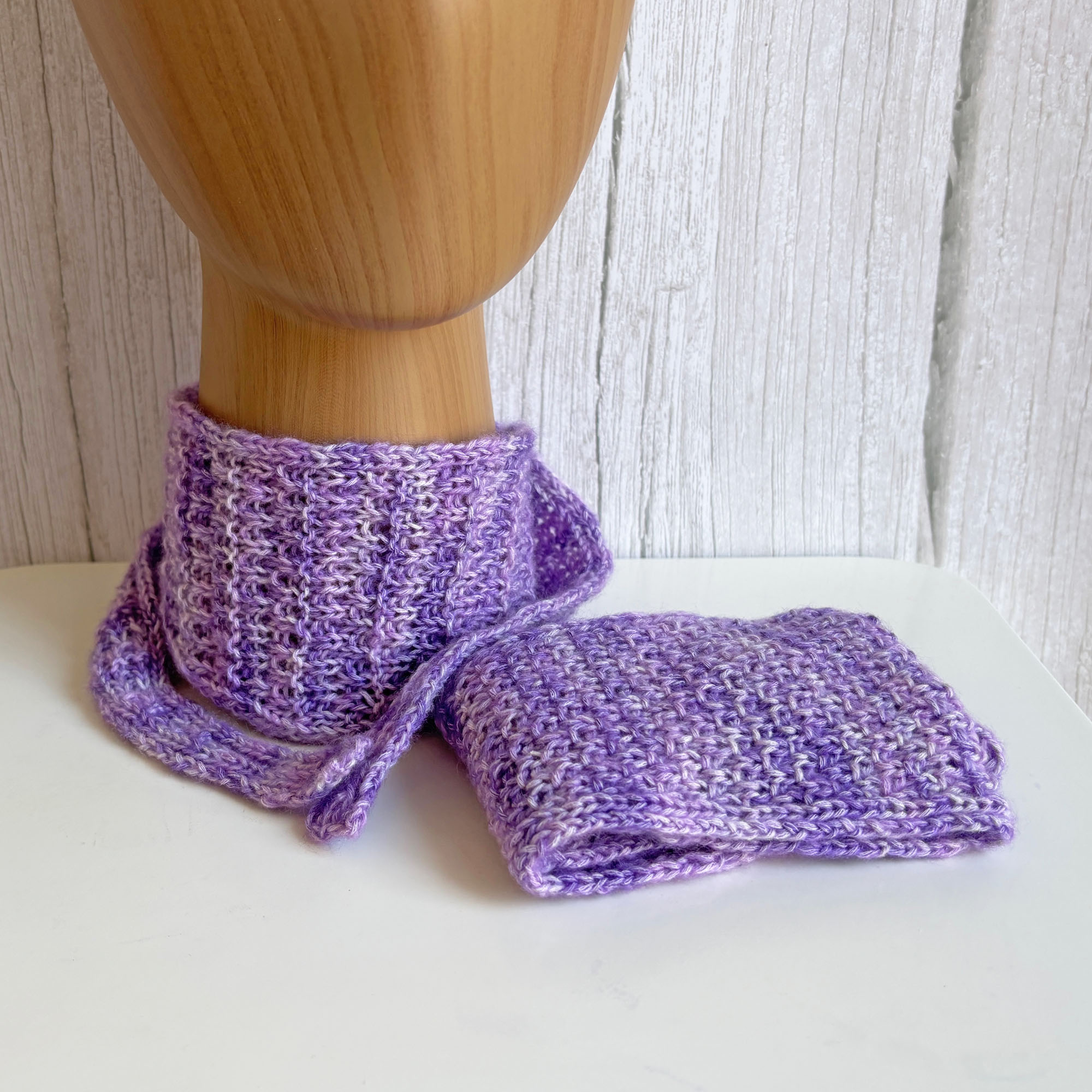 Schmales kleines Stricktuch fürs ganze Jahr aus dünnem Garn in Lila meliert.