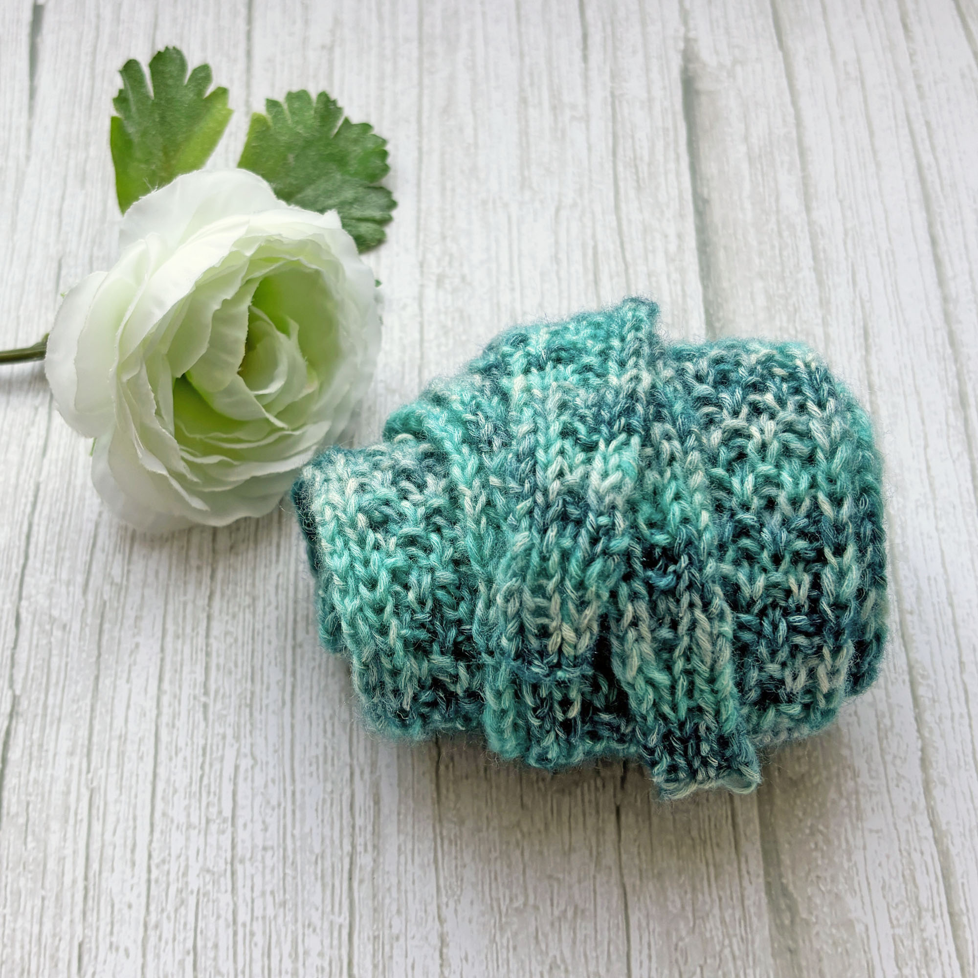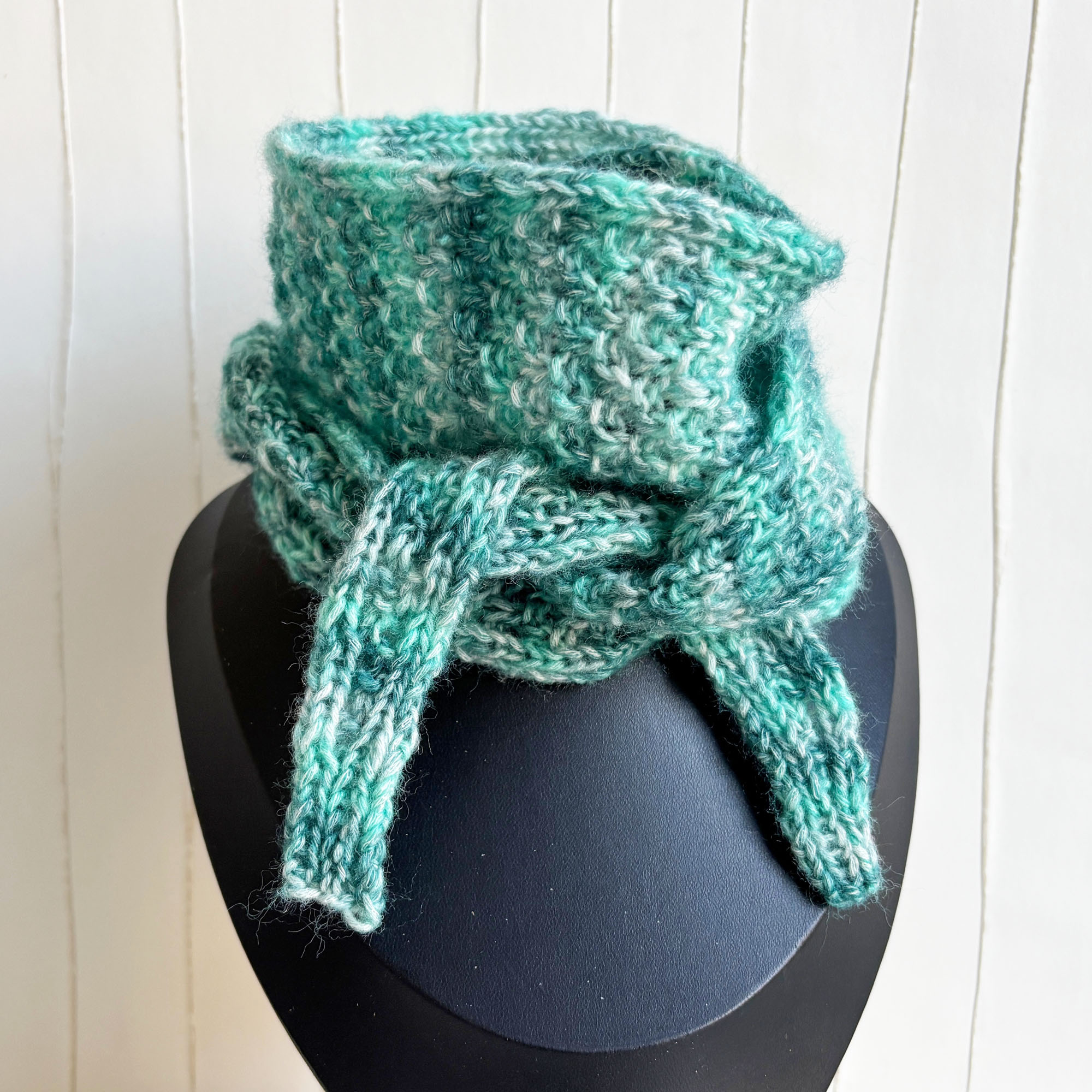 Schmales kleines Stricktuch fürs ganze Jahr aus dünnem Garn in hellem Petrol meliert.