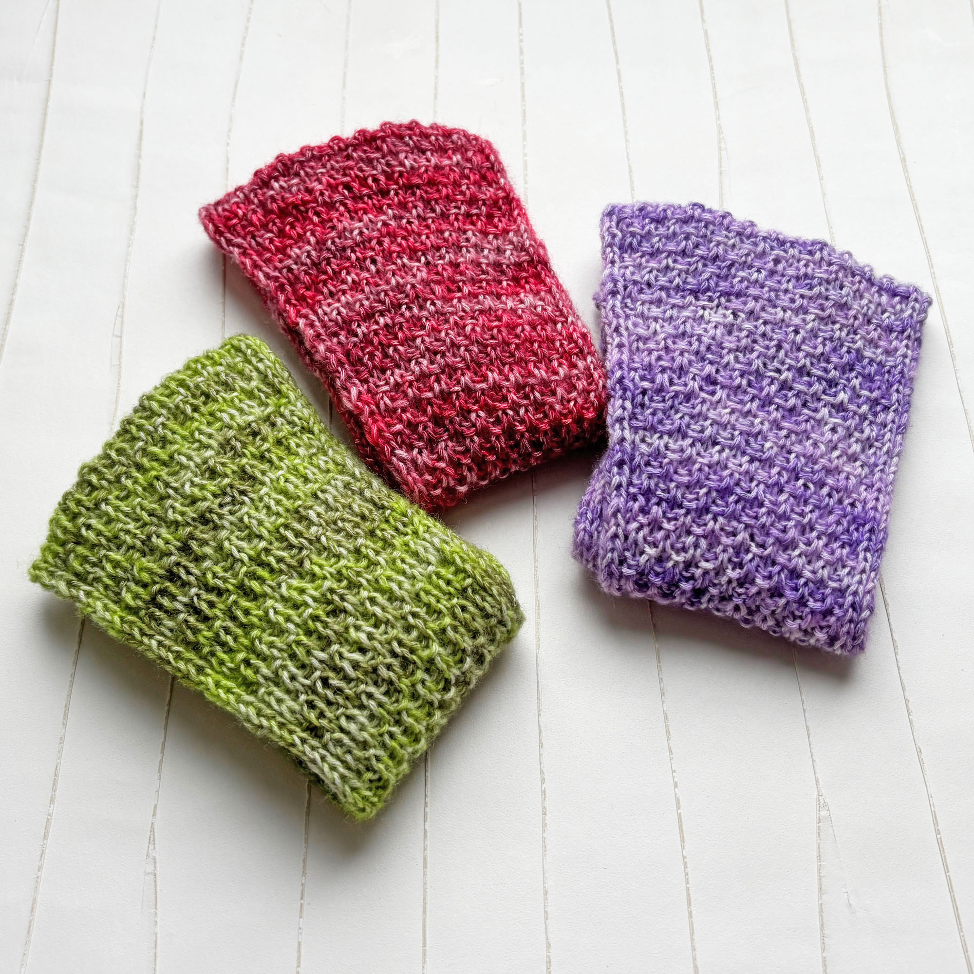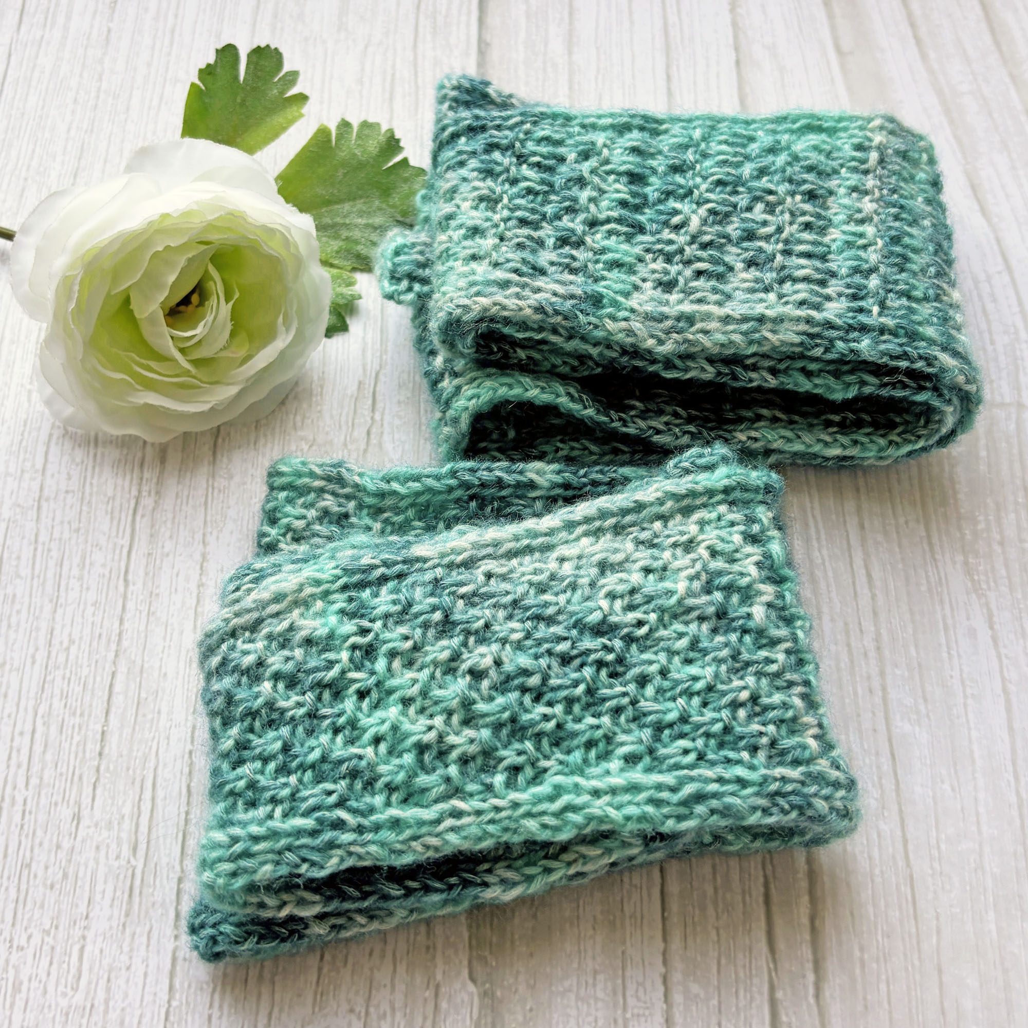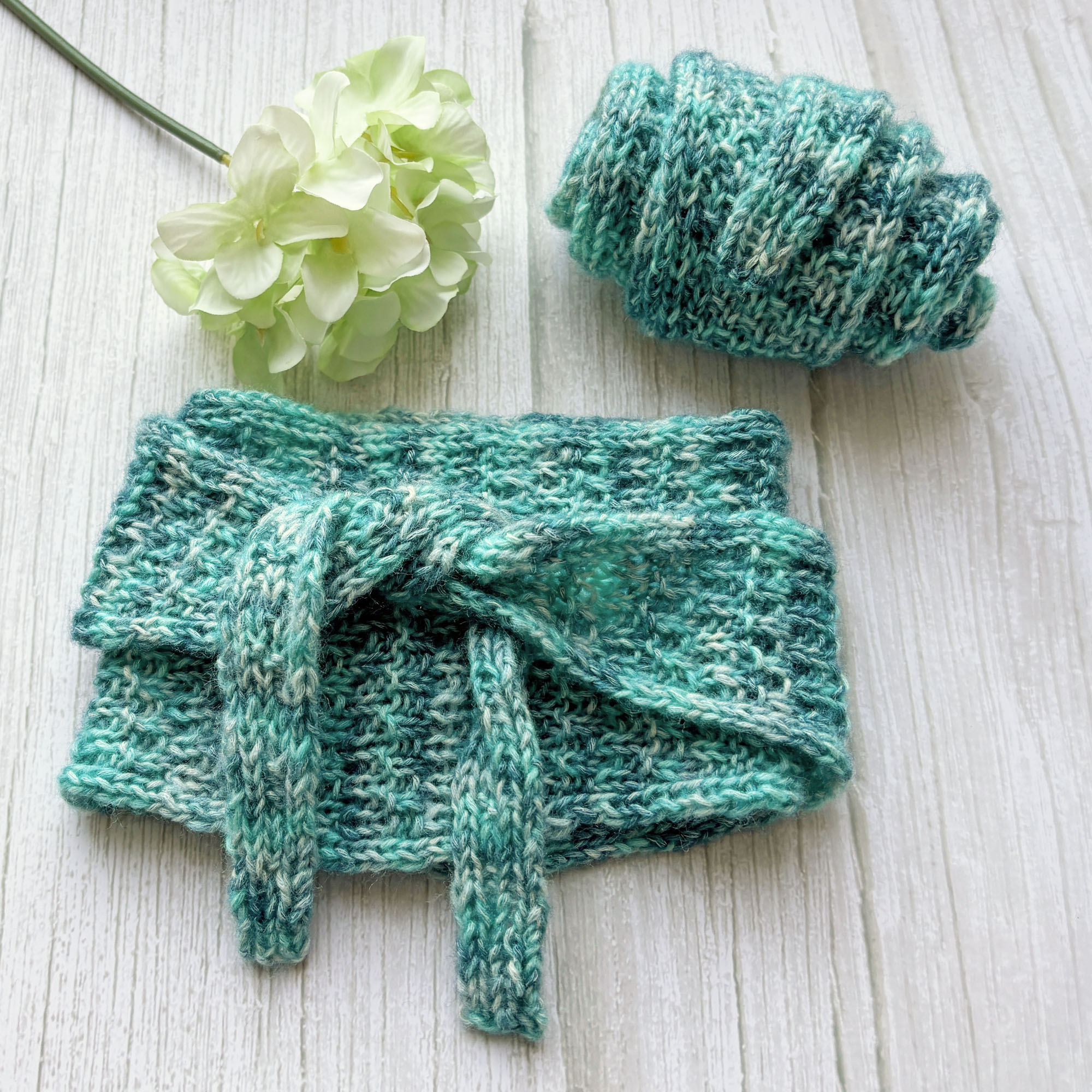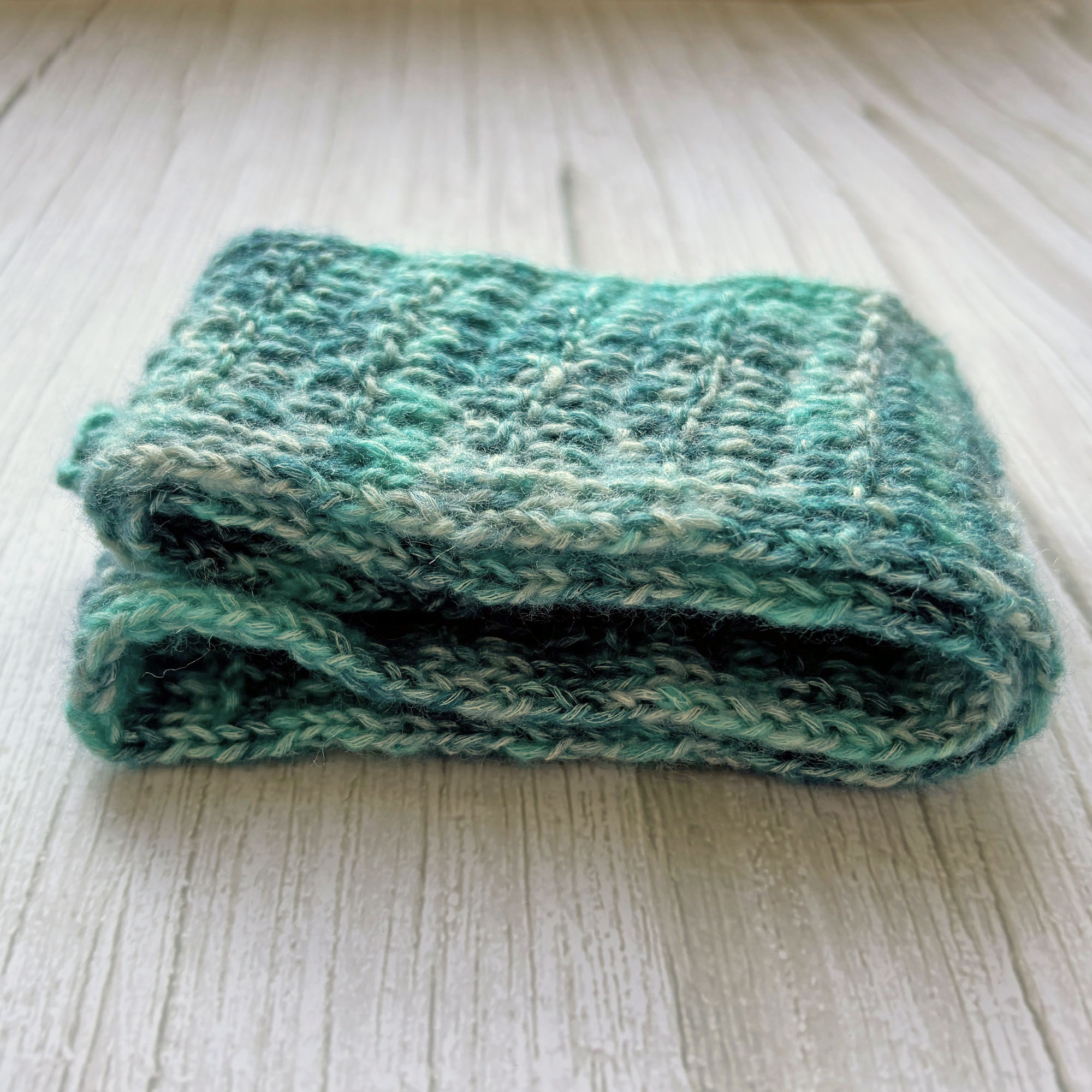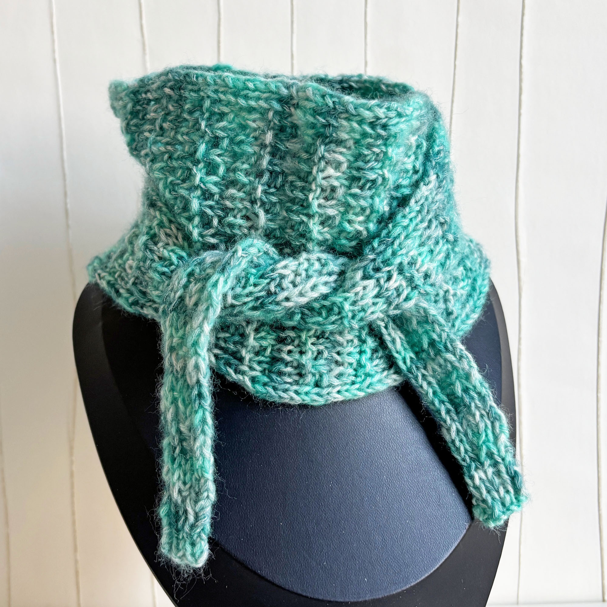 Schmales kleines Stricktuch fürs ganze Jahr aus dünnem Garn in Blau-Grün meliert.