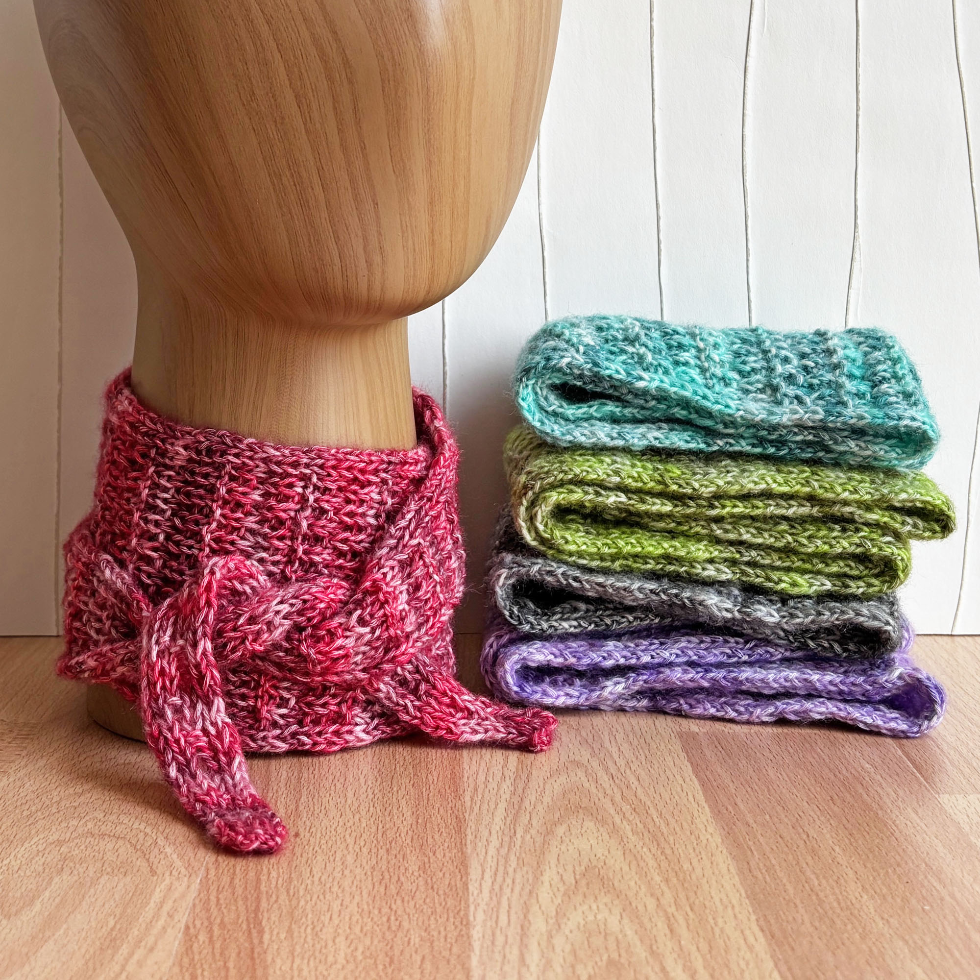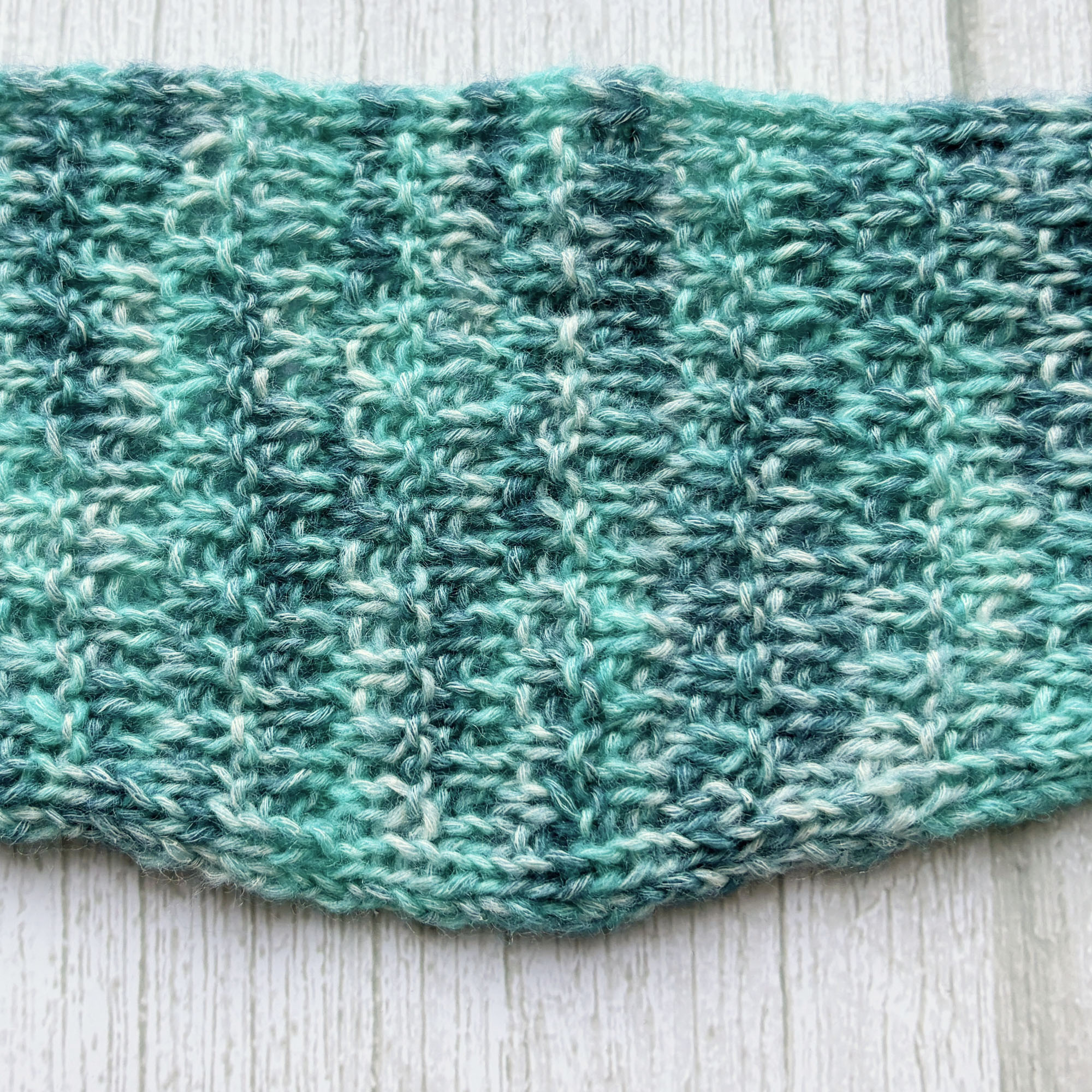 Halsnahe Form, vom Sophieschal inspiriert nach eigener Idee in Strukturmuster mit Rippenrand gestrickt.