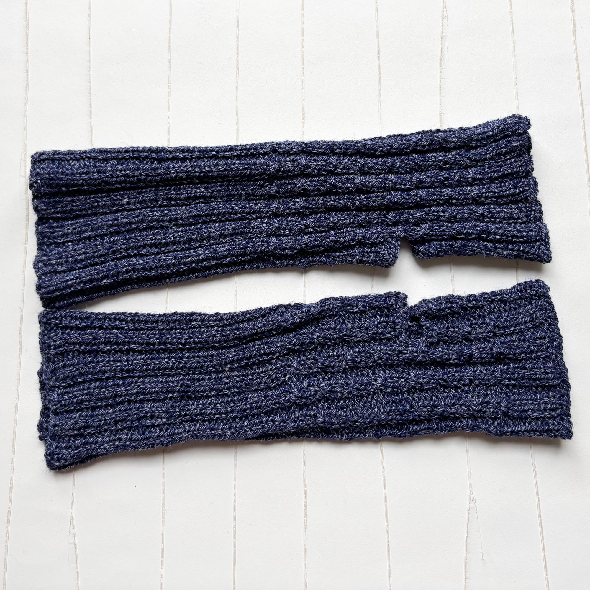Leichte Armstulpen mit Daumenloch, in Rippenmuster mit kleinen Zöpfen handgestrickt